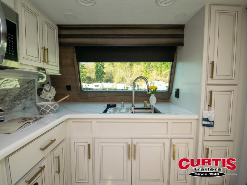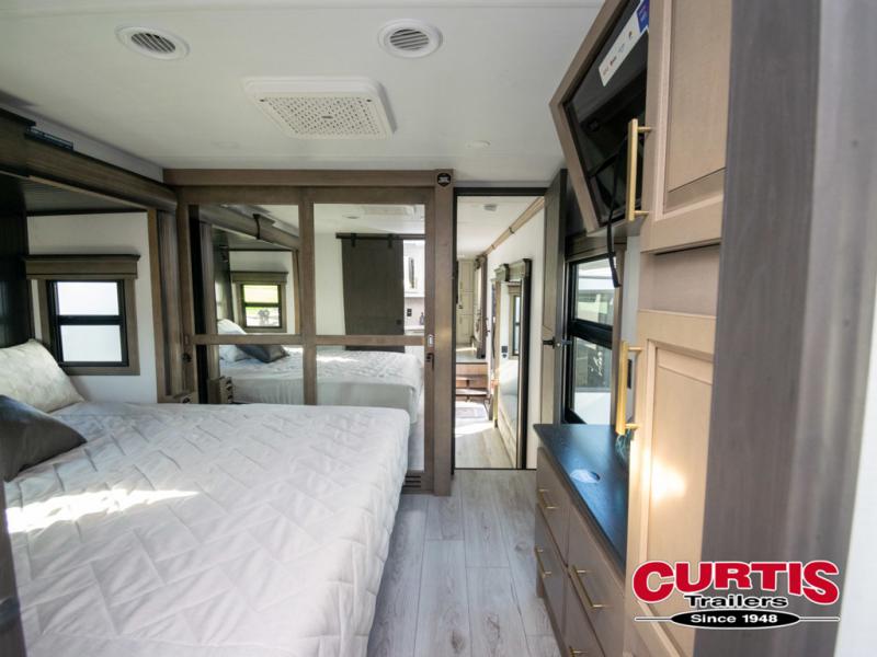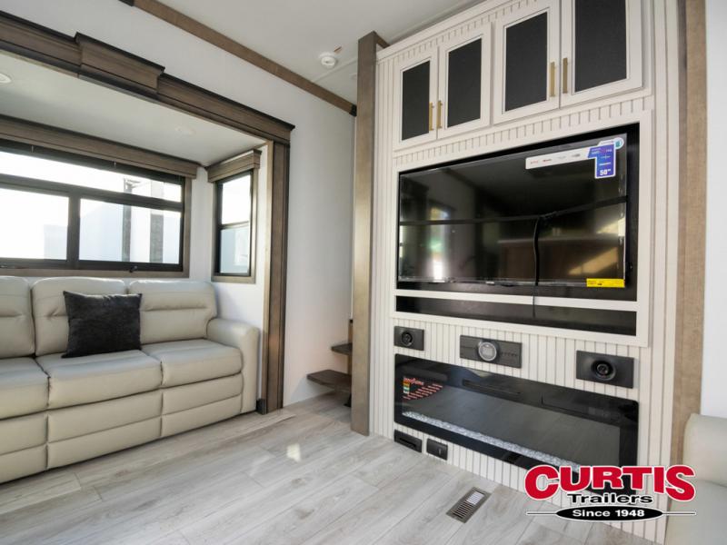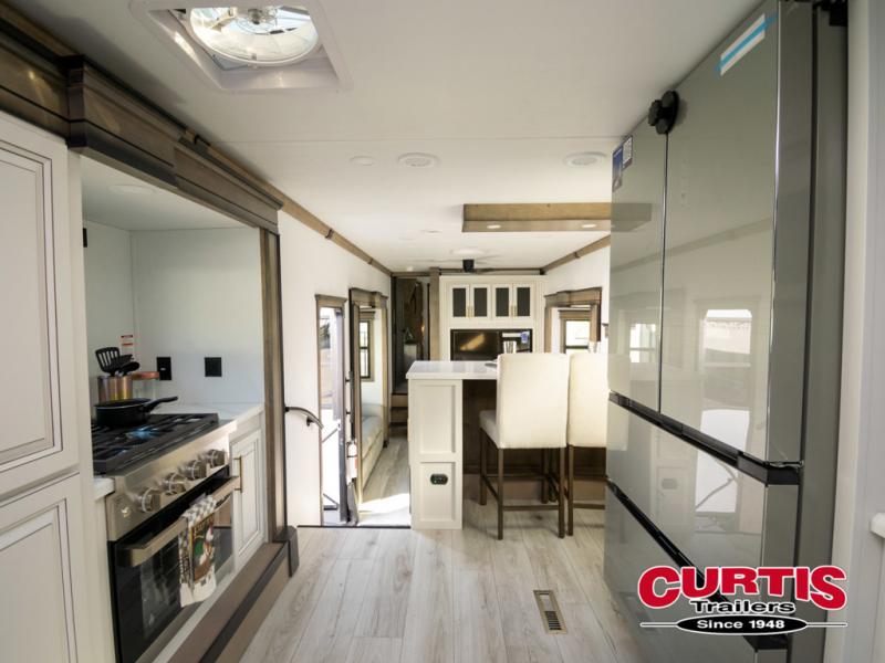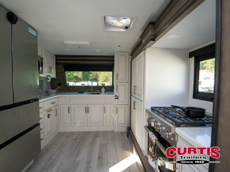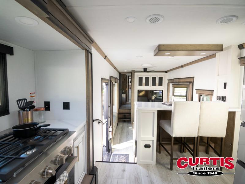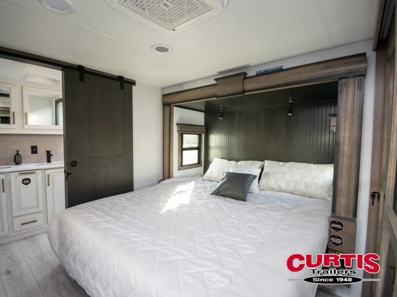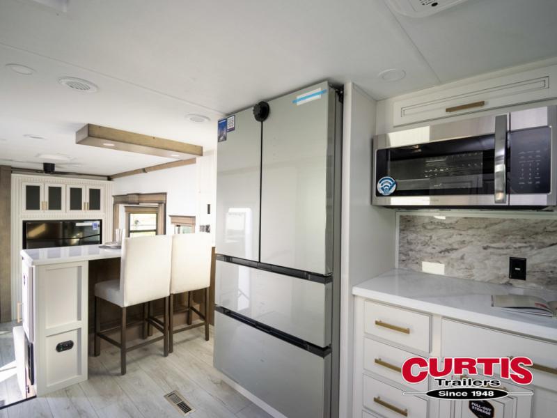The perfect RV when you like to take "home"' with you when you travel! This Montana fifth wheel gives you the space you want and it feels like home with plenty of features to love and keep you comfortable when you are out enjoying your adventures. Four slides in total give each space plenty of room, the raised front kitchen has everything you need to cook up meals and snacks just like at home. An 18 cu. ft. residential refrigerator with ice maker, convection microwave oven, and large sink, plus pantry space will make any chef happy. The mid-coach area just inside the door features a living room with dual opposing hide-a-bed slides as well as powered theater seating and a fireplace with Smart TV opposite. Step up in back to a bedroom with a king bed slide, a dresser, and closet featuring prep for a stackable washer and dryer. A sliding barn door leads into the rear spacious master bath featuring a 48" x 30" shower, a toilet, linen storage and a vanity with two sinks!