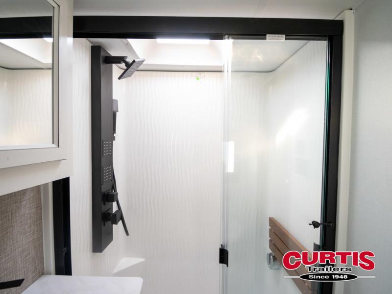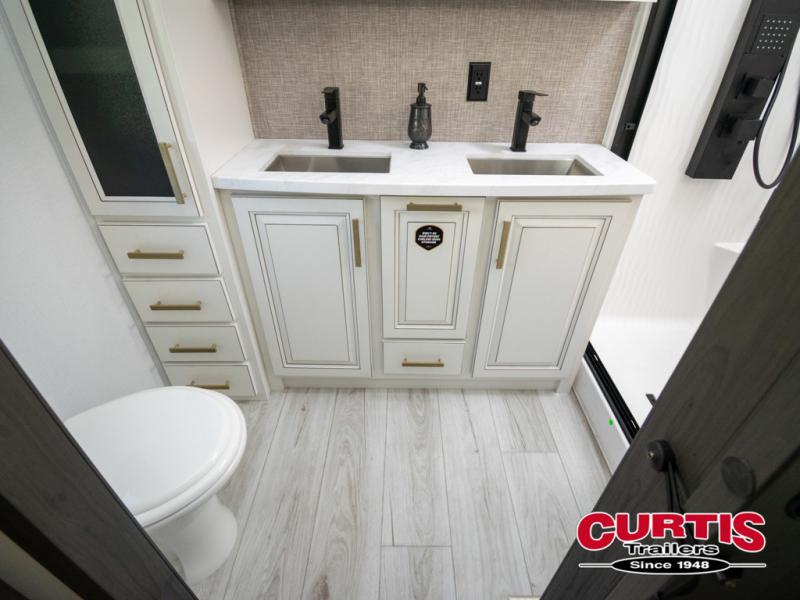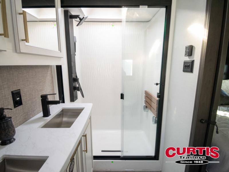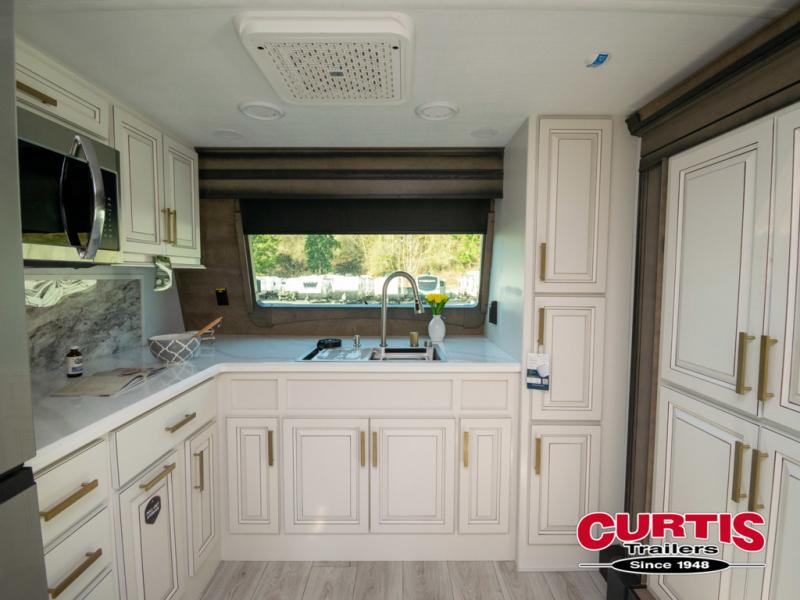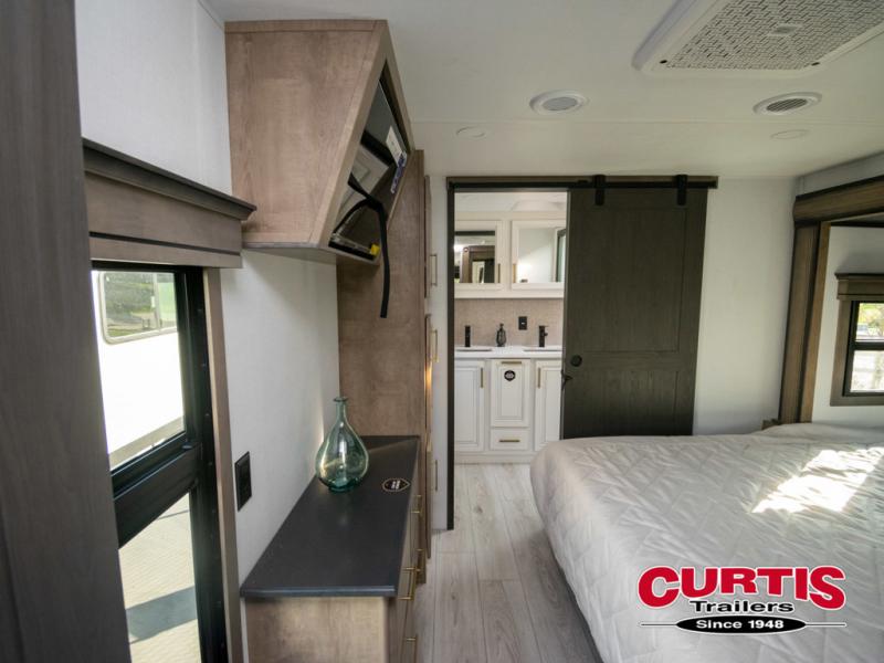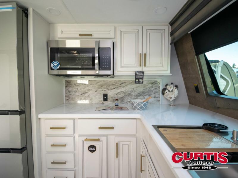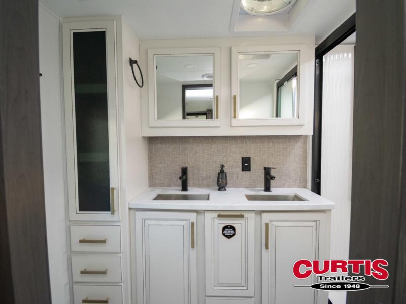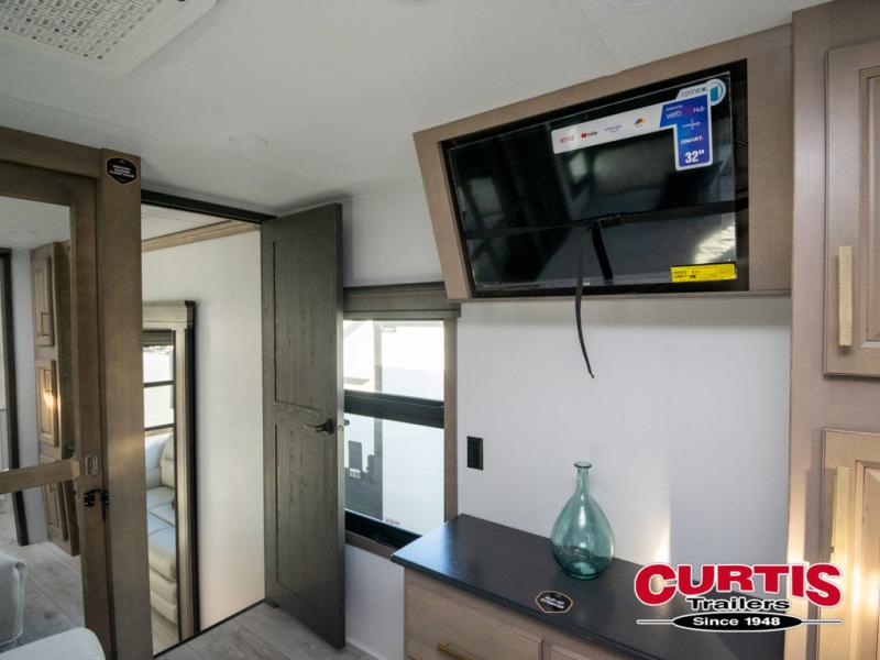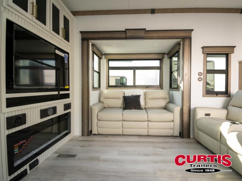 The perfect RV when you like to take "home"' with you when you travel! This Montana fifth wheel gives you the space you want and it feels like home with plenty of features to love and keep you comfortable when you are out enjoying your adventures. Four slides in total give each space plenty of room, the raised front kitchen has everything you need to cook up meals and snacks just like at home. An 18 cu. ft. residential refrigerator with ice maker, convection microwave oven, and large sink, plus pantry space will make any chef happy. The mid-coach area just inside the door features a living room with dual opposing hide-a-bed slides as well as powered theater seating and a fireplace with Smart TV opposite. Step up in back to a bedroom with a king bed slide, a dresser, and closet featuring prep for a stackable washer and dryer. A sliding barn door leads into the rear spacious master bath featuring a 48" x 30" shower, a toilet, linen storage and a vanity with two sinks!