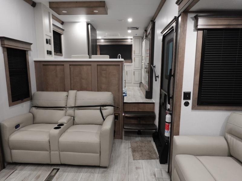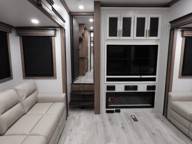 The perfect RV when you like to take "home"' with you when you travel! This Montana fifth wheel gives you the space you want and it feels like home with plenty of features to love and keep you comfortable when you are out enjoying your adventures. Four slides in total give each space plenty of room, the raised front kitchen has everything you need to cook up meals and snacks just like at home. An 18 cu. ft. residential refrigerator with ice maker, convection microwave oven, and large sink, plus pantry space will make any chef happy. The mid-coach area just inside the door features a living room with dual opposing hide-a-bed slides as well as powered theater seating and a fireplace with Smart TV opposite. Step up in back to a bedroom with a king bed slide, a dresser, and closet featuring prep for a stackable washer and dryer. A sliding barn door leads into the rear spacious master bath featuring a 48" x 30" shower, a toilet, linen storage and a vanity with two sinks!