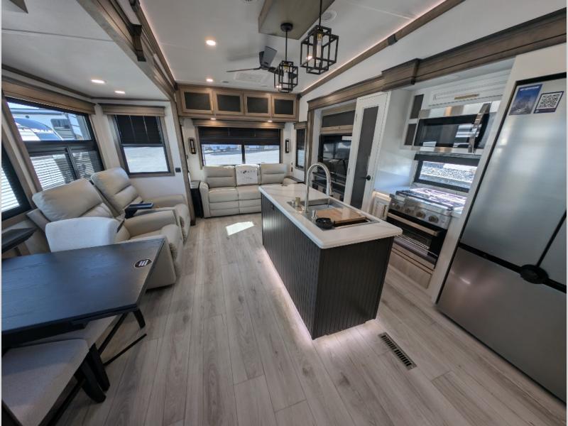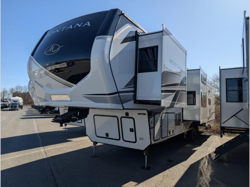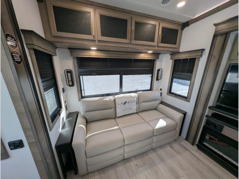 Enjoy luxury, innovation, and the outdoors in any one of Montana's finest fifth wheels. Each set the standard with exceptional features, and exciting factory installed options to provide you a great home on the road. Keystone's exclusive 12" I-beam chassis with z-frame technology has been reengineered to be stronger, lighter and built for "the long haul". A few other construction features you will appreciate include a Road Armor suspension, 2" thick, dual-layered lauan high gloss fiberglass sidewalls, a MaxTurn front cap with KeyShield automotive-grade paint, and a fully walkable roof with an Alpha seamless TPO membrane system. Each feature stylish interiors with two decor choices paired with beautiful hardwood cabinetry, vinyl flooring throughout, central vacuum, plus a La-Z-Boy furniture package for all-around comfort!