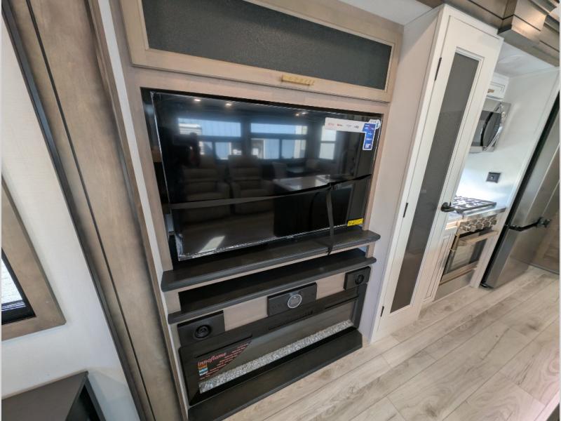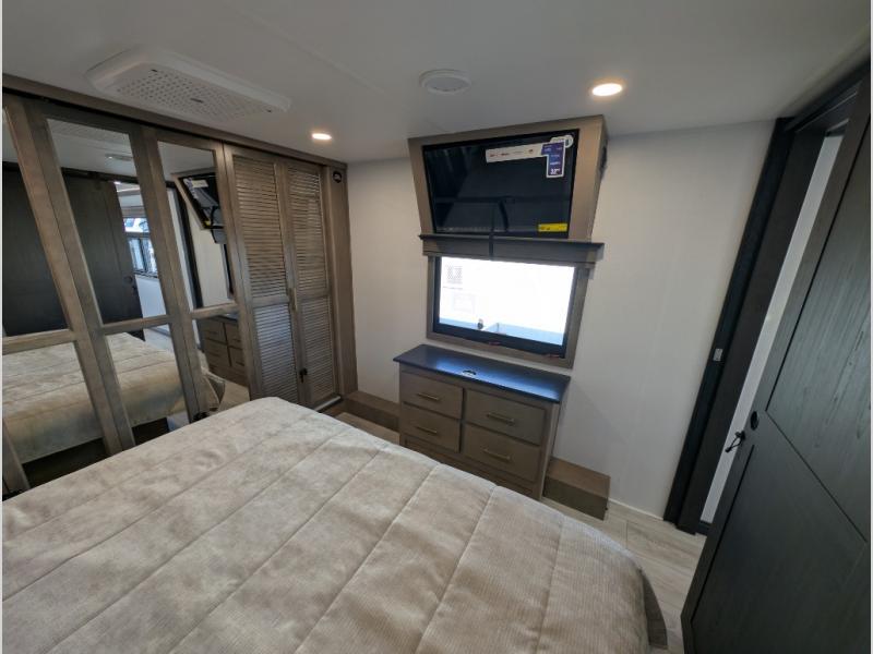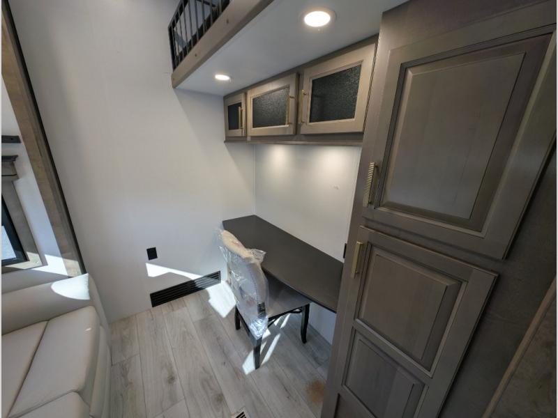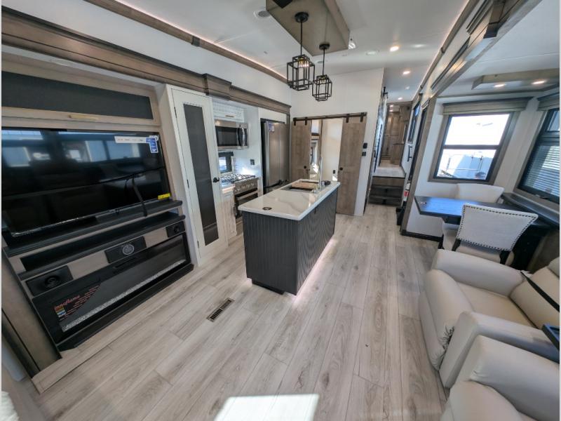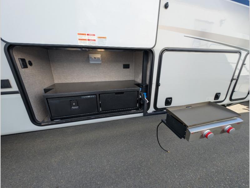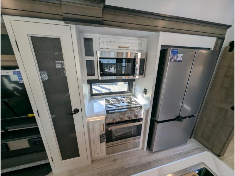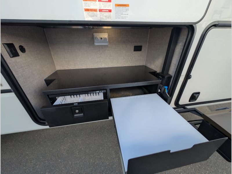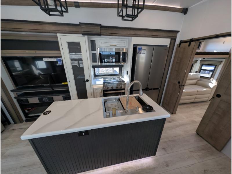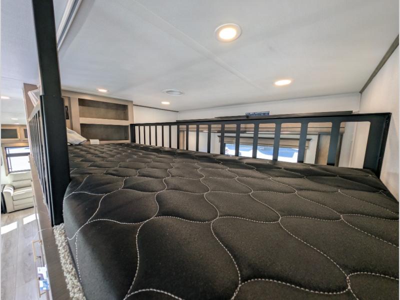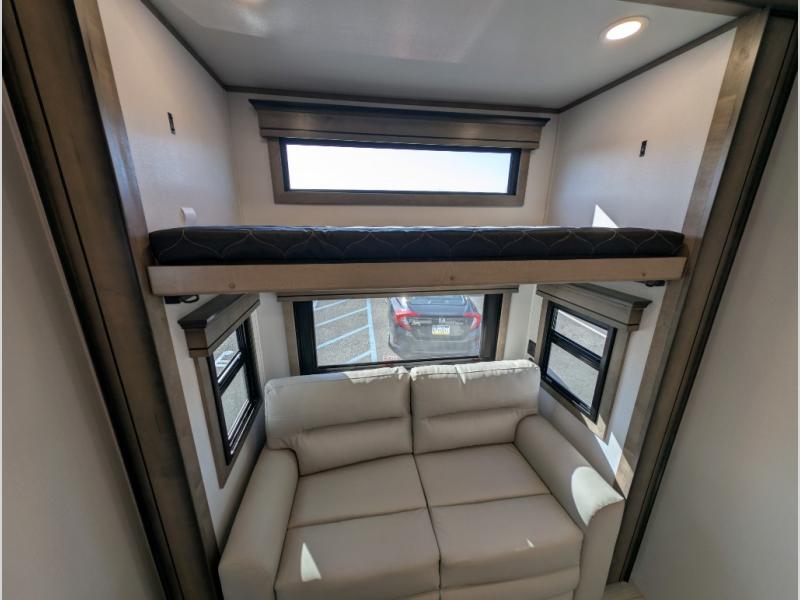 Everyone will have a comfortable place to sleep with a front private bedroom and a middle bunkhouse in this fifth wheel! The front private bedroom has a king bed slide with storage underneath, a dresser with a 32" Smart TV, and two closets with additional storage. The mid-bunk room/bonus room has a hide-a-bed sofa with flip-up bunk above across from a desk so you can get some work done while you're away, plus a loft area/attic space above it all with a ladder to access it. The full bathroom has a 48" x 30" fiberglass shower with a seat and skylight above, and a linen closet to keep your towels close. The chef can prepare delicious home cooked meals for everyone either indoors with the 24" range and convection microwave oven, or at the outdoor kitchen with a two burner cooktop and refrigerator to keep your drink nice and cold!