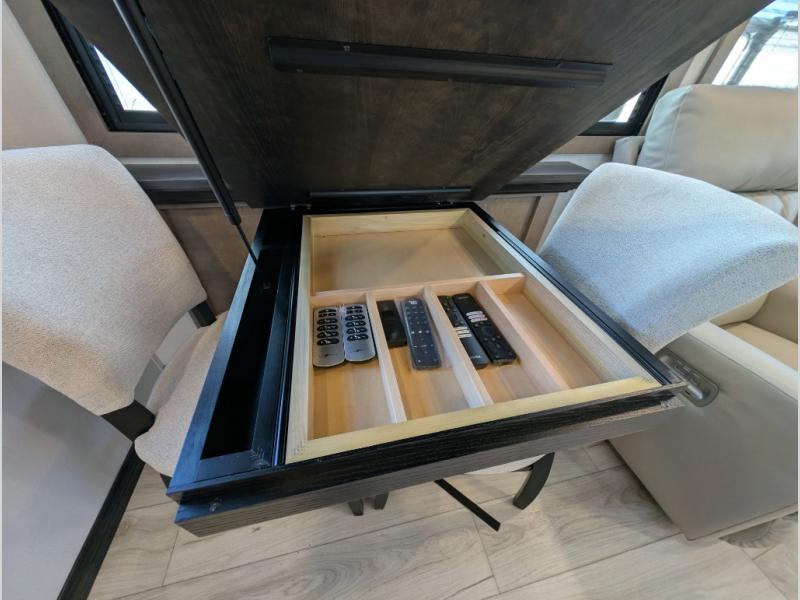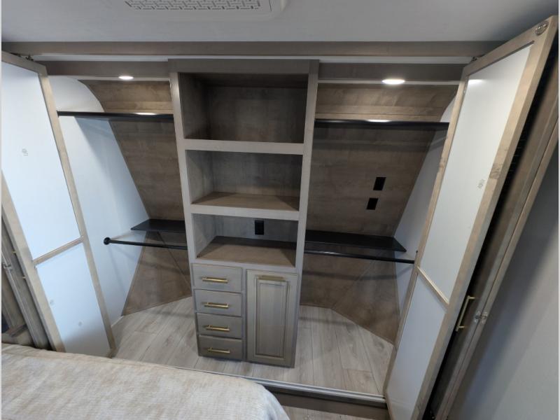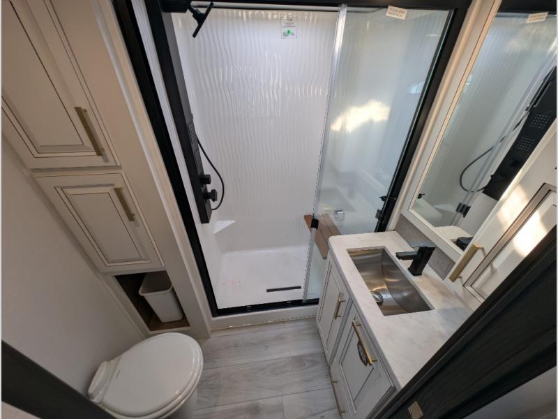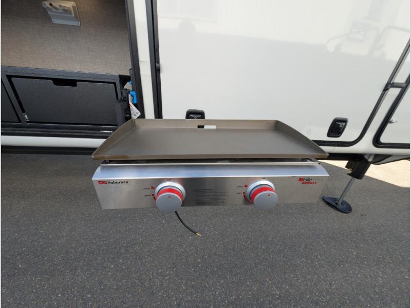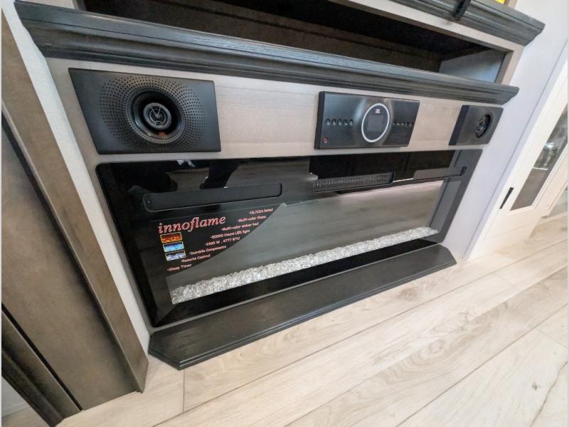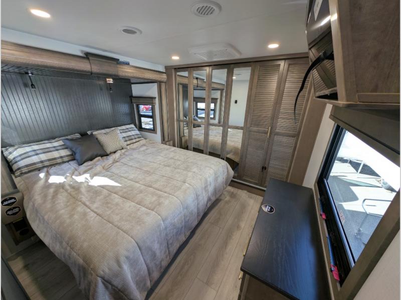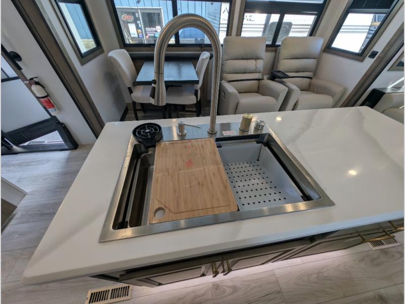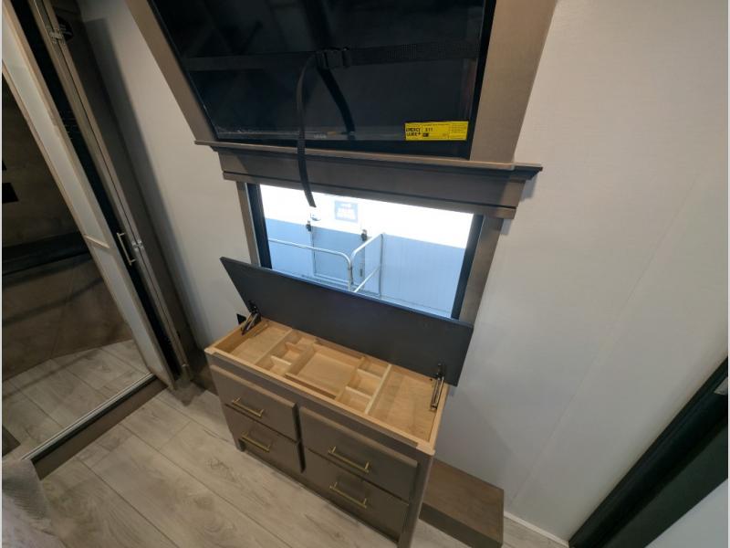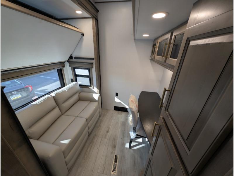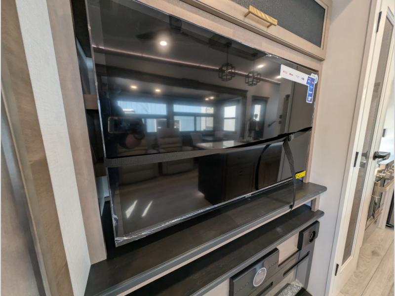 Everyone will have a comfortable place to sleep with a front private bedroom and a middle bunkhouse in this fifth wheel! The front private bedroom has a king bed slide with storage underneath, a dresser with a 32" Smart TV, and two closets with additional storage. The mid-bunk room/bonus room has a hide-a-bed sofa with flip-up bunk above across from a desk so you can get some work done while you're away, plus a loft area/attic space above it all with a ladder to access it. The full bathroom has a 48" x 30" fiberglass shower with a seat and skylight above, and a linen closet to keep your towels close. The chef can prepare delicious home cooked meals for everyone either indoors with the 24" range and convection microwave oven, or at the outdoor kitchen with a two burner cooktop and refrigerator to keep your drink nice and cold!