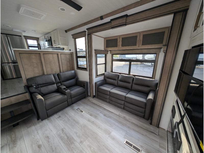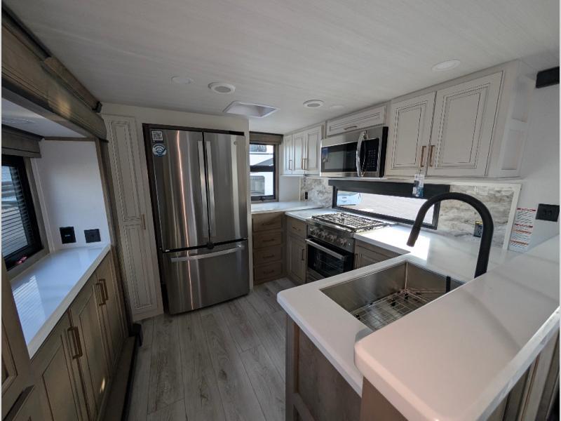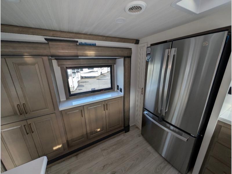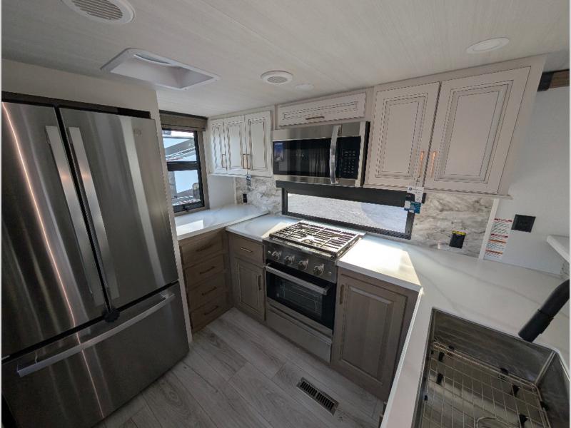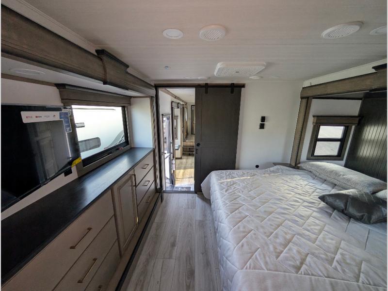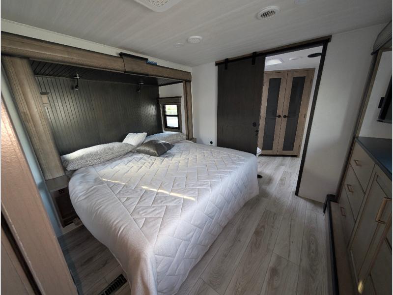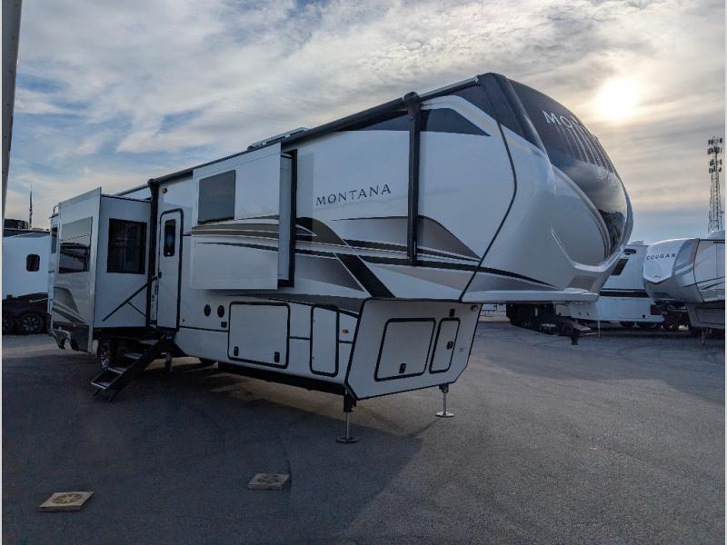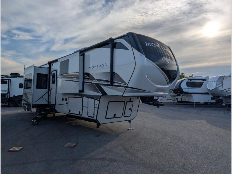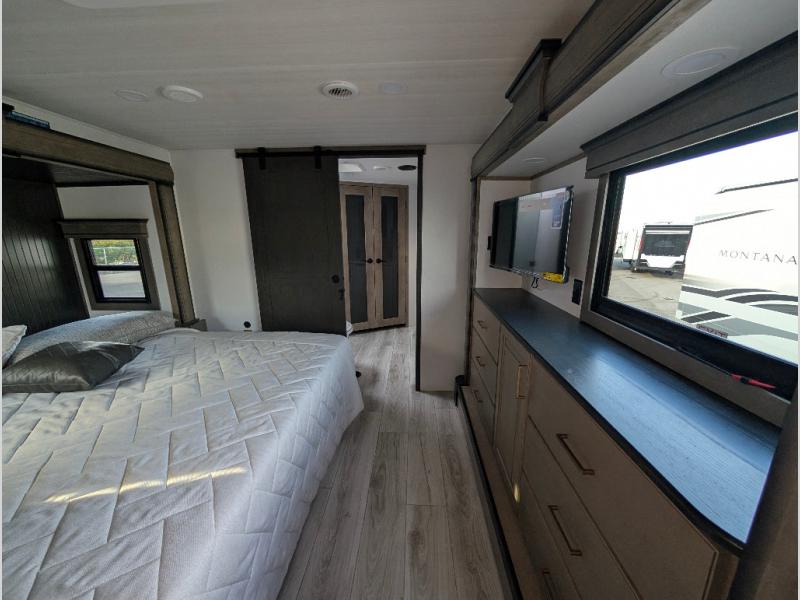 The perfect RV when you like to take "home"' with you when you travel! This Montana fifth wheel gives you the space you want and it feels like home with plenty of features to love and keep you comfortable when you are out enjoying your adventures. Five slides in total give each space plenty of room, the raised rear kitchen has everything you need to cook up meals and snacks just like at home. An 18 cu. ft. residential refrigerator with an ice maker, convection microwave oven and large sink, plus pantry space will make any chef happy. The mid-coach space just inside the door features a living room and half bath for convenience. There is also a dining table and four chairs within the roadside slide. Step up in front through a sliding barn door to a double slide space with a king bed and dresser. A second sliding barn door leads into the front spacious master bath featuring dual sinks, a 48" x 30" shower, and a large walk-in wardrobe with washer and dryer prep!