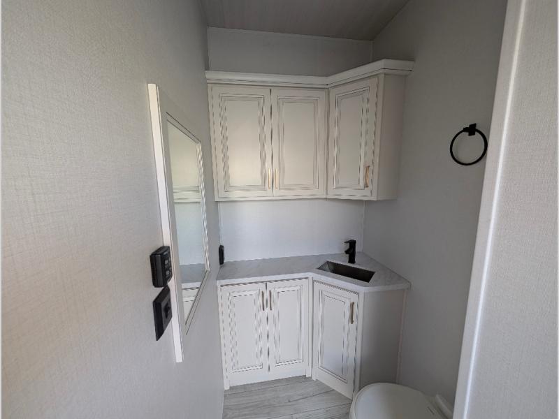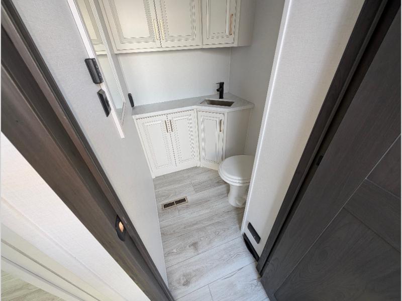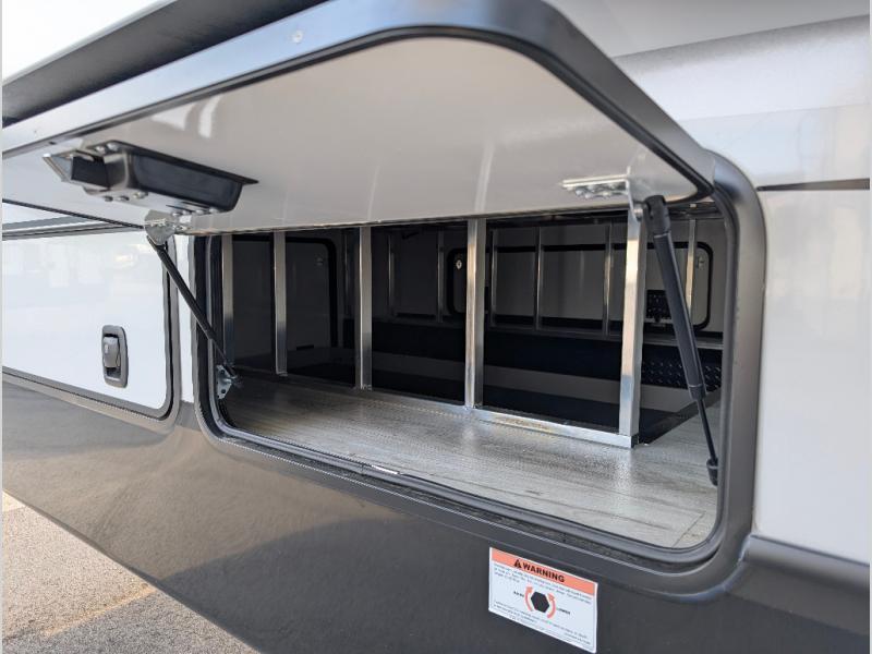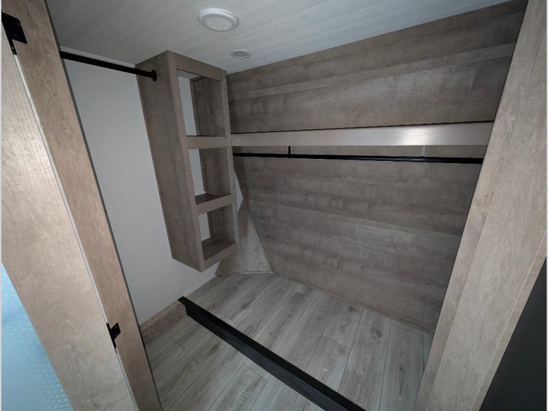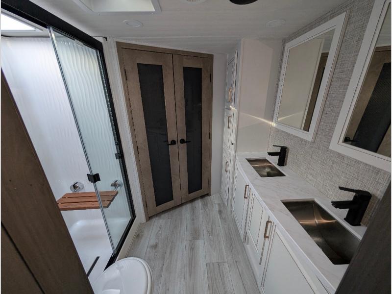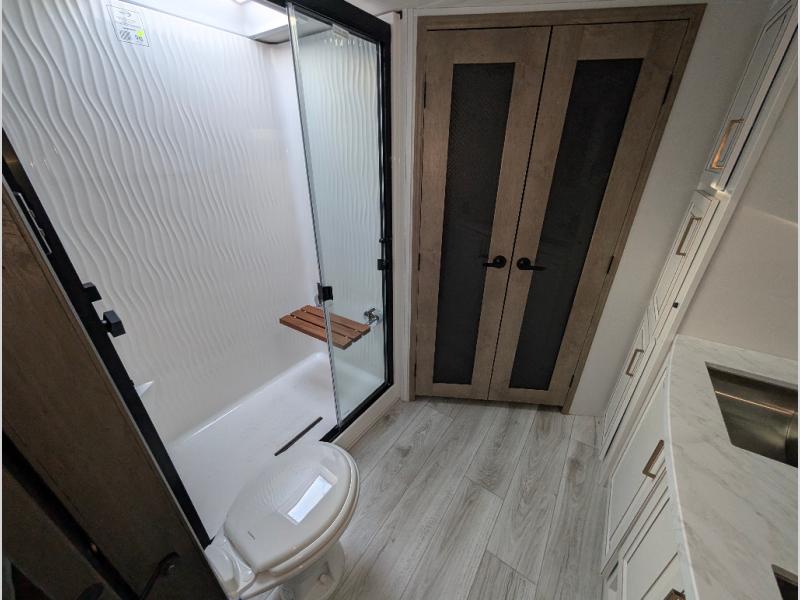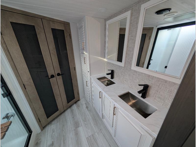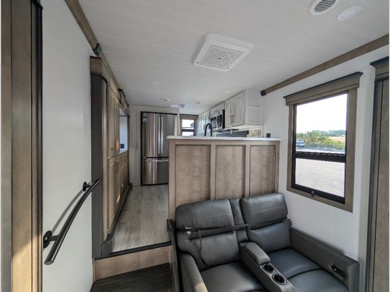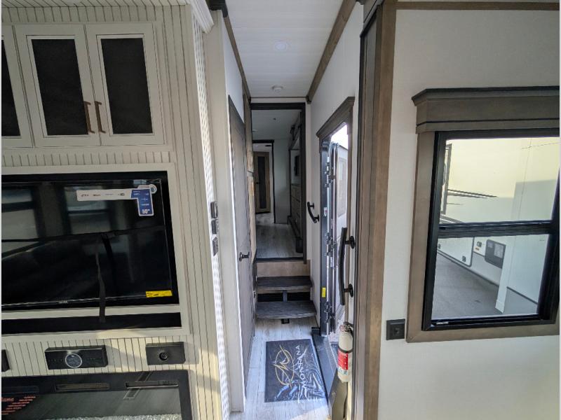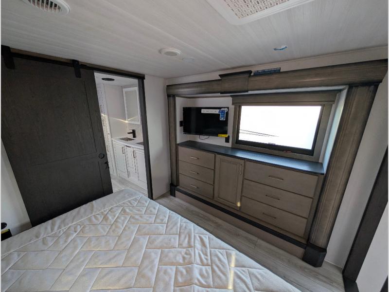 The perfect RV when you like to take "home"' with you when you travel! This Montana fifth wheel gives you the space you want and it feels like home with plenty of features to love and keep you comfortable when you are out enjoying your adventures. Five slides in total give each space plenty of room, the raised rear kitchen has everything you need to cook up meals and snacks just like at home. An 18 cu. ft. residential refrigerator with an ice maker, convection microwave oven and large sink, plus pantry space will make any chef happy. The mid-coach space just inside the door features a living room and half bath for convenience. There is also a dining table and four chairs within the roadside slide. Step up in front through a sliding barn door to a double slide space with a king bed and dresser. A second sliding barn door leads into the front spacious master bath featuring dual sinks, a 48" x 30" shower, and a large walk-in wardrobe with washer and dryer prep!