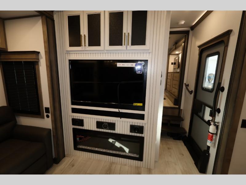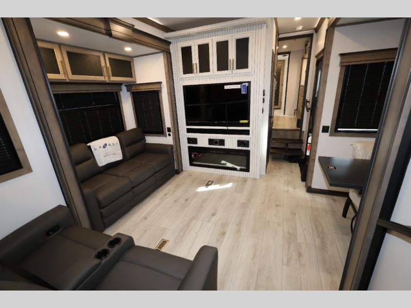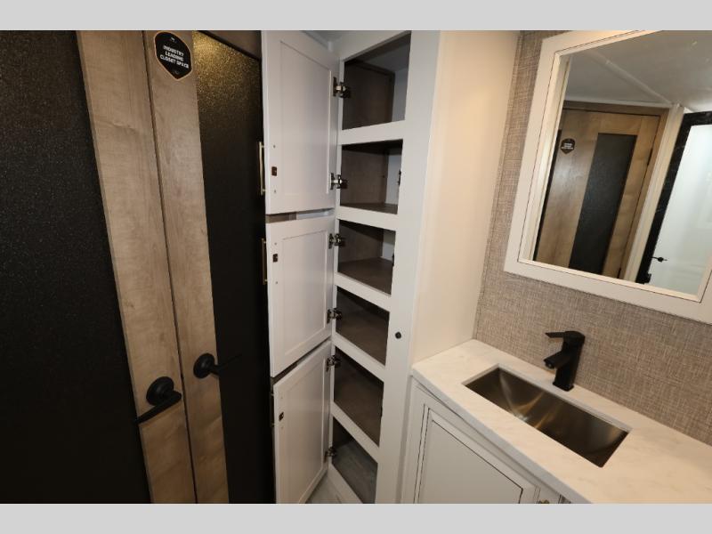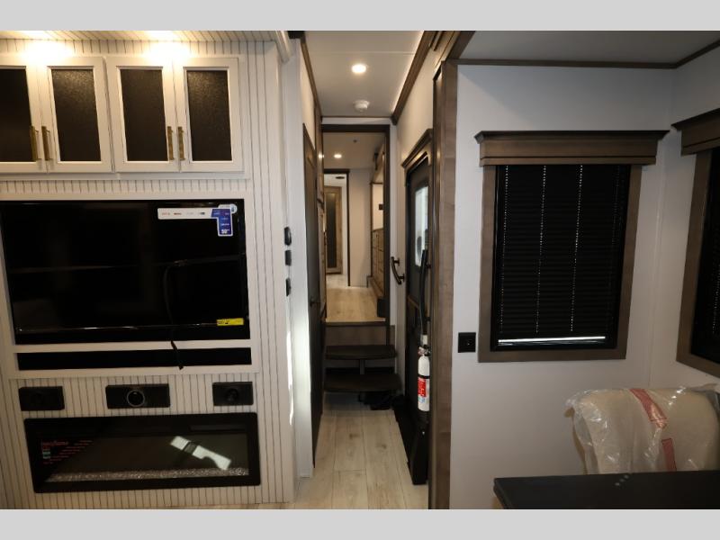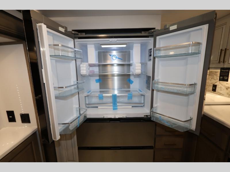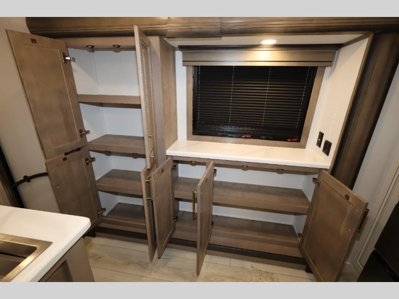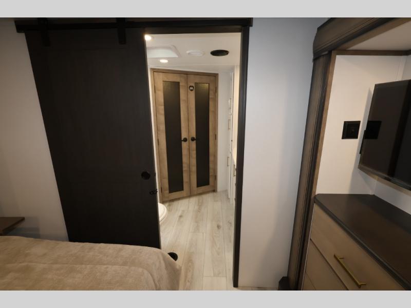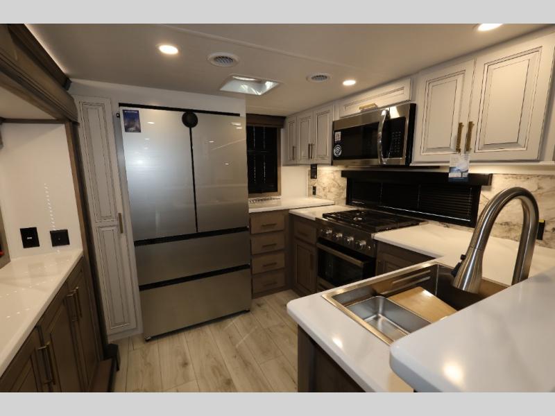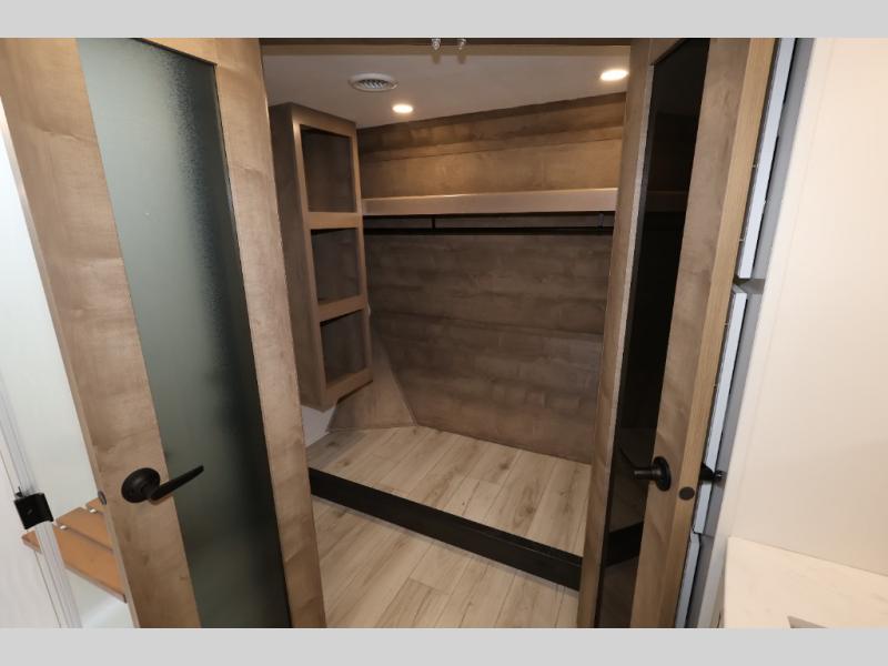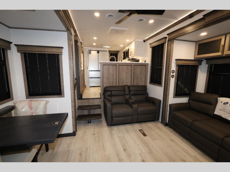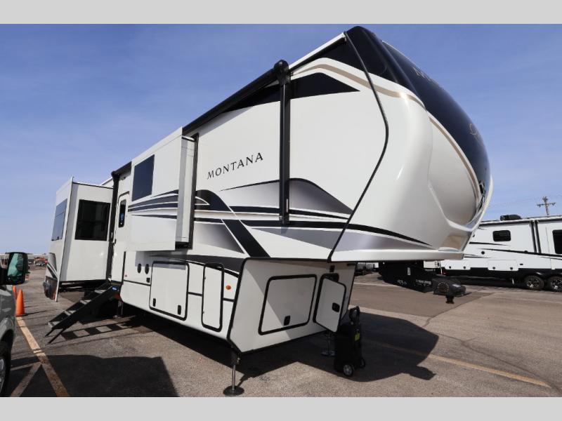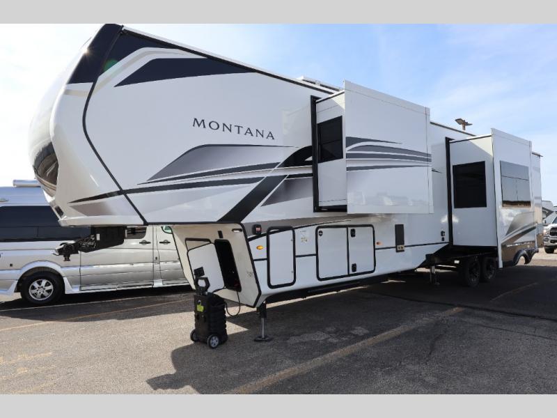 The perfect RV when you like to take "home"' with you when you travel! This Montana fifth wheel gives you the space you want and it feels like home with plenty of features to love and keep you comfortable when you are out enjoying your adventures. Five slides in total give each space plenty of room, the raised rear kitchen has everything you need to cook up meals and snacks just like at home. An 18 cu. ft. residential refrigerator with an ice maker, convection microwave oven and large sink, plus pantry space will make any chef happy. The mid-coach space just inside the door features a living room and half bath for convenience. There is also a dining table and four chairs within the roadside slide. Step up in front through a sliding barn door to a double slide space with a king bed and dresser. A second sliding barn door leads into the front spacious master bath featuring dual sinks, a 48" x 30" shower, and a large walk-in wardrobe with washer and dryer prep!