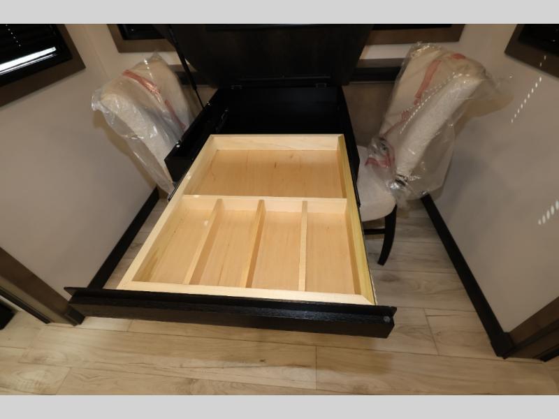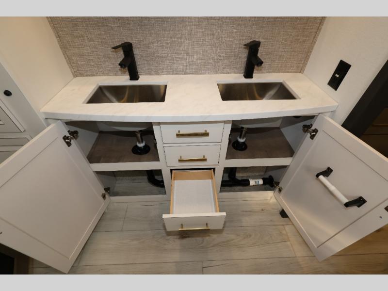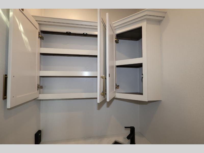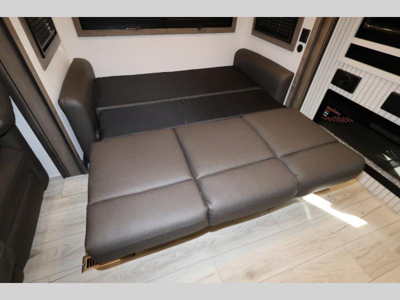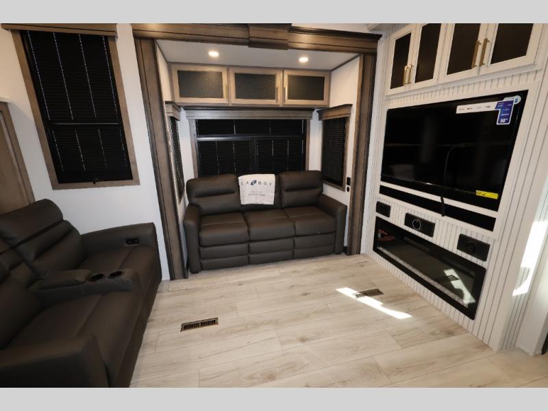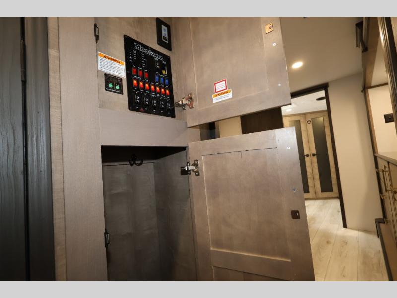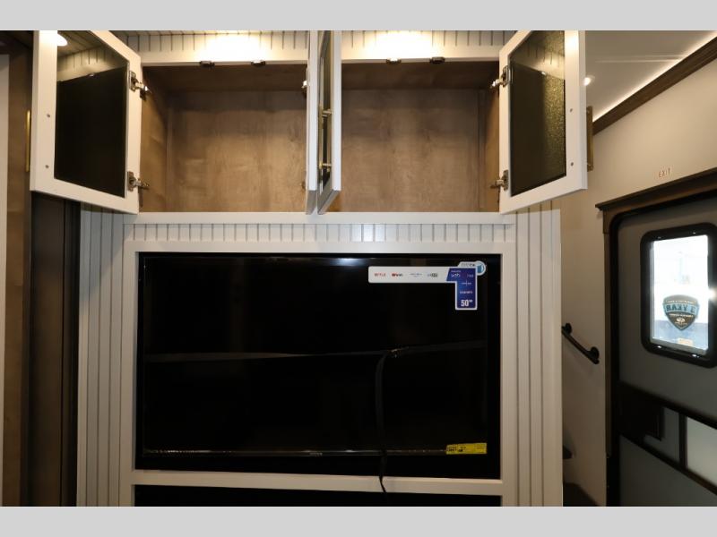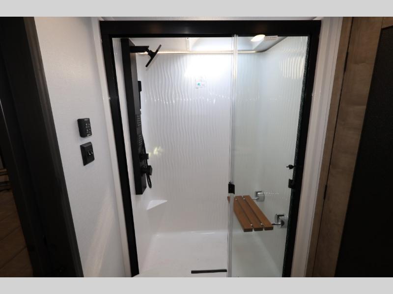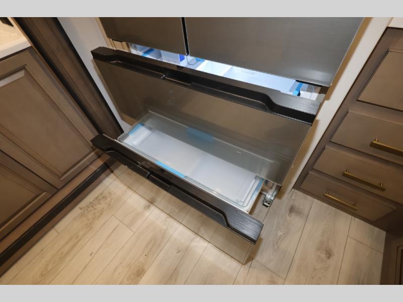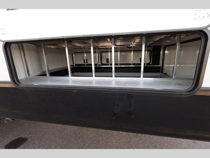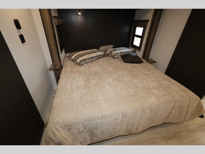The perfect RV when you like to take "home"' with you when you travel! This Montana fifth wheel gives you the space you want and it feels like home with plenty of features to love and keep you comfortable when you are out enjoying your adventures. Five slides in total give each space plenty of room, the raised rear kitchen has everything you need to cook up meals and snacks just like at home. An 18 cu. ft. residential refrigerator with an ice maker, convection microwave oven and large sink, plus pantry space will make any chef happy. The mid-coach space just inside the door features a living room and half bath for convenience. There is also a dining table and four chairs within the roadside slide. Step up in front through a sliding barn door to a double slide space with a king bed and dresser. A second sliding barn door leads into the front spacious master bath featuring dual sinks, a 48" x 30" shower, and a large walk-in wardrobe with washer and dryer prep!