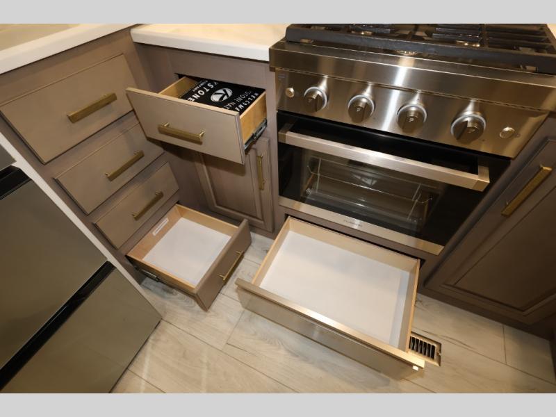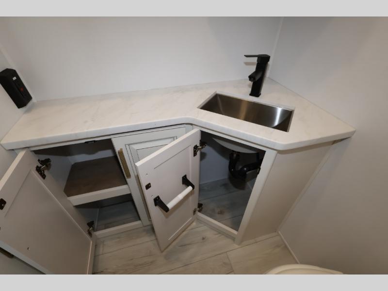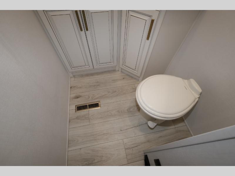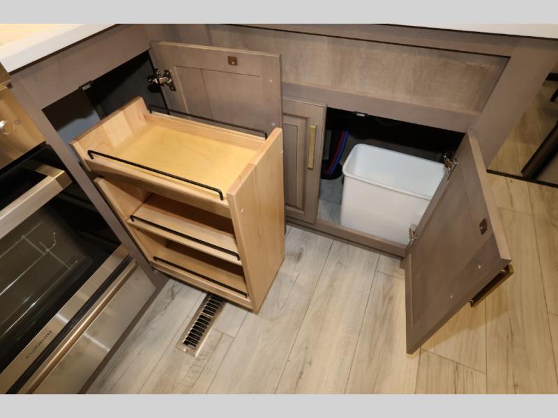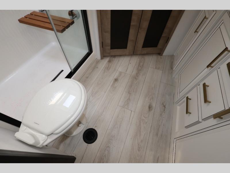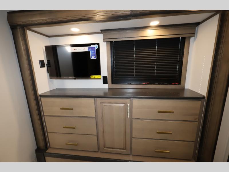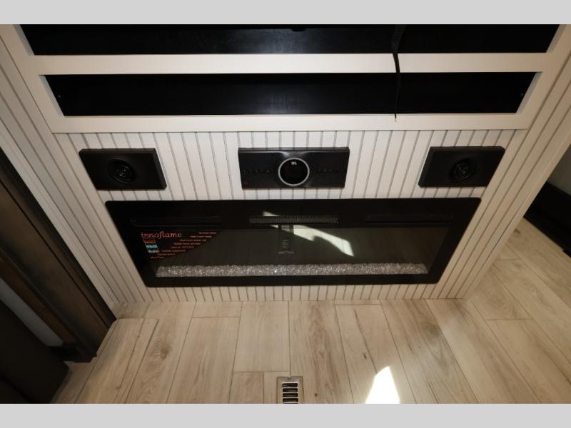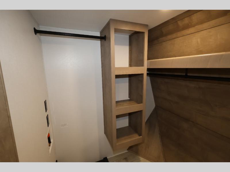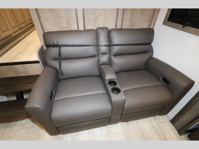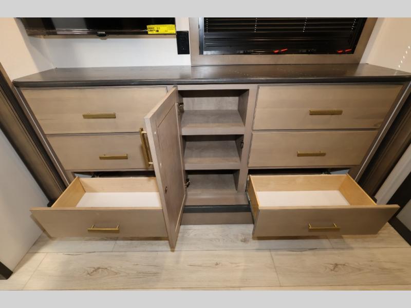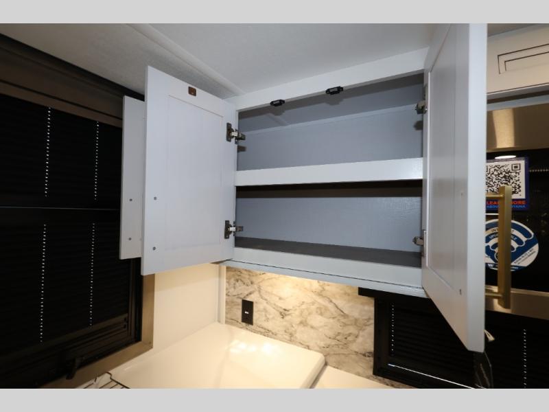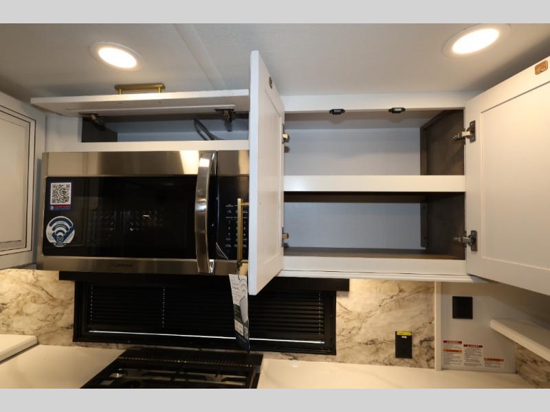 The perfect RV when you like to take "home"' with you when you travel! This Montana fifth wheel gives you the space you want and it feels like home with plenty of features to love and keep you comfortable when you are out enjoying your adventures. Five slides in total give each space plenty of room, the raised rear kitchen has everything you need to cook up meals and snacks just like at home. An 18 cu. ft. residential refrigerator with an ice maker, convection microwave oven and large sink, plus pantry space will make any chef happy. The mid-coach space just inside the door features a living room and half bath for convenience. There is also a dining table and four chairs within the roadside slide. Step up in front through a sliding barn door to a double slide space with a king bed and dresser. A second sliding barn door leads into the front spacious master bath featuring dual sinks, a 48" x 30" shower, and a large walk-in wardrobe with washer and dryer prep!