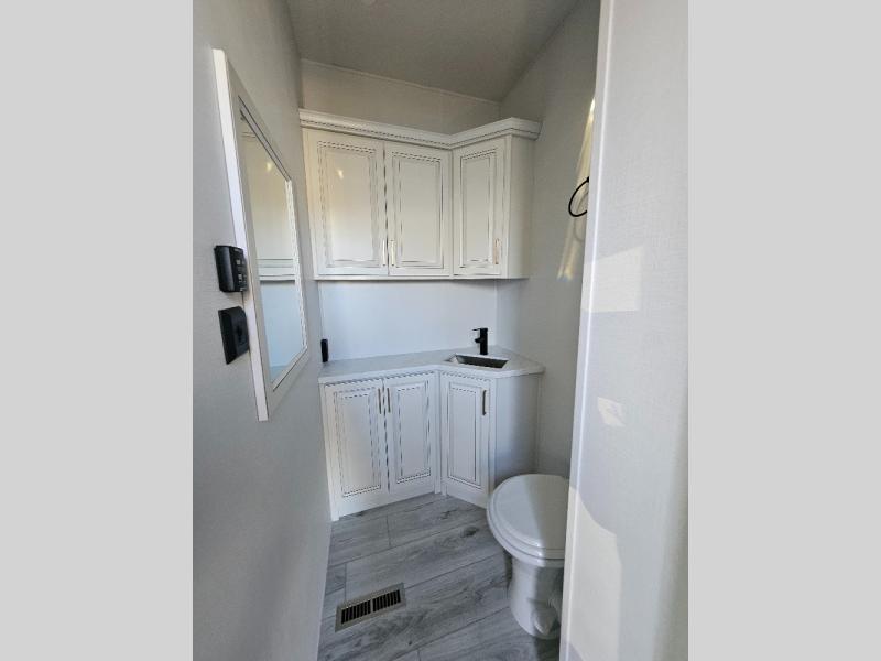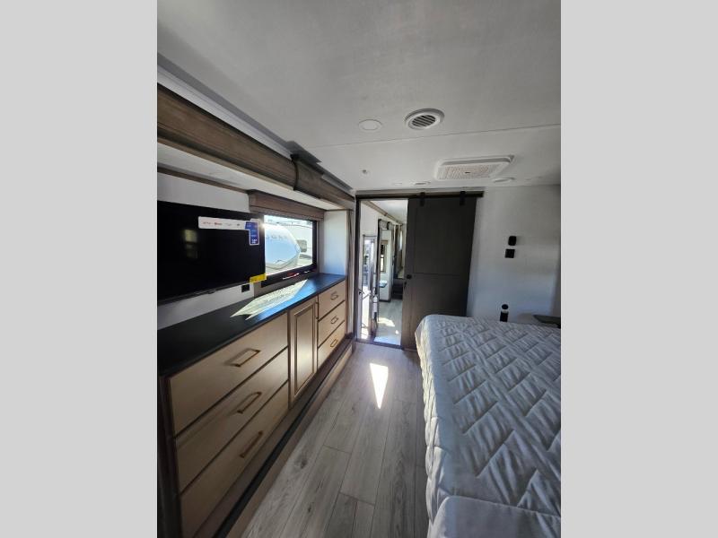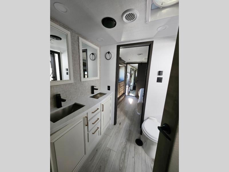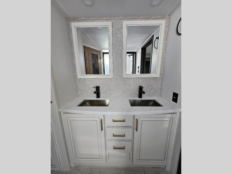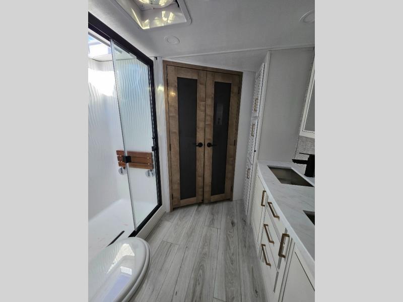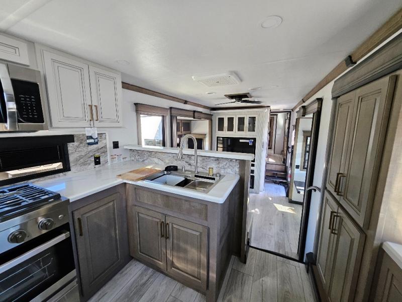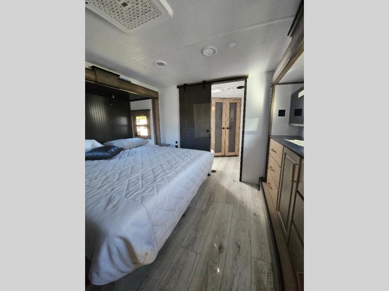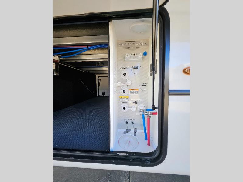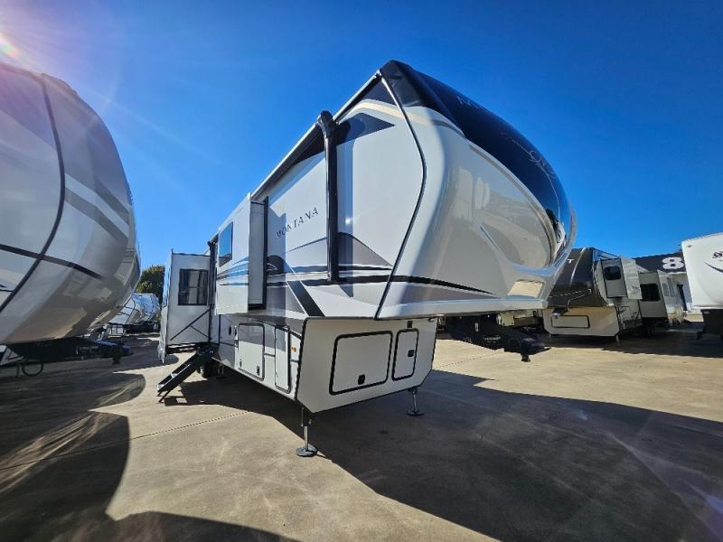 The perfect RV when you like to take "home"' with you when you travel! This Montana fifth wheel gives you the space you want and it feels like home with plenty of features to love and keep you comfortable when you are out enjoying your adventures. Five slides in total give each space plenty of room, the raised rear kitchen has everything you need to cook up meals and snacks just like at home. An 18 cu. ft. residential refrigerator with an ice maker, convection microwave oven and large sink, plus pantry space will make any chef happy. The mid-coach space just inside the door features a living room and half bath for convenience. There is also a dining table and four chairs within the roadside slide. Step up in front through a sliding barn door to a double slide space with a king bed and dresser. A second sliding barn door leads into the front spacious master bath featuring dual sinks, a 48" x 30" shower, and a large walk-in wardrobe with washer and dryer prep!