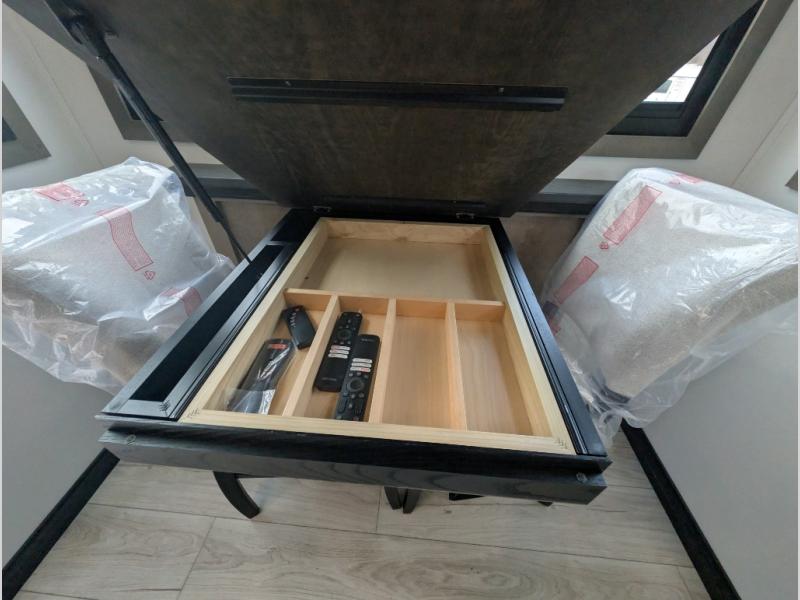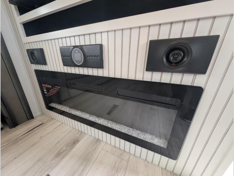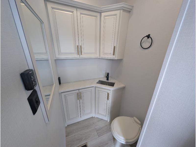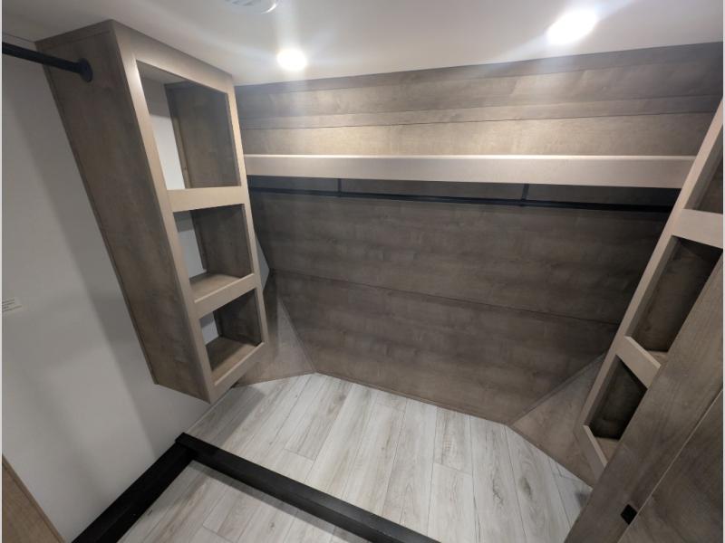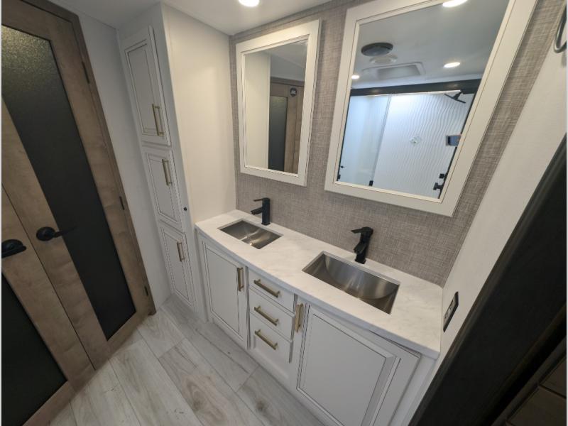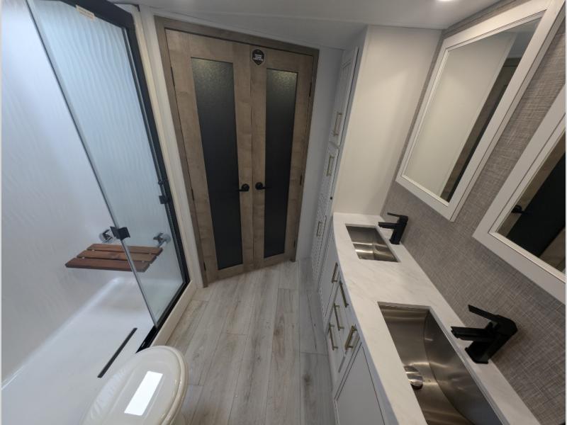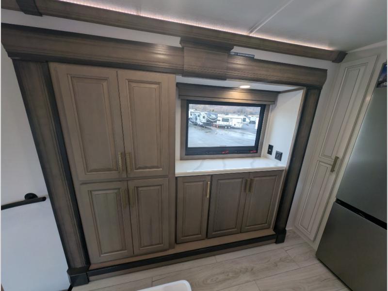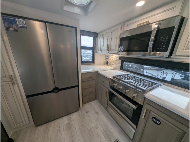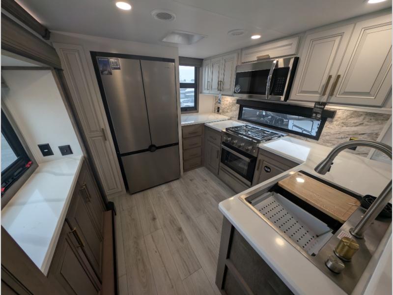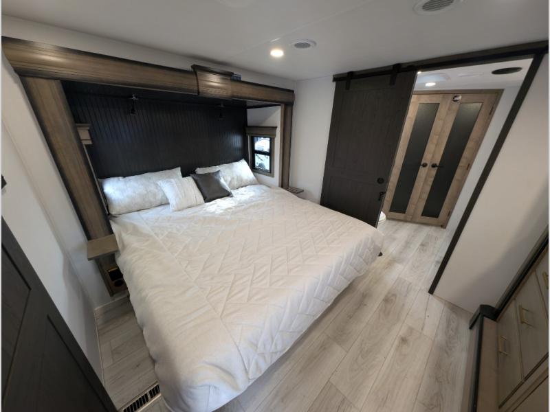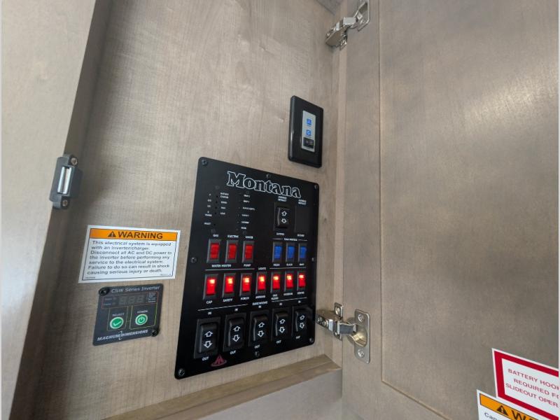 The perfect RV when you like to take "home"' with you when you travel! This Montana fifth wheel gives you the space you want and it feels like home with plenty of features to love and keep you comfortable when you are out enjoying your adventures. Five slides in total give each space plenty of room, the raised rear kitchen has everything you need to cook up meals and snacks just like at home. An 18 cu. ft. residential refrigerator with an ice maker, convection microwave oven and large sink, plus pantry space will make any chef happy. The mid-coach space just inside the door features a living room and half bath for convenience. There is also a dining table and four chairs within the roadside slide. Step up in front through a sliding barn door to a double slide space with a king bed and dresser. A second sliding barn door leads into the front spacious master bath featuring dual sinks, a 48" x 30" shower, and a large walk-in wardrobe with washer and dryer prep!