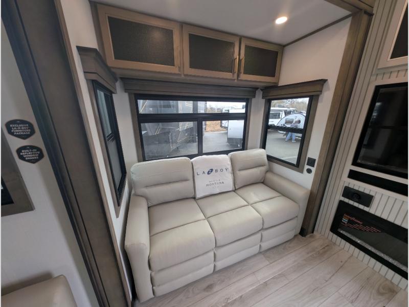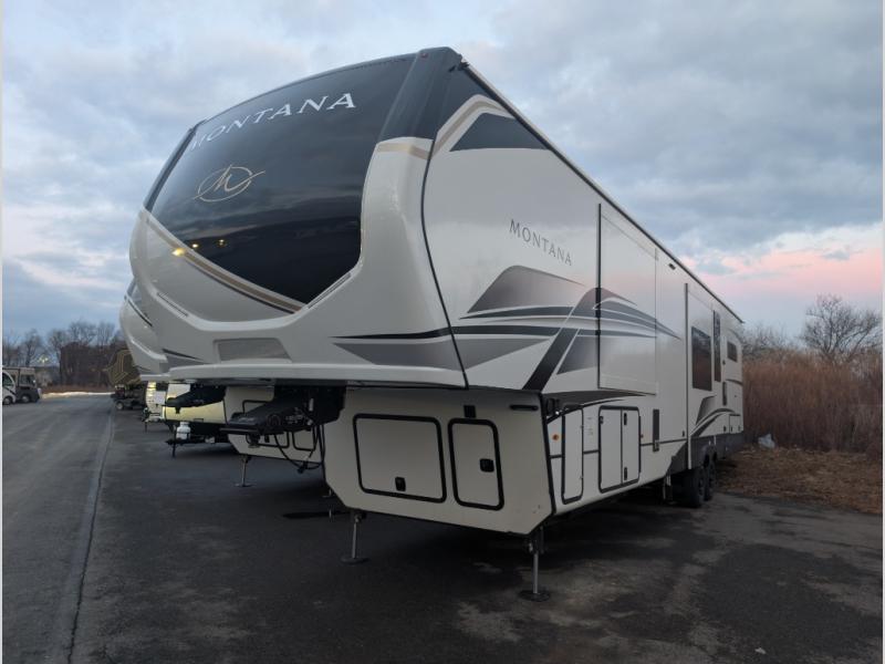 Enjoy luxury, innovation, and the outdoors in any one of Montana's finest fifth wheels. Each set the standard with exceptional features, and exciting factory installed options to provide you a great home on the road. Keystone's exclusive 12" I-beam chassis with z-frame technology has been reengineered to be stronger, lighter and built for "the long haul". A few other construction features you will appreciate include a Road Armor suspension, 2" thick, dual-layered lauan high gloss fiberglass sidewalls, a MaxTurn front cap with KeyShield automotive-grade paint, and a fully walkable roof with an Alpha seamless TPO membrane system. Each feature stylish interiors with two new decor choices paired with beautiful hand-glazed hardwood cabinetry, vinyl flooring throughout, central vacuum, plus a Blade Pure airflow system for clean, quite, and cool air!