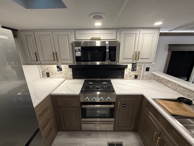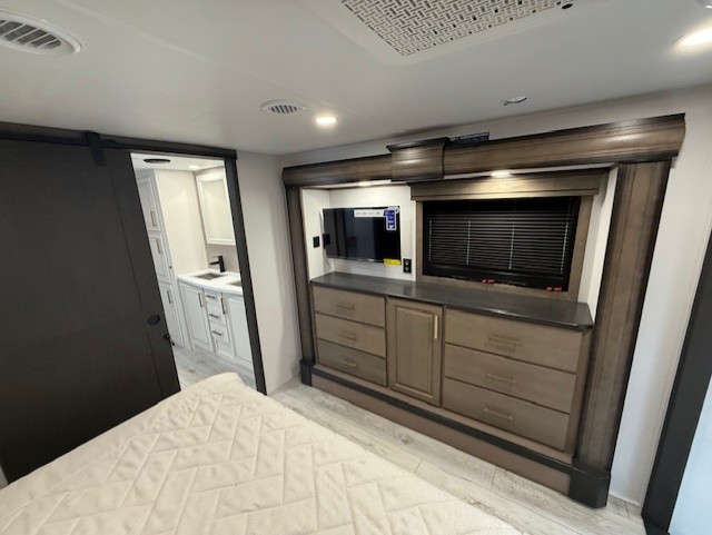 The perfect RV when you like to take "home"' with you when you travel! This Montana fifth wheel gives you the space you want and it feels like home with plenty of features to love and keep you comfortable when you are out enjoying your adventures. Five slides in total give each space plenty of room, the raised rear kitchen has everything you need to cook up meals and snacks just like at home. An 18 cu. ft. residential refrigerator with an ice maker, convection microwave oven and large sink, plus pantry space will make any chef happy. The mid-coach space just inside the door features a living room and half bath for convenience. There is also a dinette with storage within the roadside slide. Step up in front through a sliding barn door to a double slide space with a king bed and dresser. A second sliding barn door leads into the front spacious master bath featuring dual sinks, a 48" x 30" shower, and a large walk-in wardrobe with washer and dryer prep!