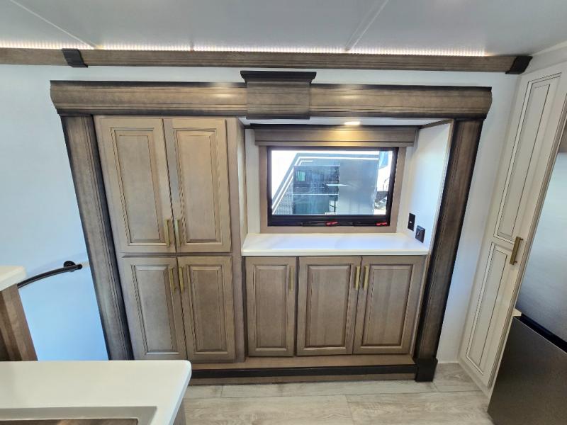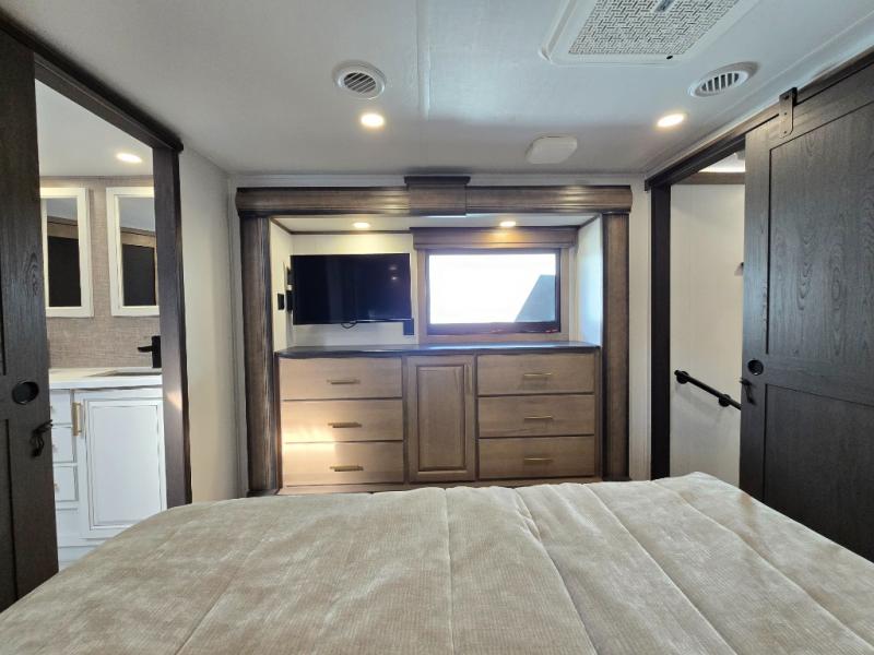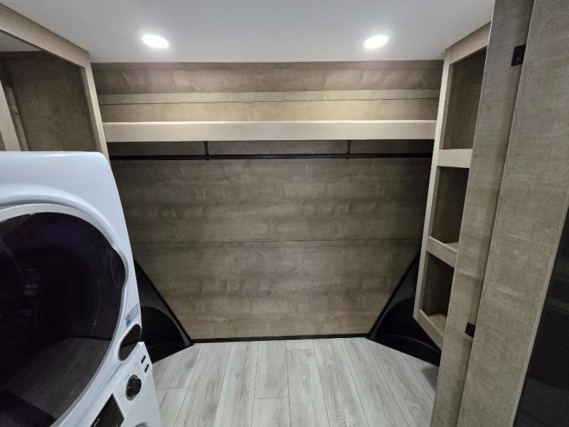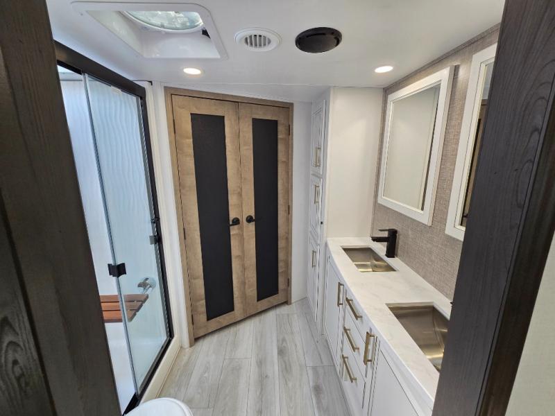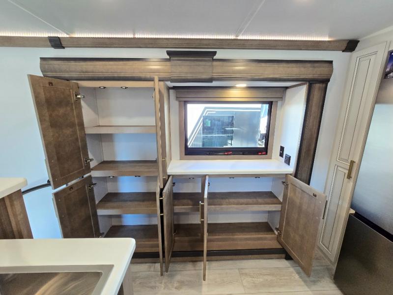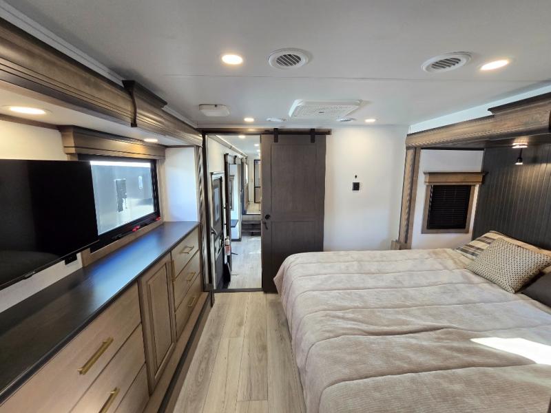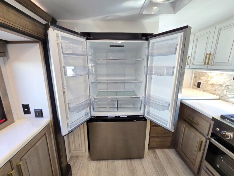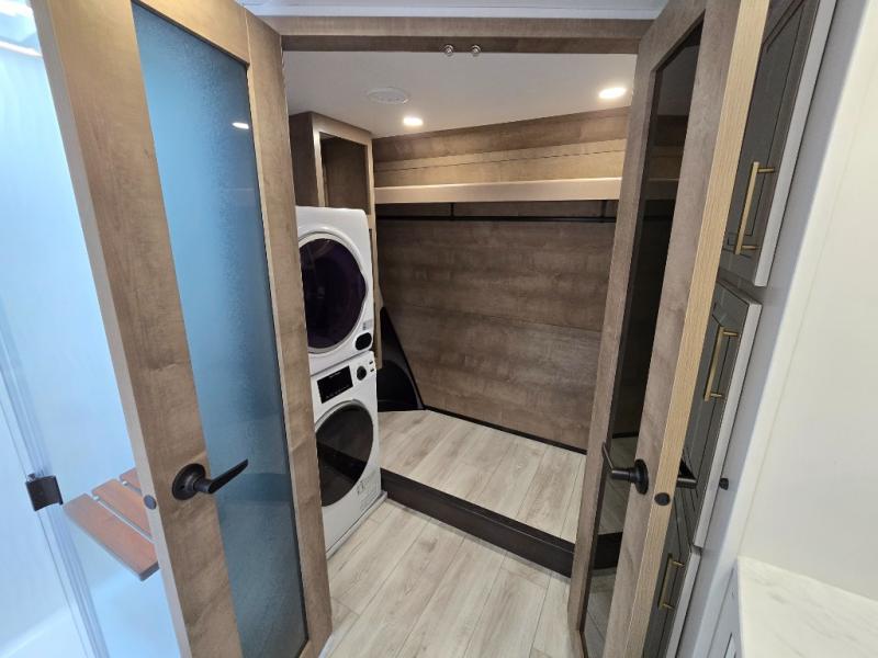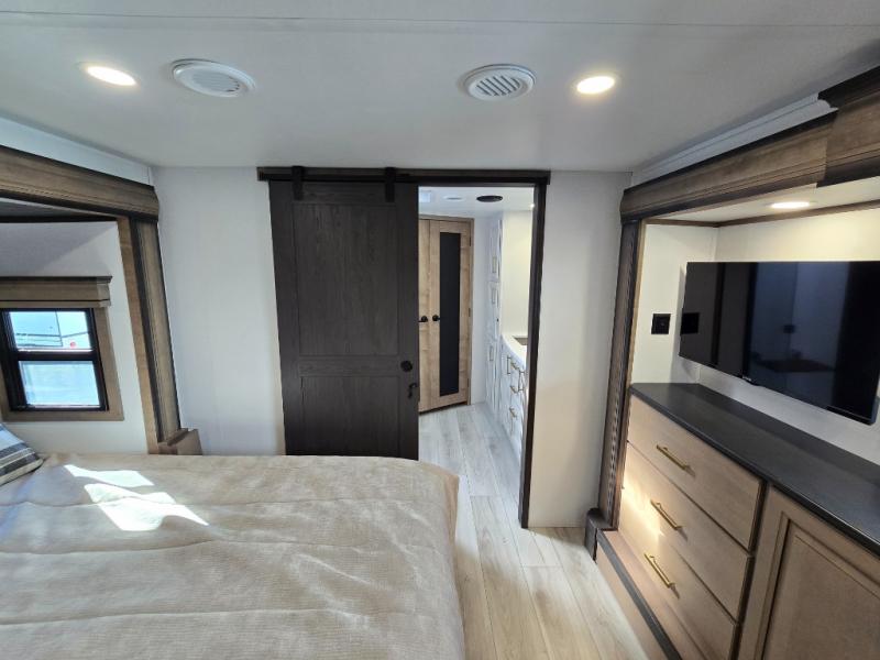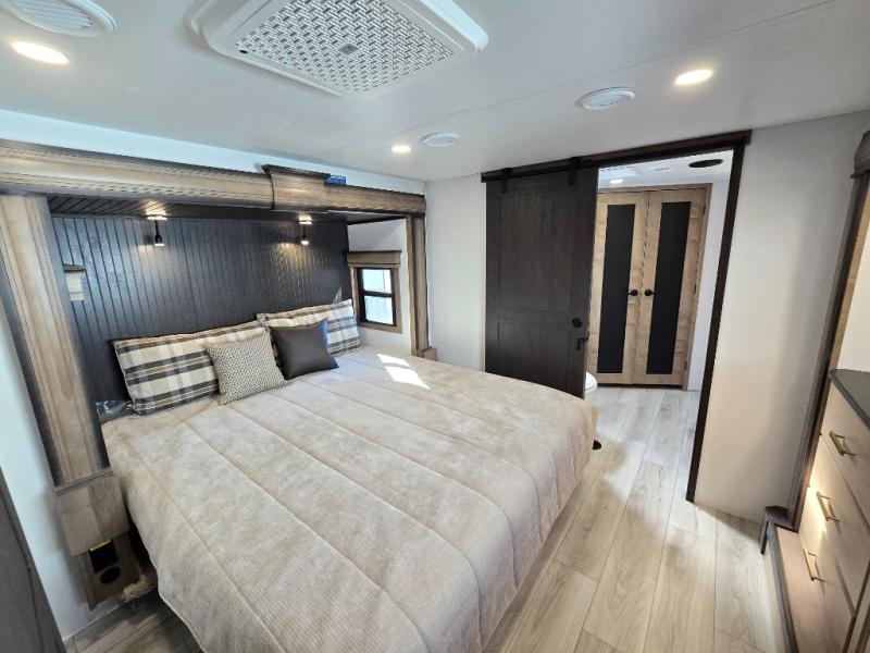 The perfect RV when you like to take "home"' with you when you travel! This Montana fifth wheel gives you the space you want and it feels like home with plenty of features to love and keep you comfortable when you are out enjoying your adventures. Five slides in total give each space plenty of room, the raised rear kitchen has everything you need to cook up meals and snacks just like at home. An 18 cu. ft. residential refrigerator with an ice maker, convection microwave oven and large sink, plus pantry space will make any chef happy. The mid-coach space just inside the door features a living room and half bath for convenience. There is also a dinette with storage within the roadside slide. Step up in front through a sliding barn door to a double slide space with a king bed and dresser. A second sliding barn door leads into the front spacious master bath featuring dual sinks, a 48" x 30" shower, and a large walk-in wardrobe with washer and dryer prep!