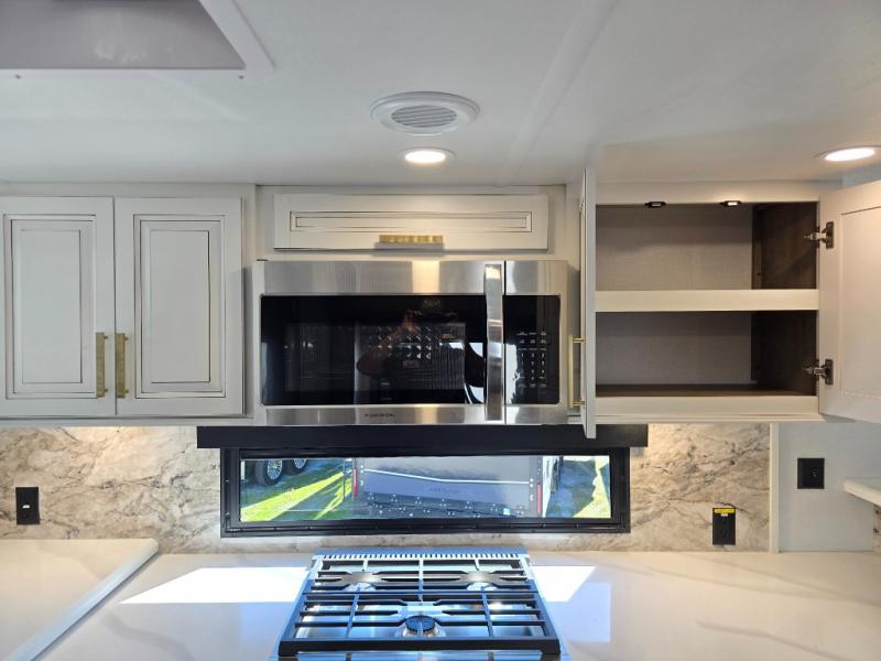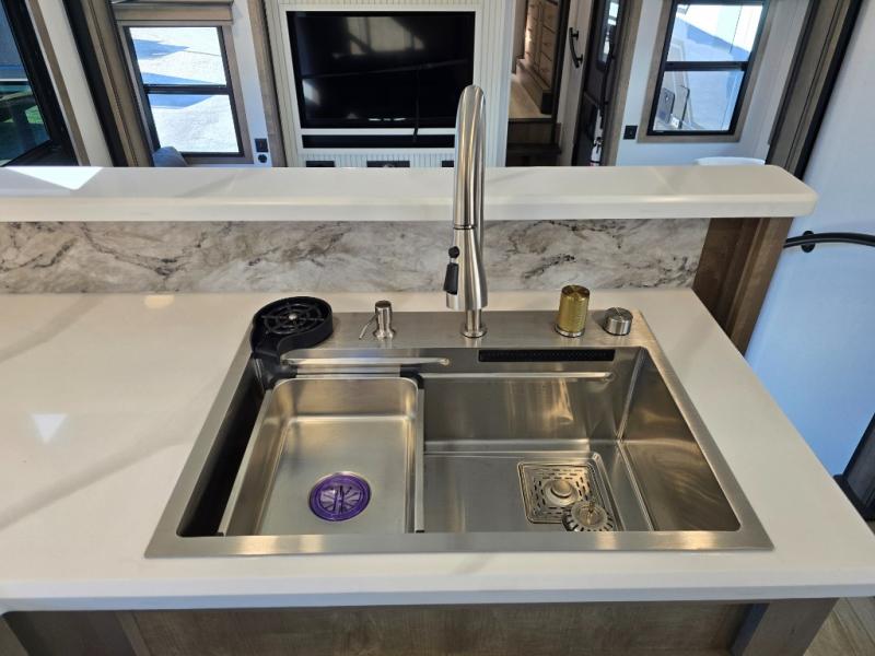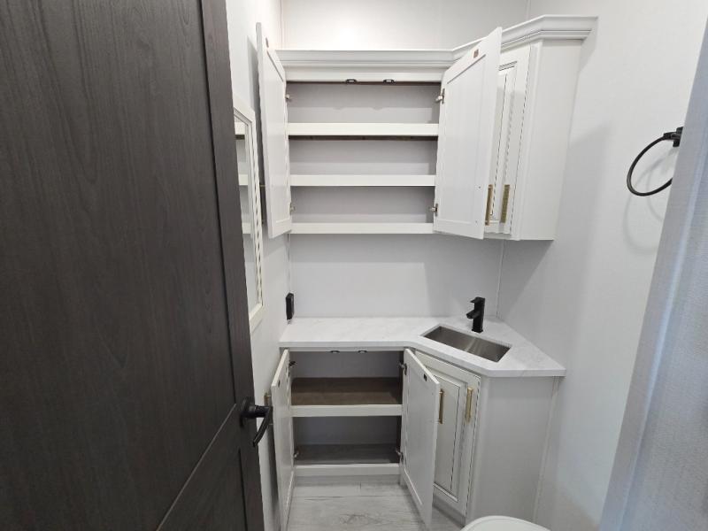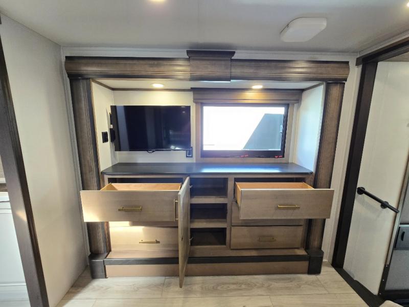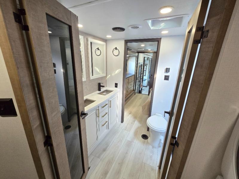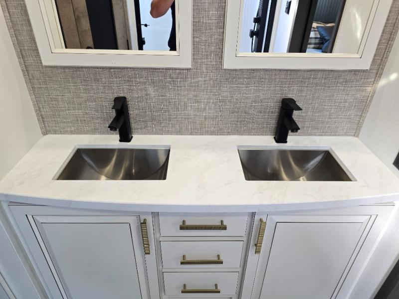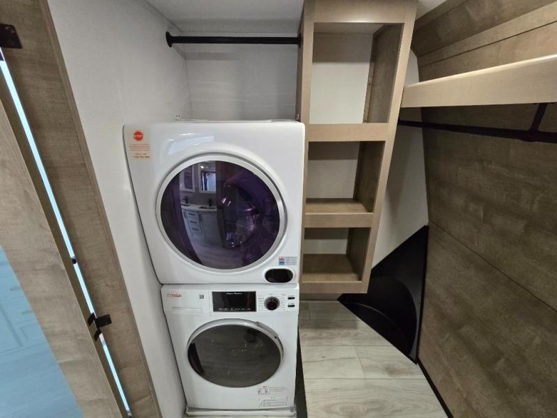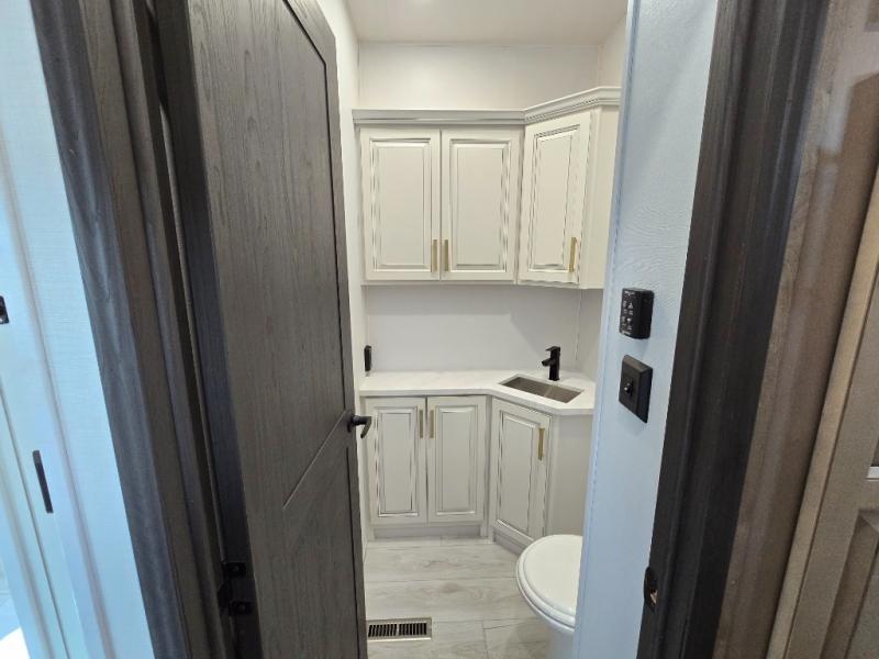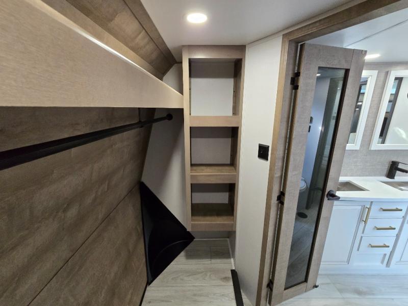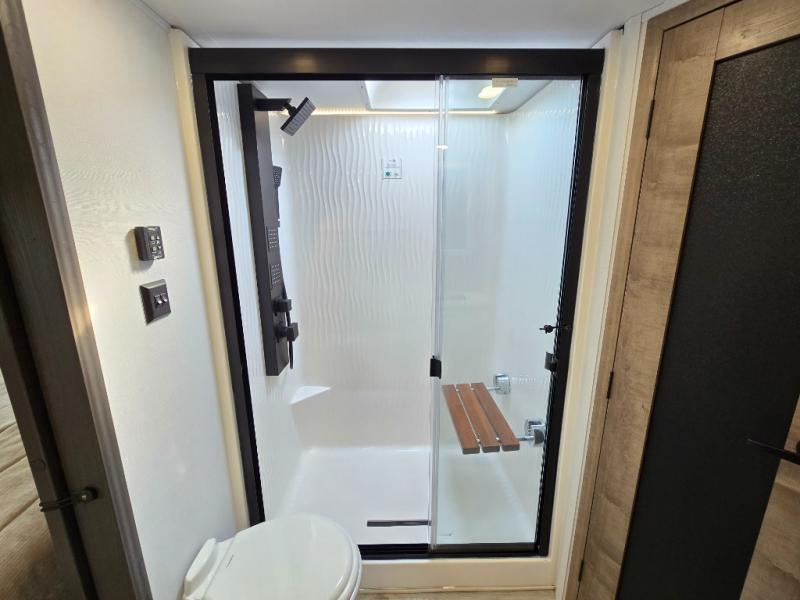 The perfect RV when you like to take "home"' with you when you travel! This Montana fifth wheel gives you the space you want and it feels like home with plenty of features to love and keep you comfortable when you are out enjoying your adventures. Five slides in total give each space plenty of room, the raised rear kitchen has everything you need to cook up meals and snacks just like at home. An 18 cu. ft. residential refrigerator with an ice maker, convection microwave oven and large sink, plus pantry space will make any chef happy. The mid-coach space just inside the door features a living room and half bath for convenience. There is also a dinette with storage within the roadside slide. Step up in front through a sliding barn door to a double slide space with a king bed and dresser. A second sliding barn door leads into the front spacious master bath featuring dual sinks, a 48" x 30" shower, and a large walk-in wardrobe with washer and dryer prep!