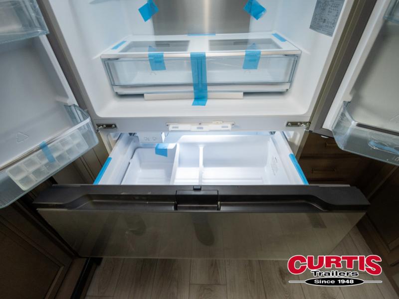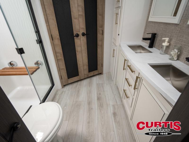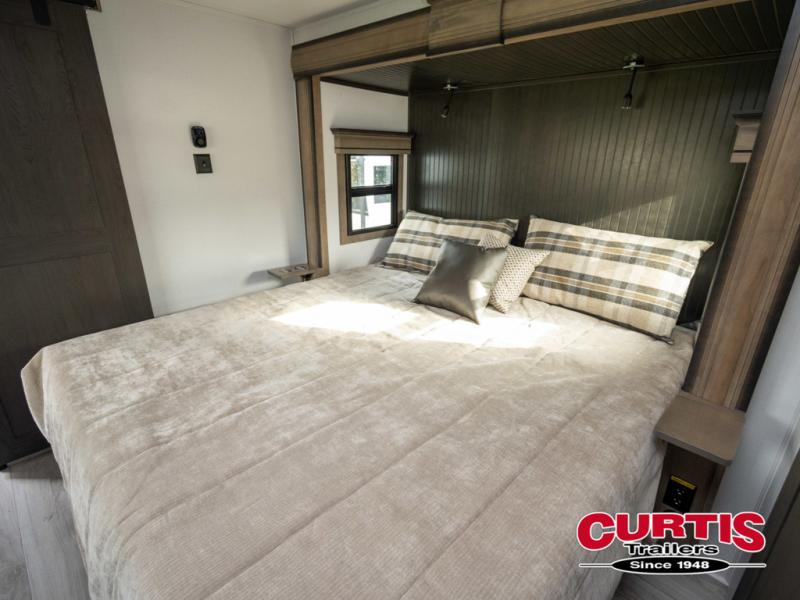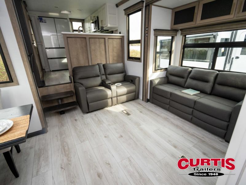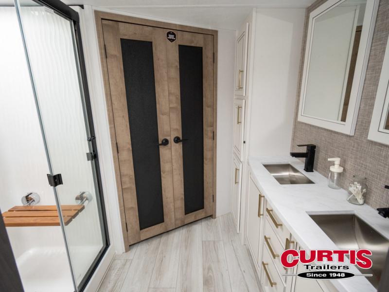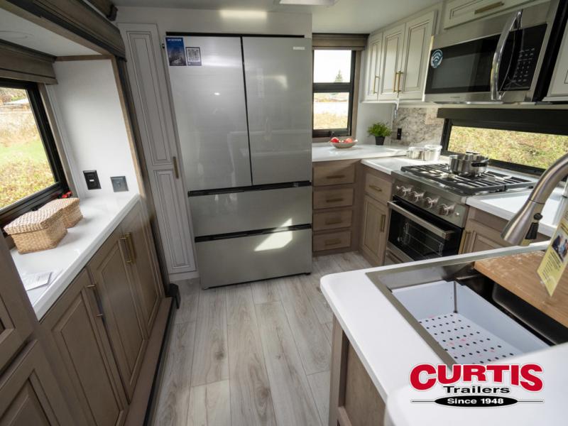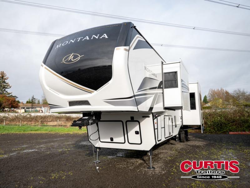 The perfect RV when you like to take "home"' with you when you travel! This Montana fifth wheel gives you the space you want and it feels like home with plenty of features to love and keep you comfortable when you are out enjoying your adventures. Five slides in total give each space plenty of room, the raised rear kitchen has everything you need to cook up meals and snacks just like at home. An 18 cu. ft. residential refrigerator with an ice maker, convection microwave oven and large sink, plus pantry space will make any chef happy. The mid-coach space just inside the door features a living room and half bath for convenience. There is also a dinette with storage within the roadside slide. Step up in front through a sliding barn door to a double slide space with a king bed and dresser. A second sliding barn door leads into the front spacious master bath featuring dual sinks, a 48" x 30" shower, and a large walk-in wardrobe with washer and dryer prep!