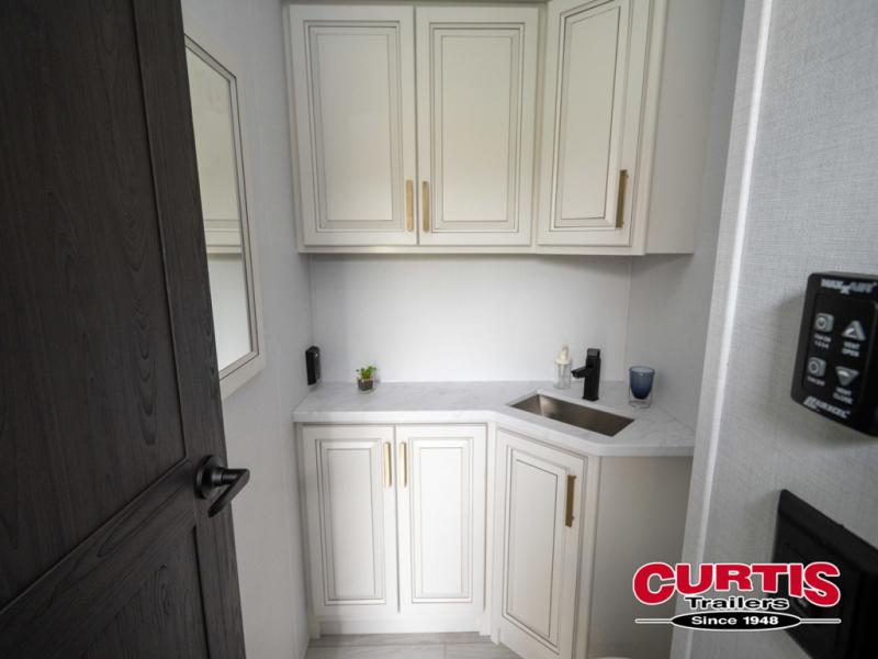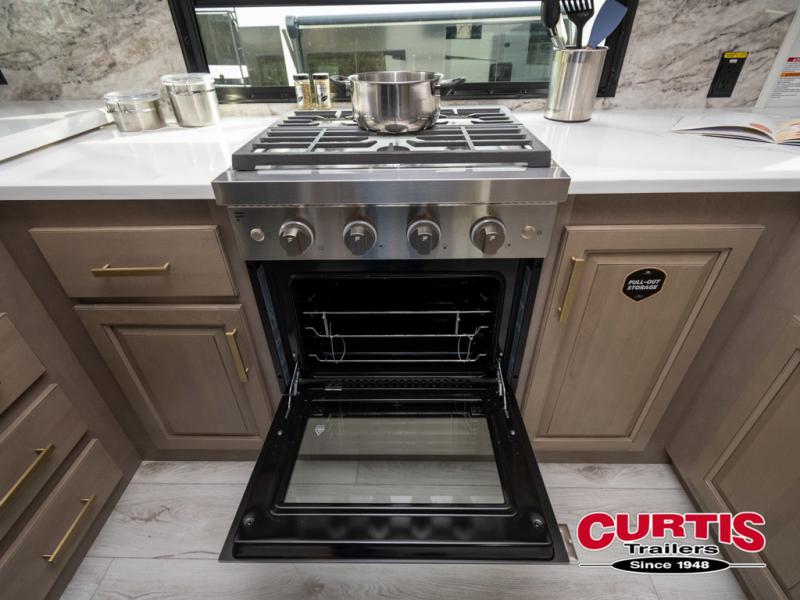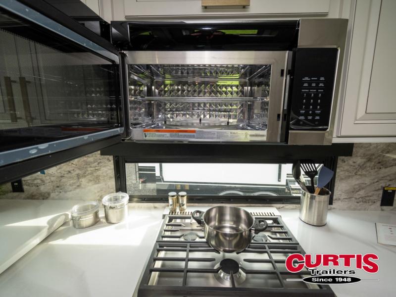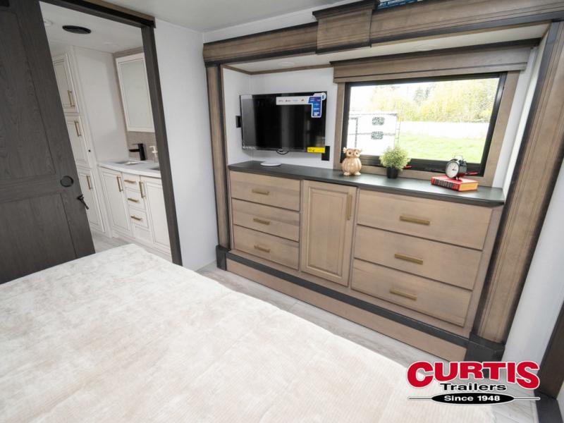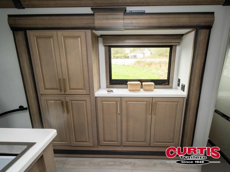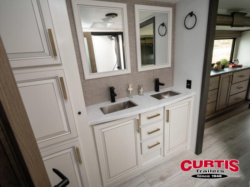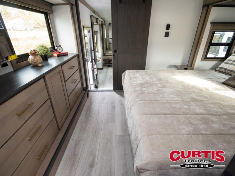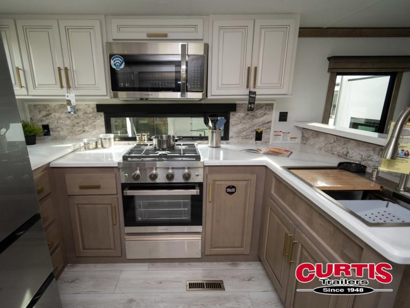 The perfect RV when you like to take "home"' with you when you travel! This Montana fifth wheel gives you the space you want and it feels like home with plenty of features to love and keep you comfortable when you are out enjoying your adventures. Five slides in total give each space plenty of room, the raised rear kitchen has everything you need to cook up meals and snacks just like at home. An 18 cu. ft. residential refrigerator with an ice maker, convection microwave oven and large sink, plus pantry space will make any chef happy. The mid-coach space just inside the door features a living room and half bath for convenience. There is also a dinette with storage within the roadside slide. Step up in front through a sliding barn door to a double slide space with a king bed and dresser. A second sliding barn door leads into the front spacious master bath featuring dual sinks, a 48" x 30" shower, and a large walk-in wardrobe with washer and dryer prep!