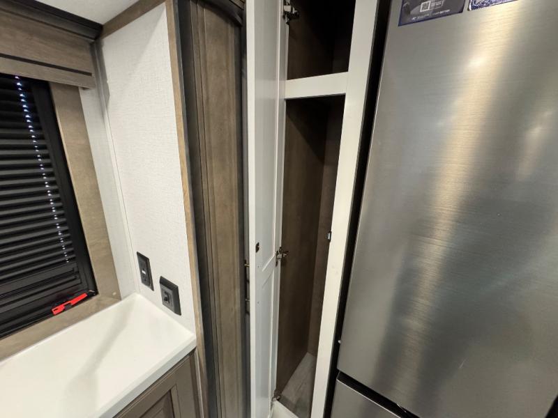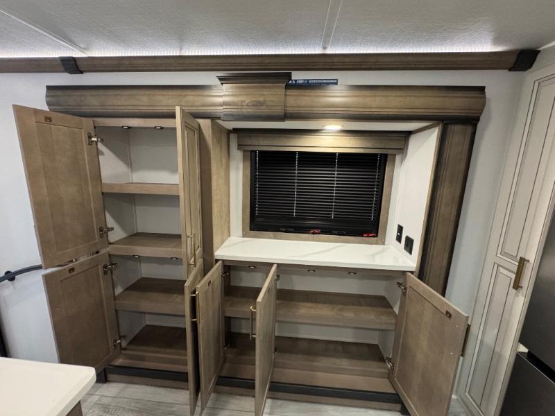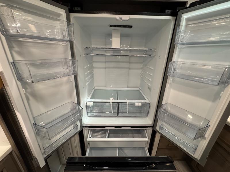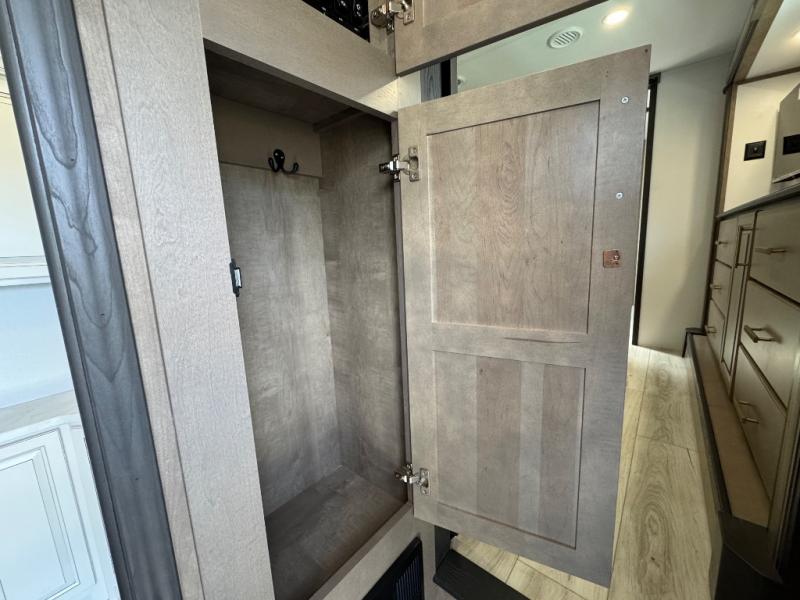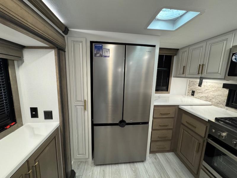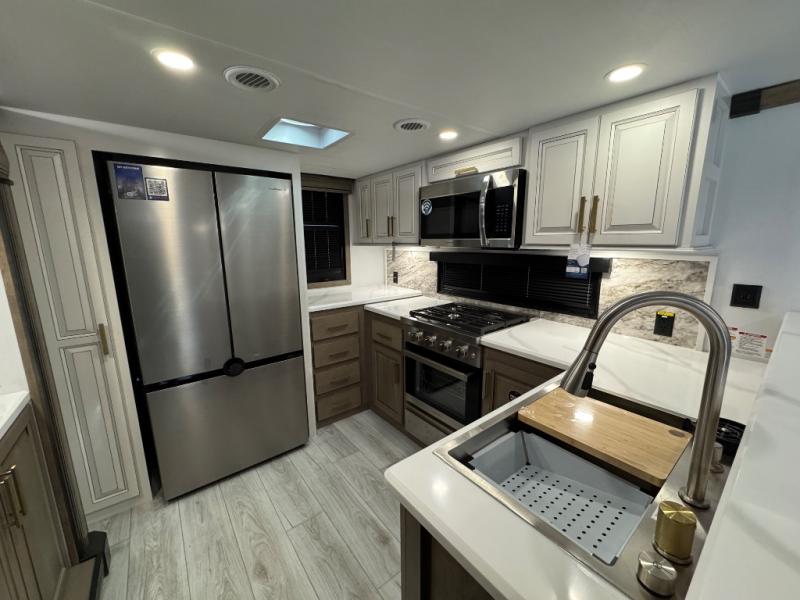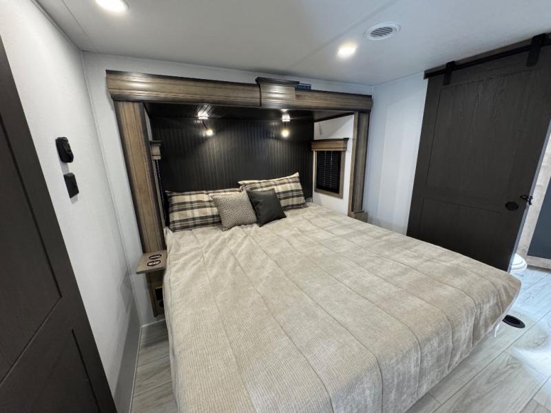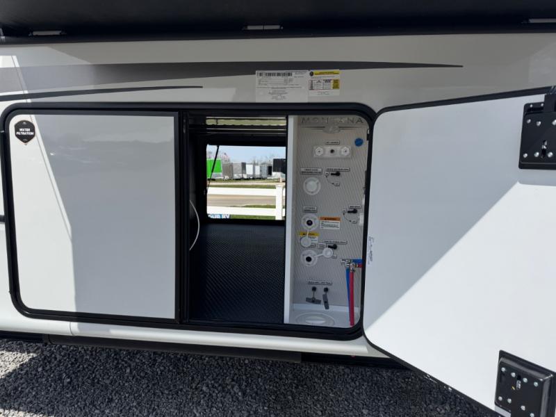 The perfect RV when you like to take "home"' with you when you travel! This Montana fifth wheel gives you the space you want and it feels like home with plenty of features to love and keep you comfortable when you are out enjoying your adventures. Five slides in total give each space plenty of room, the raised rear kitchen has everything you need to cook up meals and snacks just like at home. An 18 cu. ft. residential refrigerator with an ice maker, convection microwave oven and large sink, plus pantry space will make any chef happy. The mid-coach space just inside the door features a living room and half bath for convenience. There is also a dinette with storage within the roadside slide. Step up in front through a sliding barn door to a double slide space with a king bed and dresser. A second sliding barn door leads into the front spacious master bath featuring dual sinks, a 48" x 30" shower, and a large walk-in wardrobe with washer and dryer prep!