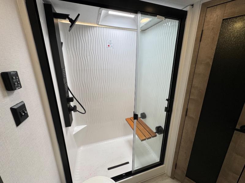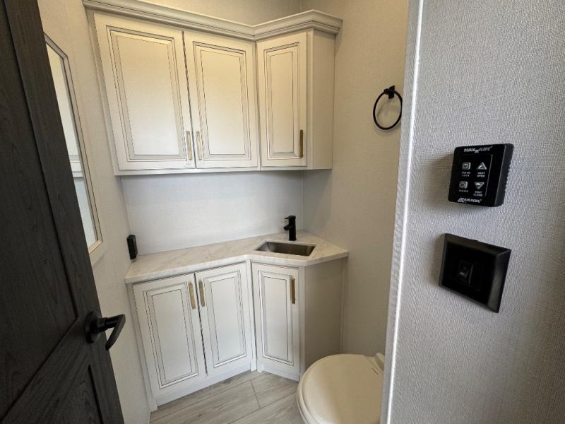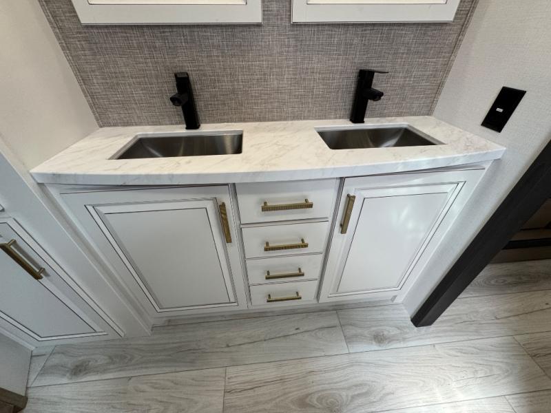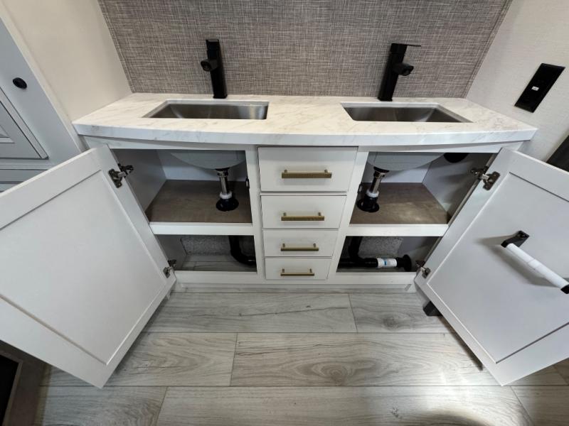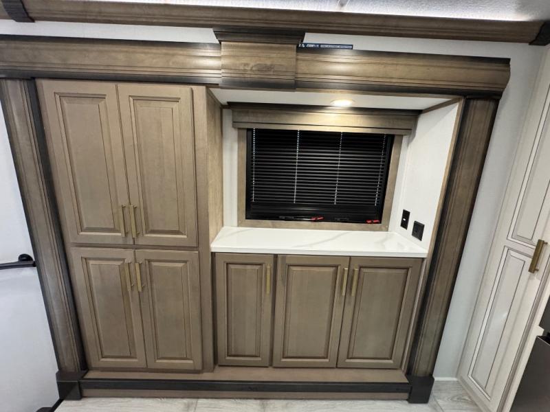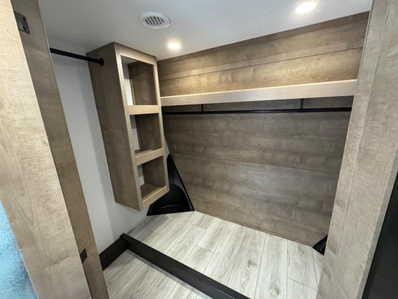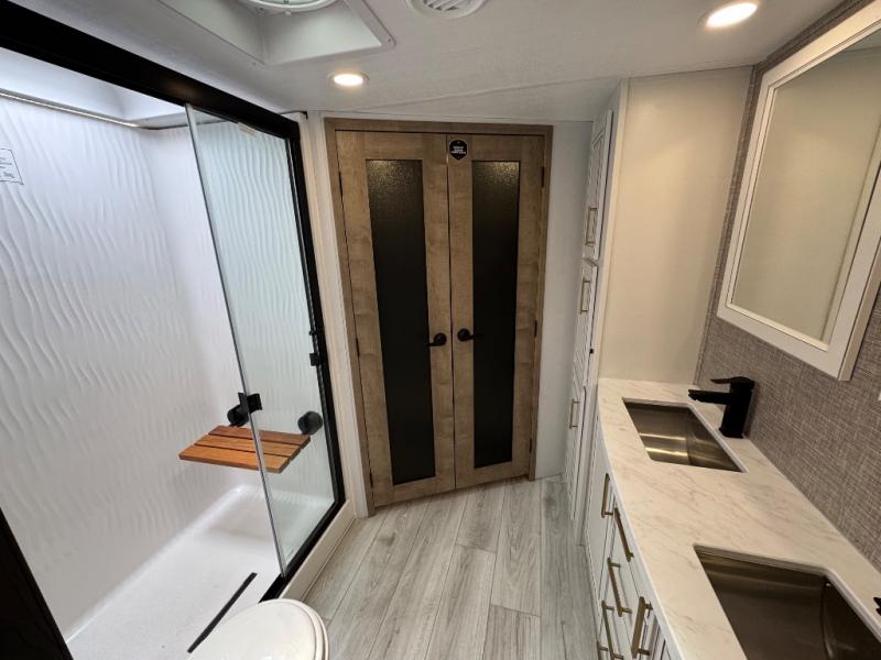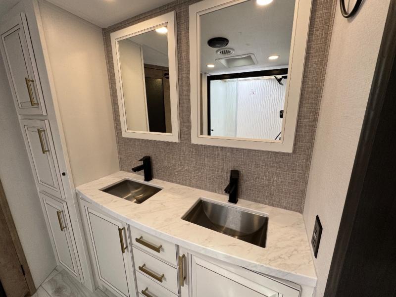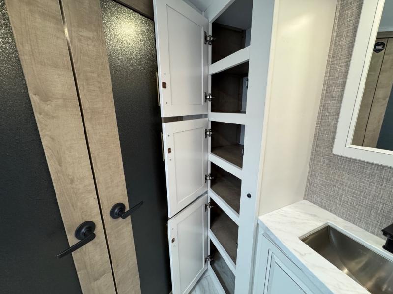 The perfect RV when you like to take "home"' with you when you travel! This Montana fifth wheel gives you the space you want and it feels like home with plenty of features to love and keep you comfortable when you are out enjoying your adventures. Five slides in total give each space plenty of room, the raised rear kitchen has everything you need to cook up meals and snacks just like at home. An 18 cu. ft. residential refrigerator with an ice maker, convection microwave oven and large sink, plus pantry space will make any chef happy. The mid-coach space just inside the door features a living room and half bath for convenience. There is also a dinette with storage within the roadside slide. Step up in front through a sliding barn door to a double slide space with a king bed and dresser. A second sliding barn door leads into the front spacious master bath featuring dual sinks, a 48" x 30" shower, and a large walk-in wardrobe with washer and dryer prep!