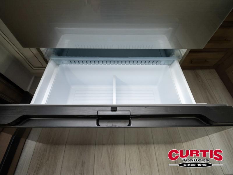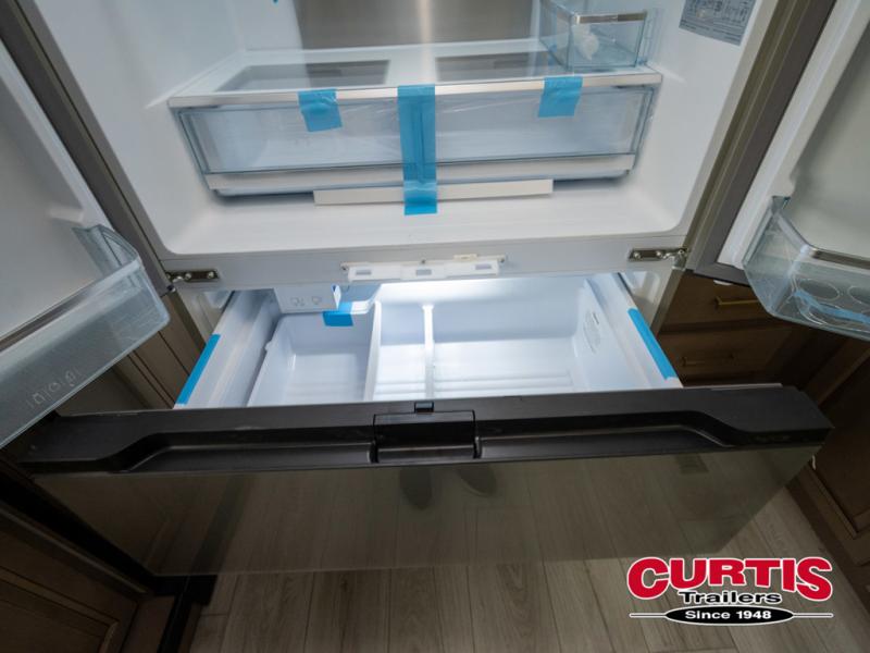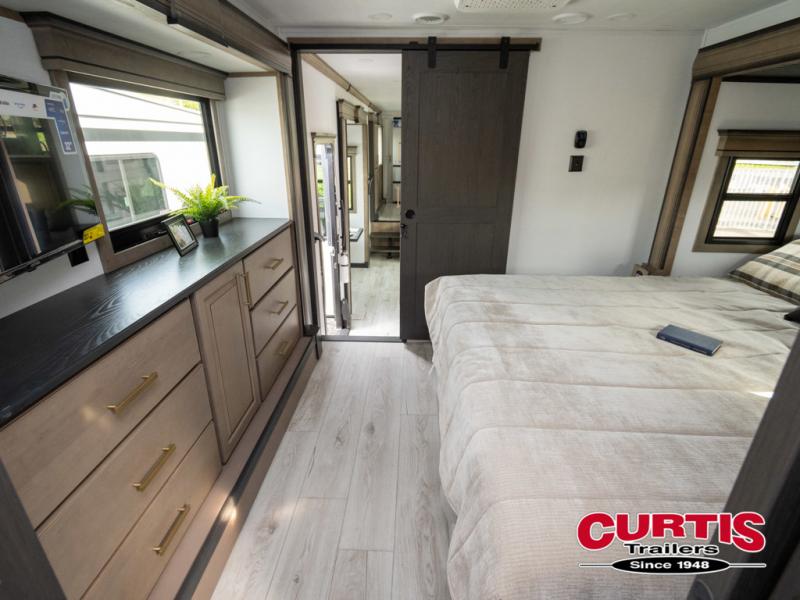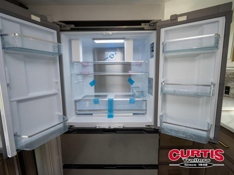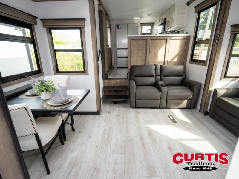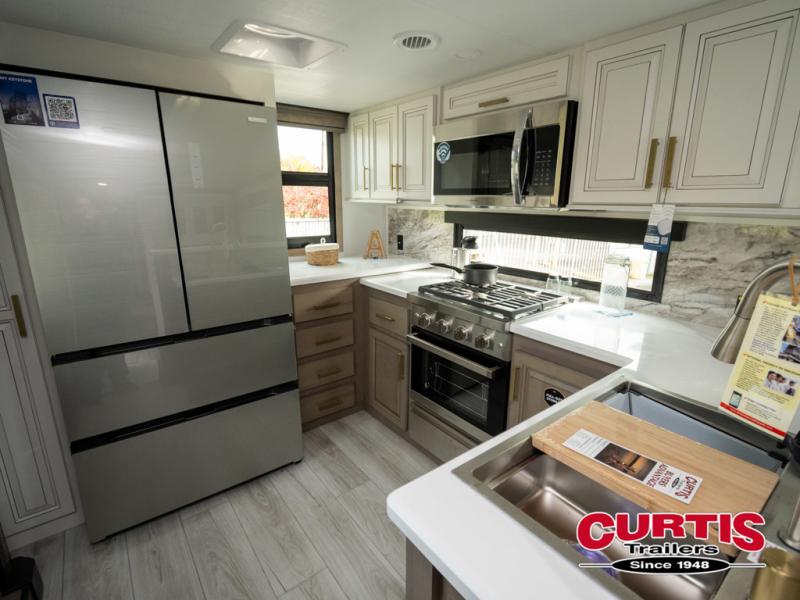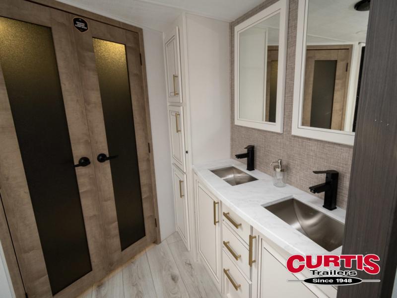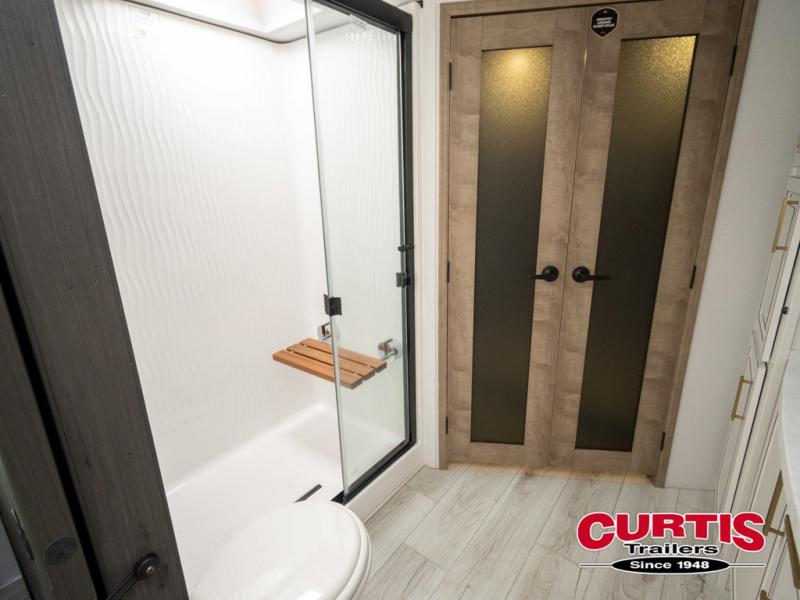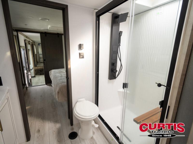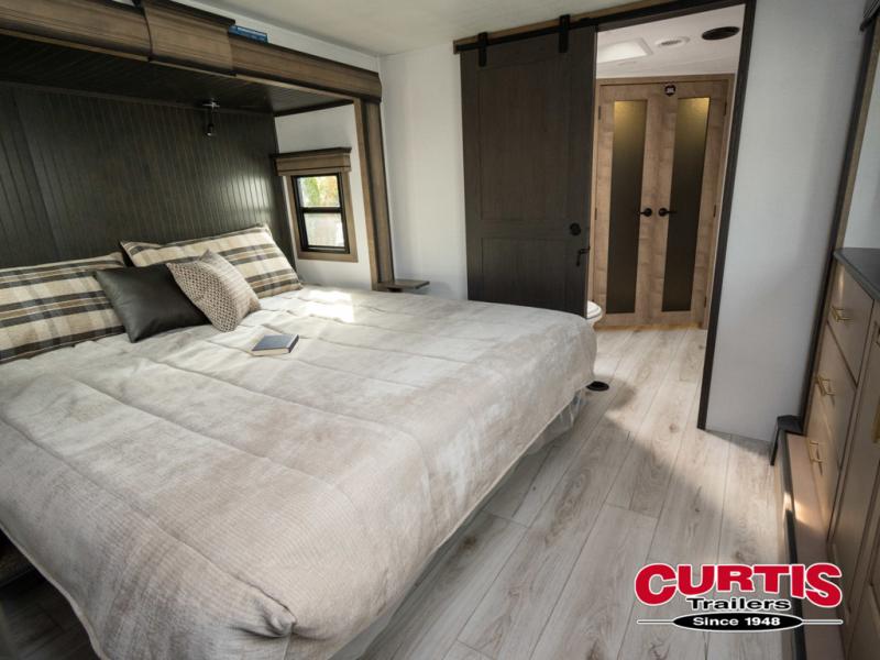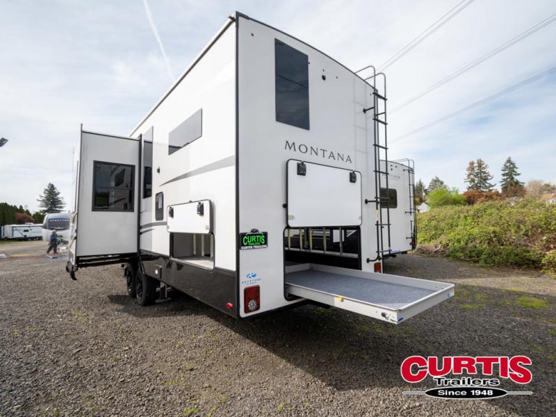 The perfect RV when you like to take "home"' with you when you travel! This Montana fifth wheel gives you the space you want and it feels like home with plenty of features to love and keep you comfortable when you are out enjoying your adventures. Five slides in total give each space plenty of room, the raised rear kitchen has everything you need to cook up meals and snacks just like at home. An 18 cu. ft. residential refrigerator with an ice maker, convection microwave oven and large sink, plus pantry space will make any chef happy. The mid-coach space just inside the door features a living room and half bath for convenience. There is also a dinette with storage within the roadside slide. Step up in front through a sliding barn door to a double slide space with a king bed and dresser. A second sliding barn door leads into the front spacious master bath featuring dual sinks, a 48" x 30" shower, and a large walk-in wardrobe with washer and dryer prep!