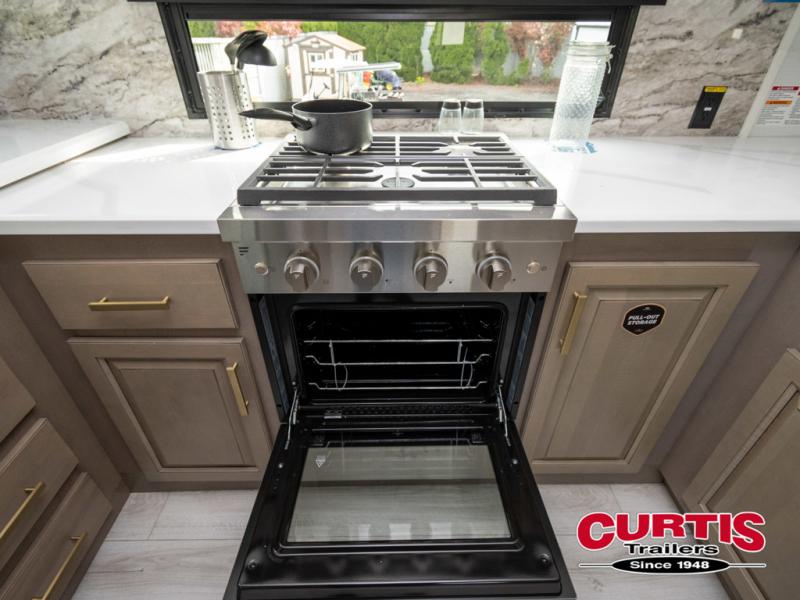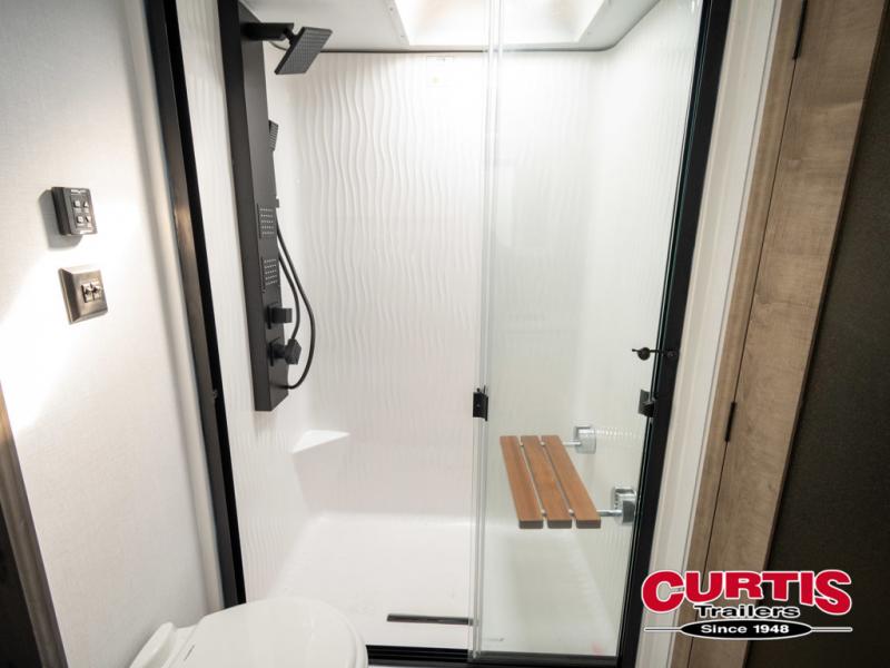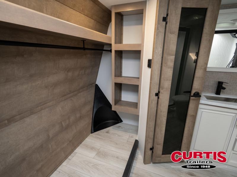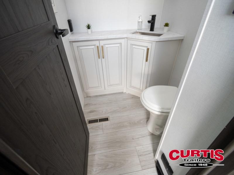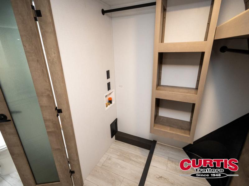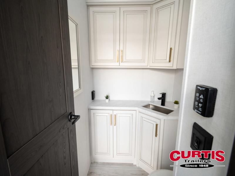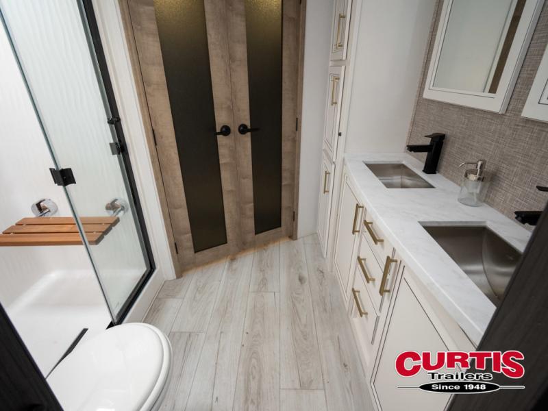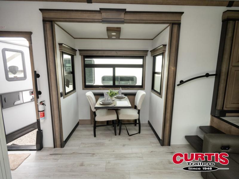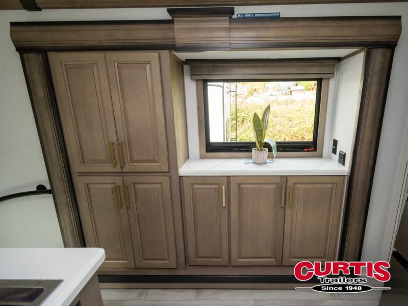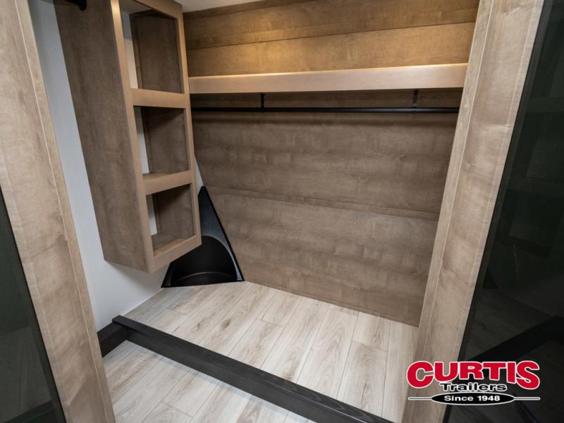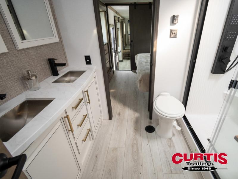 The perfect RV when you like to take "home"' with you when you travel! This Montana fifth wheel gives you the space you want and it feels like home with plenty of features to love and keep you comfortable when you are out enjoying your adventures. Five slides in total give each space plenty of room, the raised rear kitchen has everything you need to cook up meals and snacks just like at home. An 18 cu. ft. residential refrigerator with an ice maker, convection microwave oven and large sink, plus pantry space will make any chef happy. The mid-coach space just inside the door features a living room and half bath for convenience. There is also a dinette with storage within the roadside slide. Step up in front through a sliding barn door to a double slide space with a king bed and dresser. A second sliding barn door leads into the front spacious master bath featuring dual sinks, a 48" x 30" shower, and a large walk-in wardrobe with washer and dryer prep!