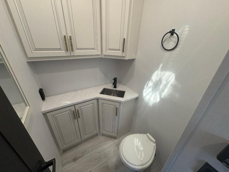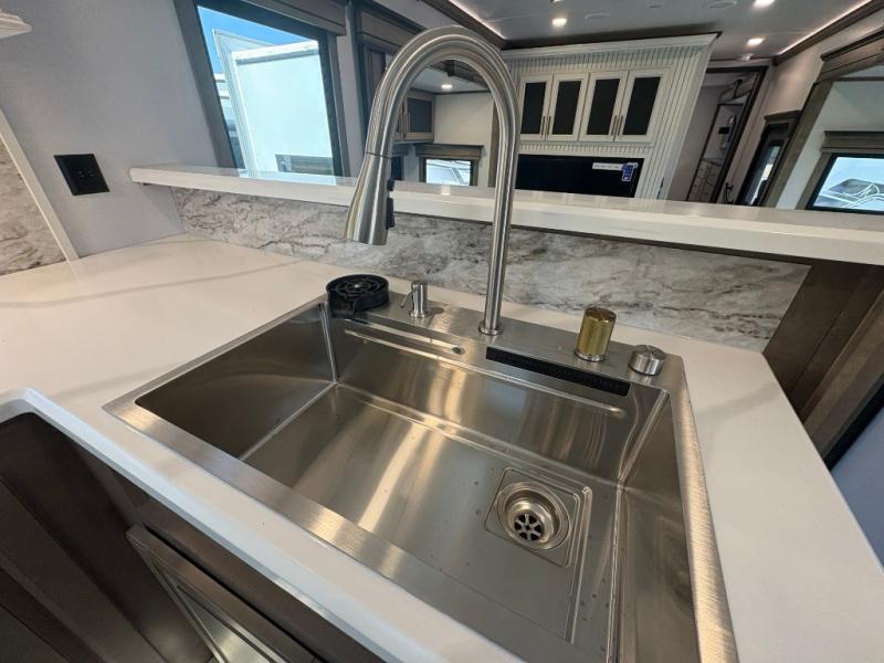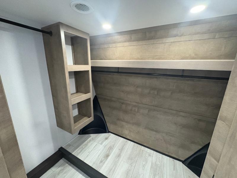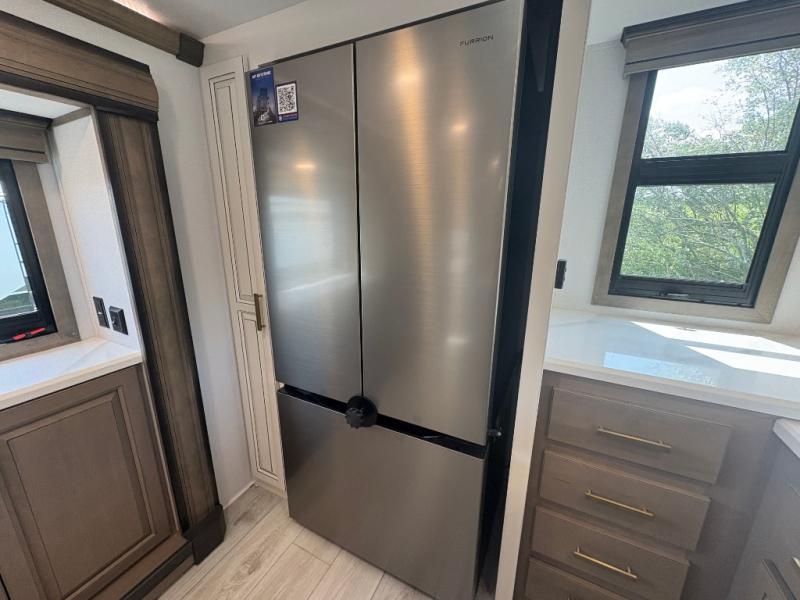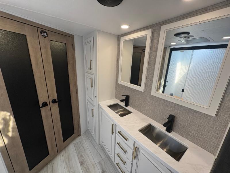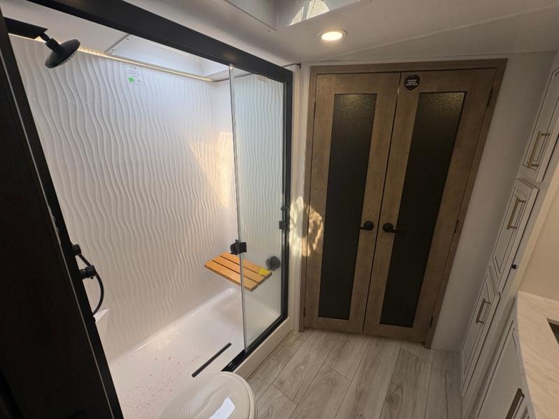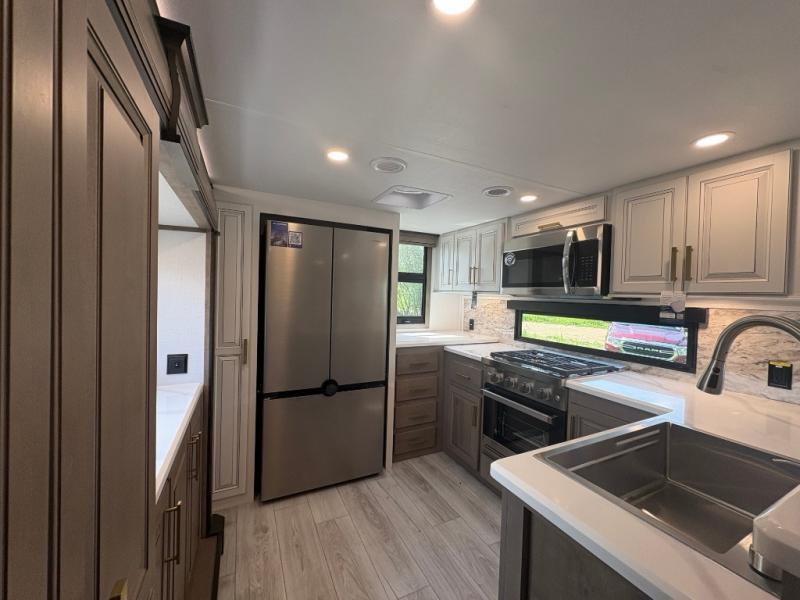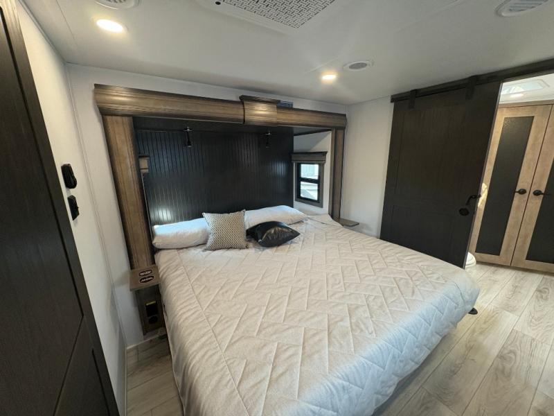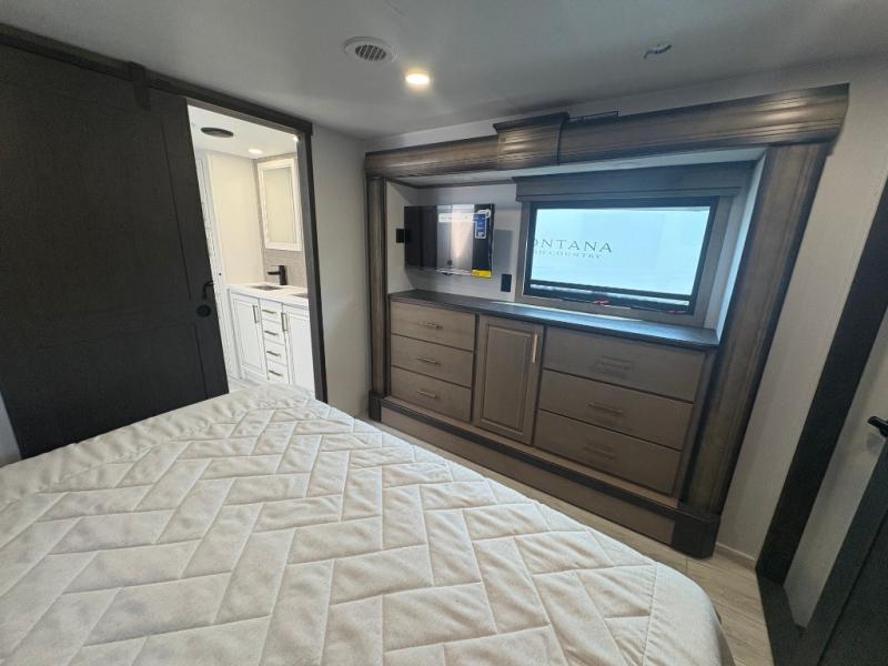 The perfect RV when you like to take "home"' with you when you travel! This Montana fifth wheel gives you the space you want and it feels like home with plenty of features to love and keep you comfortable when you are out enjoying your adventures. Five slides in total give each space plenty of room, the raised rear kitchen has everything you need to cook up meals and snacks just like at home. An 18 cu. ft. residential refrigerator with an ice maker, convection microwave oven and large sink, plus pantry space will make any chef happy. The mid-coach space just inside the door features a living room and half bath for convenience. There is also a dinette with storage within the roadside slide. Step up in front through a sliding barn door to a double slide space with a king bed and dresser. A second sliding barn door leads into the front spacious master bath featuring dual sinks, a 48" x 30" shower, and a large walk-in wardrobe with washer and dryer prep!