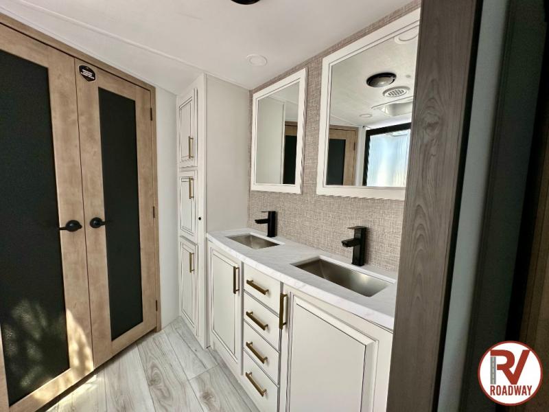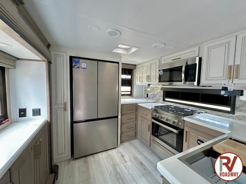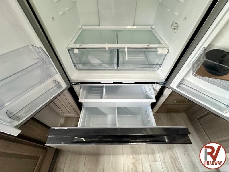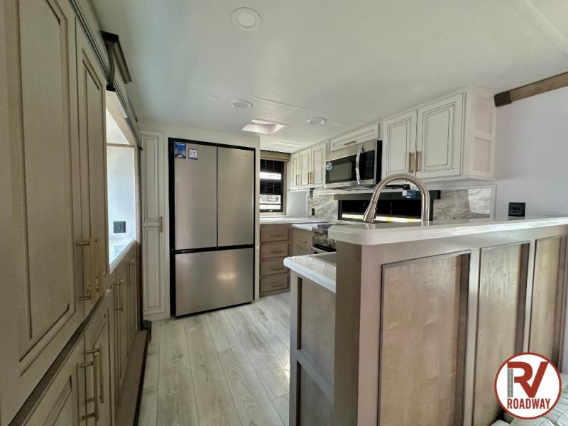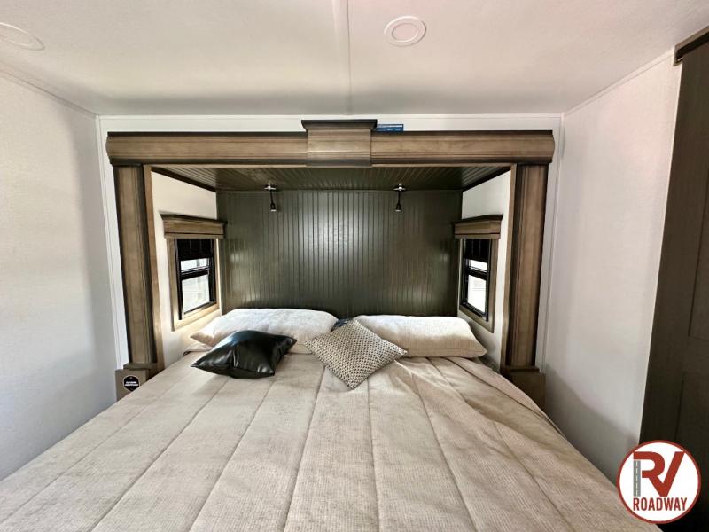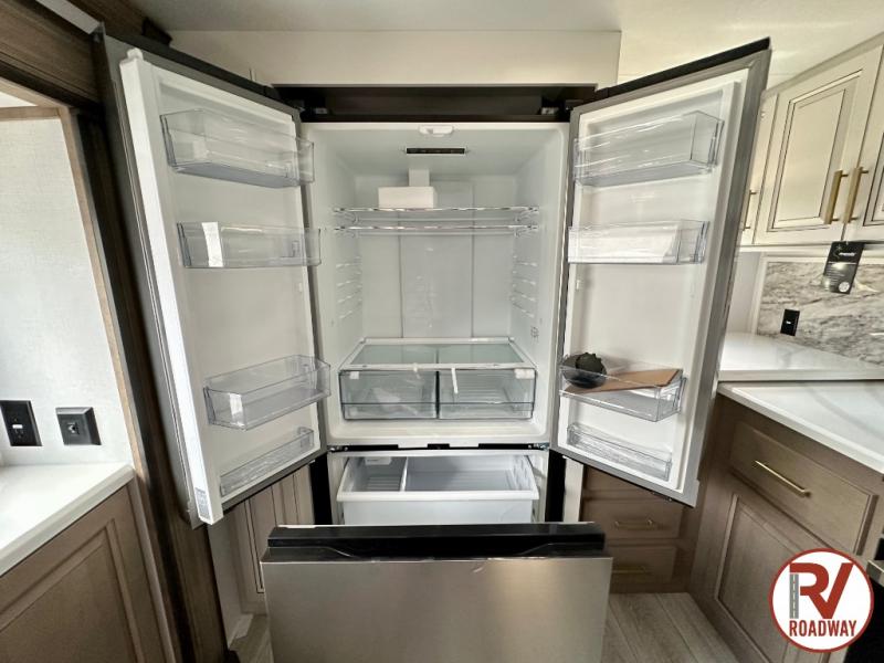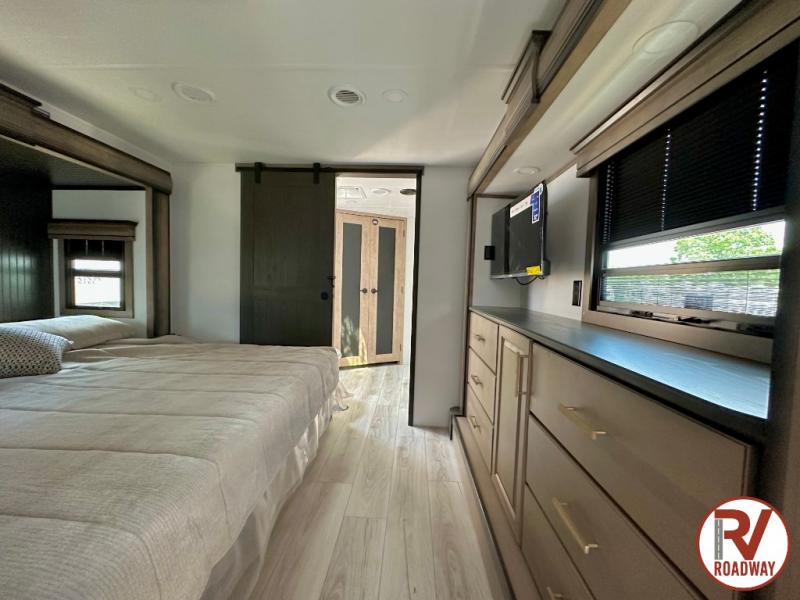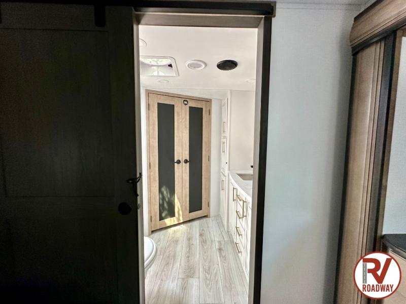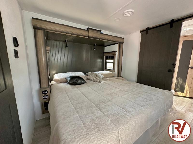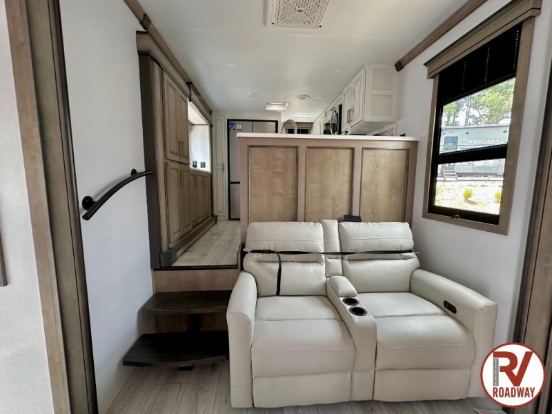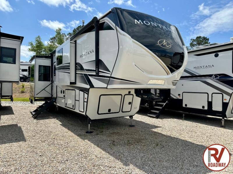 The perfect RV when you like to take "home"' with you when you travel! This Montana fifth wheel gives you the space you want and it feels like home with plenty of features to love and keep you comfortable when you are out enjoying your adventures. Five slides in total give each space plenty of room, the raised rear kitchen has everything you need to cook up meals and snacks just like at home. An 18 cu. ft. residential refrigerator with an ice maker, convection microwave oven and large sink, plus pantry space will make any chef happy. The mid-coach space just inside the door features a living room and half bath for convenience. There is also a dinette with storage within the roadside slide. Step up in front through a sliding barn door to a double slide space with a king bed and dresser. A second sliding barn door leads into the front spacious master bath featuring dual sinks, a 48" x 30" shower, and a large walk-in wardrobe with washer and dryer prep!