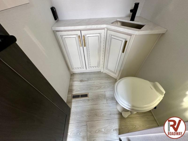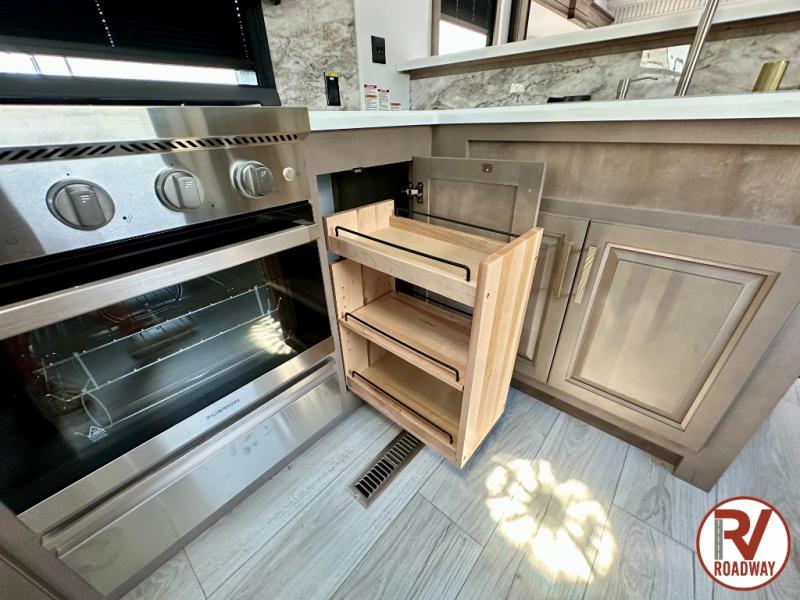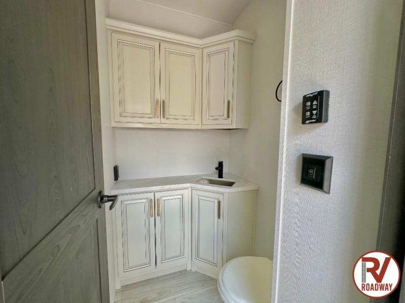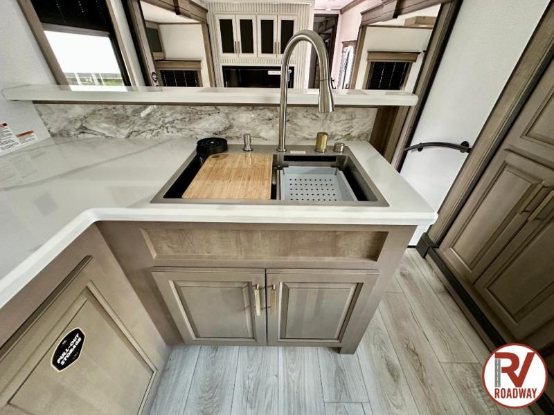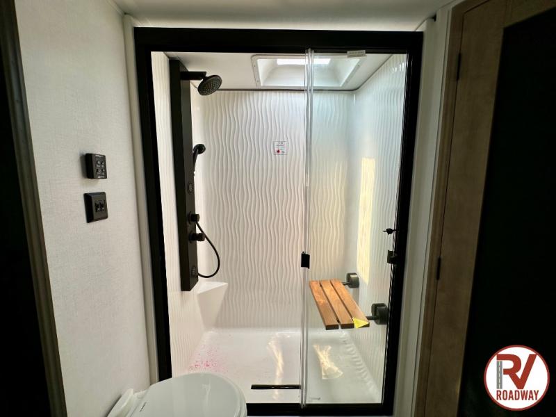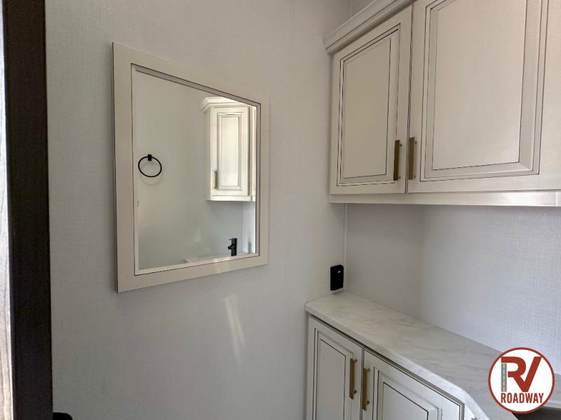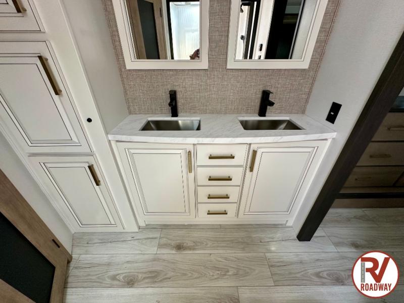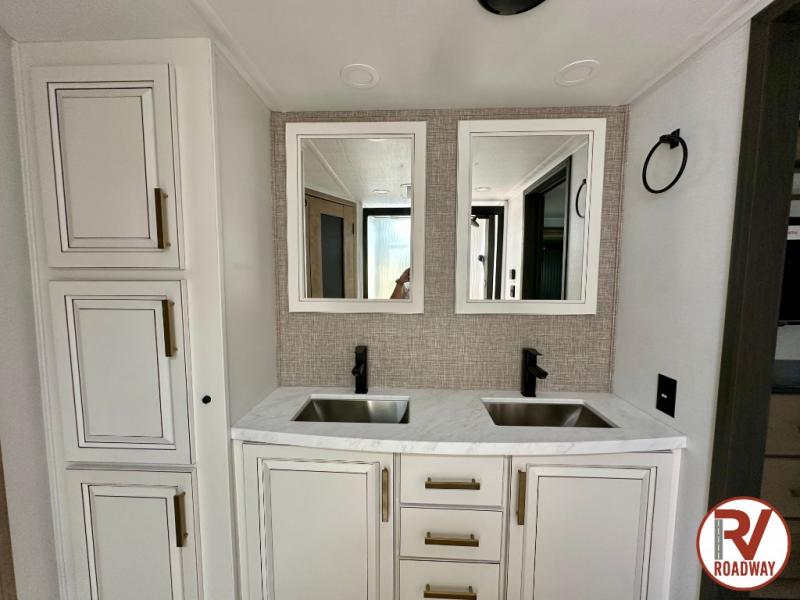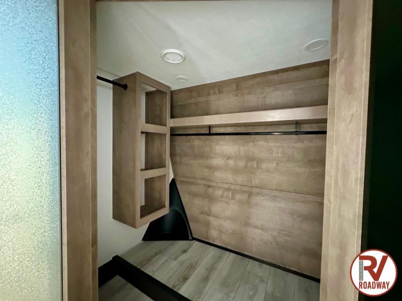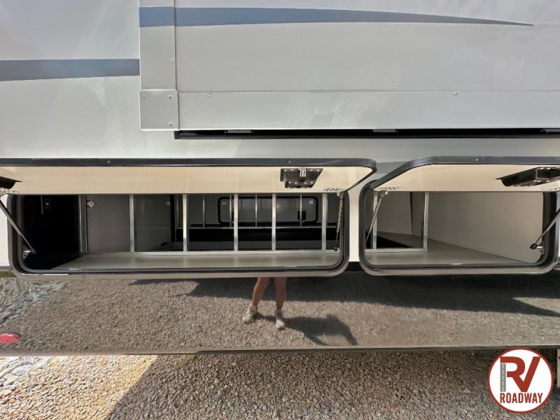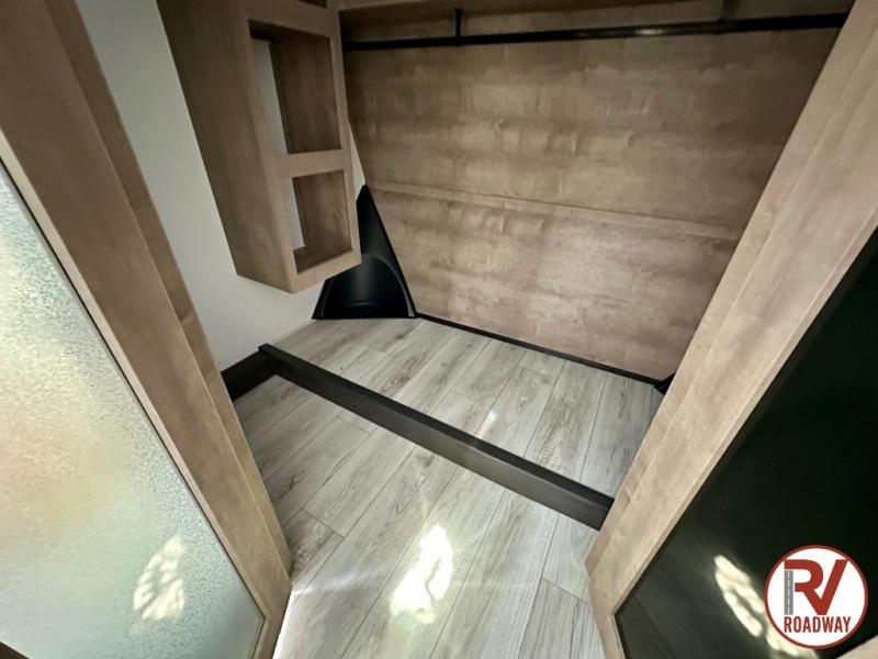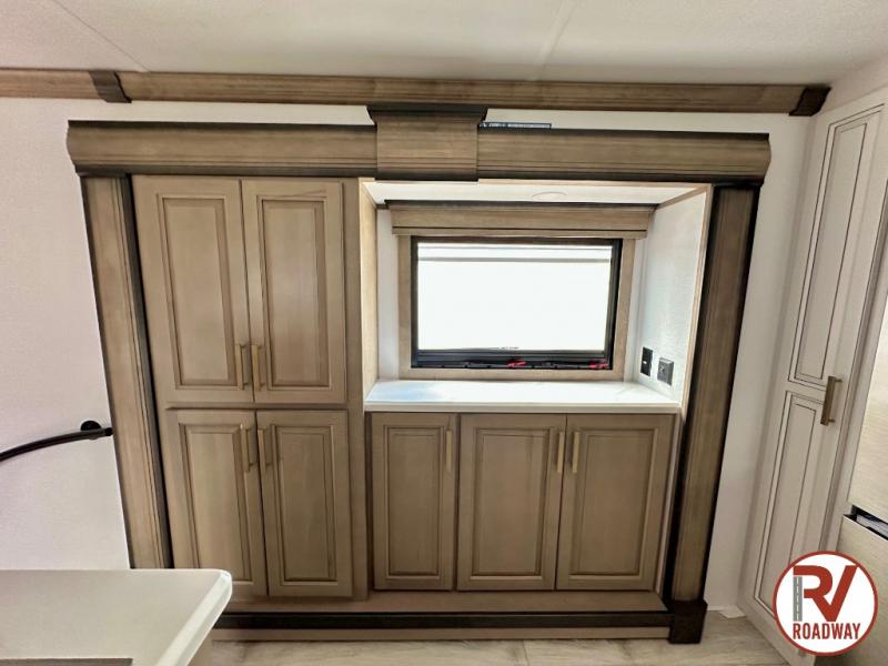 The perfect RV when you like to take "home"' with you when you travel! This Montana fifth wheel gives you the space you want and it feels like home with plenty of features to love and keep you comfortable when you are out enjoying your adventures. Five slides in total give each space plenty of room, the raised rear kitchen has everything you need to cook up meals and snacks just like at home. An 18 cu. ft. residential refrigerator with an ice maker, convection microwave oven and large sink, plus pantry space will make any chef happy. The mid-coach space just inside the door features a living room and half bath for convenience. There is also a dinette with storage within the roadside slide. Step up in front through a sliding barn door to a double slide space with a king bed and dresser. A second sliding barn door leads into the front spacious master bath featuring dual sinks, a 48" x 30" shower, and a large walk-in wardrobe with washer and dryer prep!