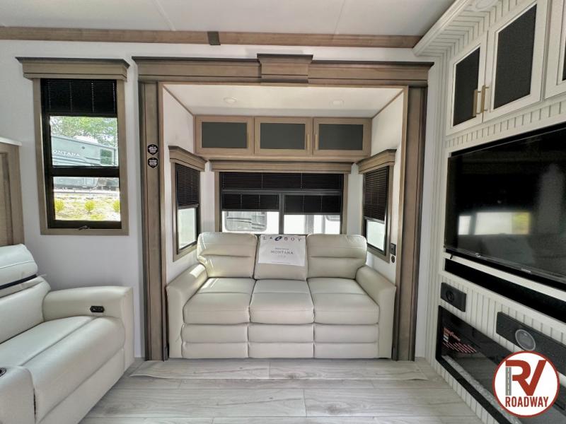 Enjoy luxury, innovation, and the outdoors in any one of Montana's finest fifth wheels. Each set the standard with exceptional features, and exciting factory installed options to provide you a great home on the road. Keystone's exclusive 12" I-beam chassis with z-frame technology has been reengineered to be stronger, lighter and built for "the long haul". A few other construction features you will appreciate include a Road Armor suspension, 2" thick, dual-layered lauan high gloss fiberglass sidewalls, a MaxTurn front cap with KeyShield automotive-grade paint, and a fully walkable roof with an Alpha seamless TPO membrane system. Each feature stylish interiors with two decor choices paired with beautiful hardwood cabinetry, vinyl flooring throughout, central vacuum, plus a La-Z-Boy furniture package for all-around comfort!