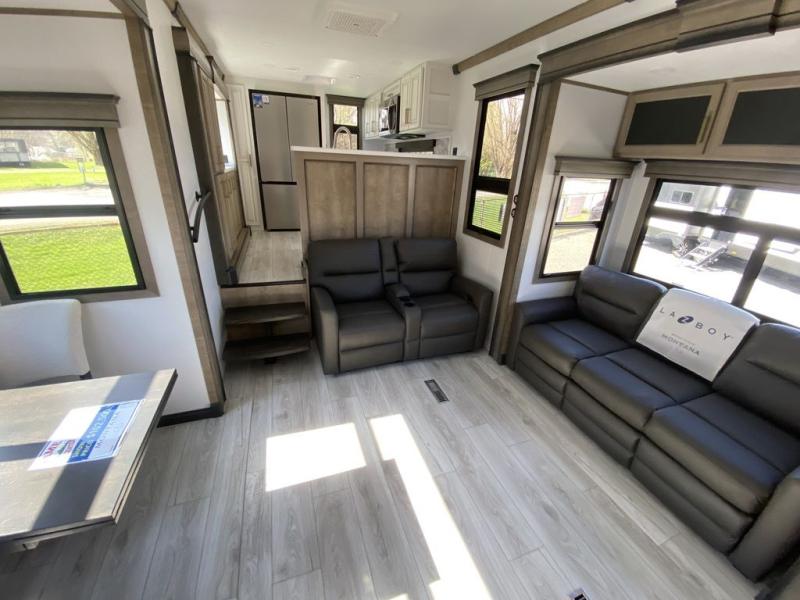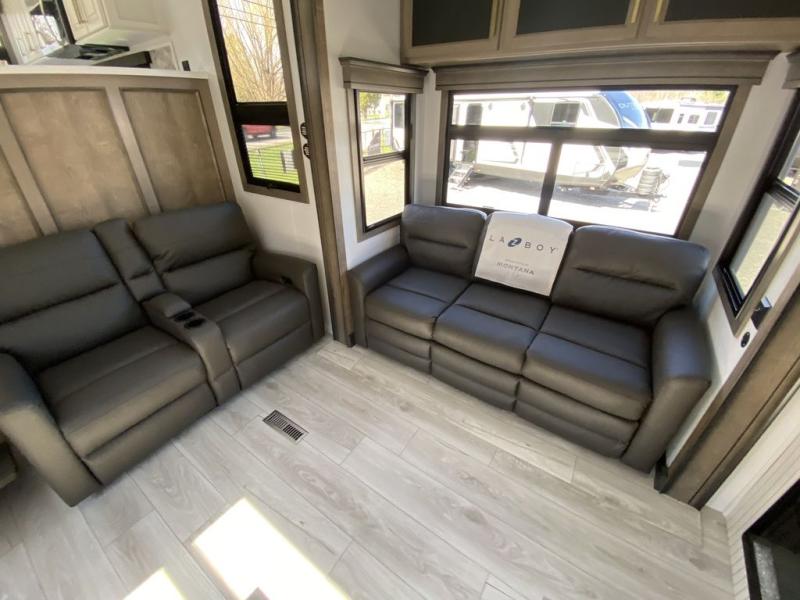 Enjoy luxury, innovation, and the outdoors in any one of Montana's finest fifth wheels. Each set the standard with exceptional features, and exciting factory installed options to provide you a great home on the road. Keystone's exclusive 12" I-beam chassis with z-frame technology has been reengineered to be stronger, lighter and built for "the long haul". A few other construction features you will appreciate include a Road Armor suspension, 2" thick, dual-layered lauan high gloss fiberglass sidewalls, a MaxTurn front cap with KeyShield automotive-grade paint, and a fully walkable roof with an Alpha seamless TPO membrane system. Each feature stylish interiors with two decor choices paired with beautiful hardwood cabinetry, vinyl flooring throughout, central vacuum, plus a La-Z-Boy furniture package for all-around comfort!