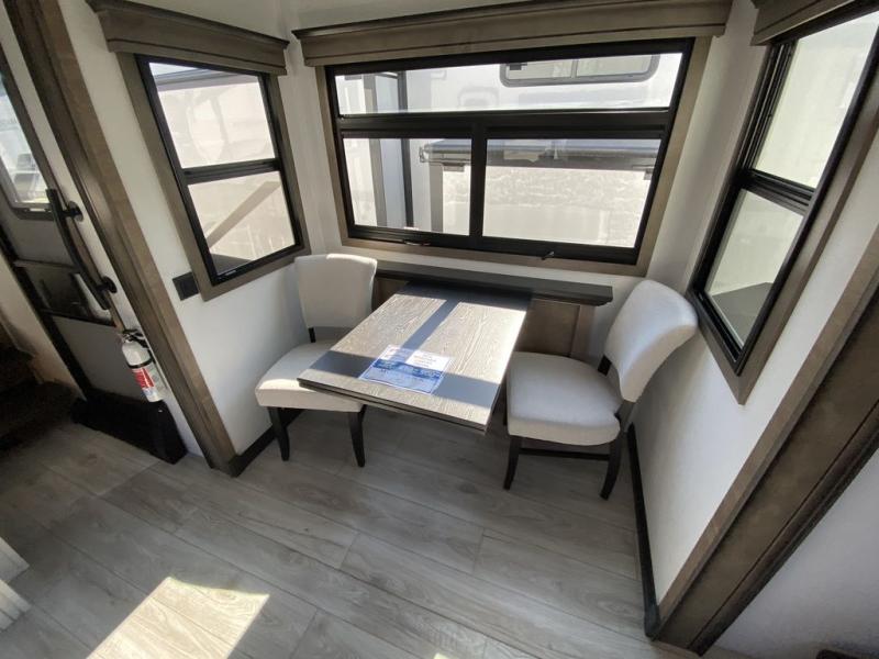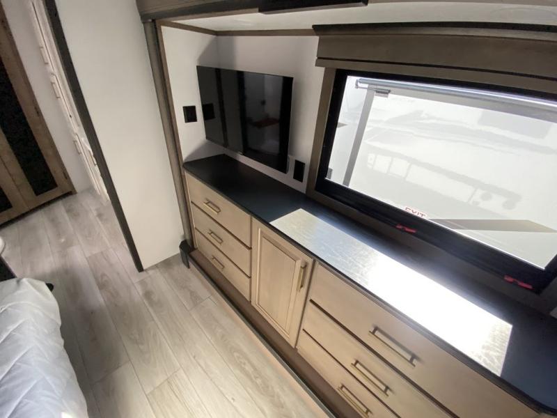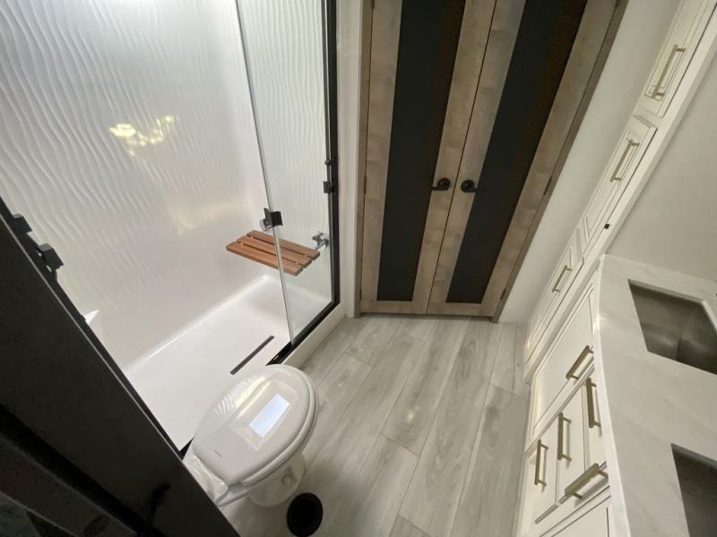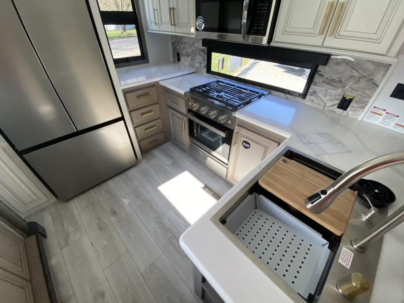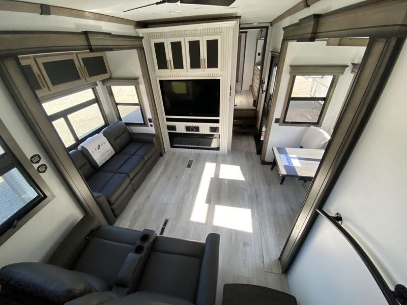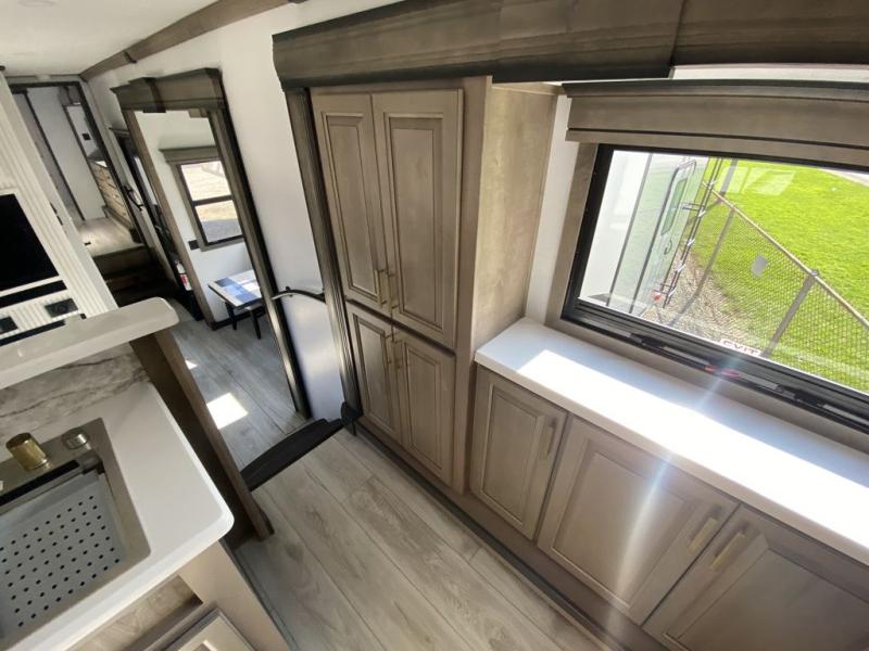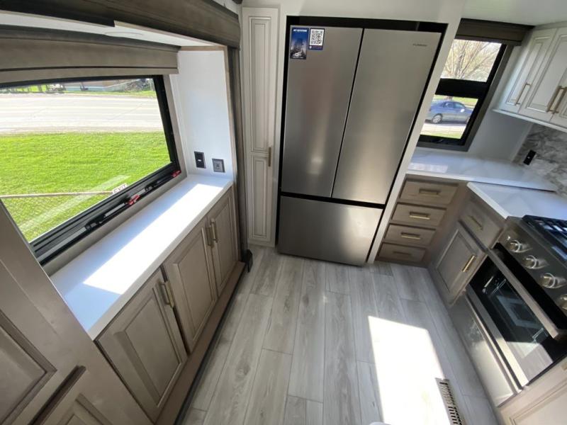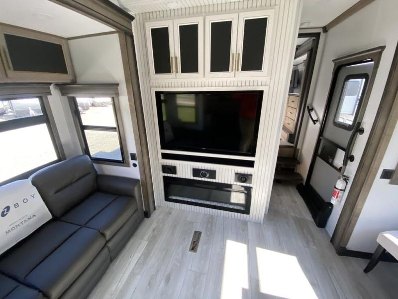 The perfect RV when you like to take "home"' with you when you travel! This Montana fifth wheel gives you the space you want and it feels like home with plenty of features to love and keep you comfortable when you are out enjoying your adventures. Five slides in total give each space plenty of room, the raised rear kitchen has everything you need to cook up meals and snacks just like at home. An 18 cu. ft. residential refrigerator with an ice maker, convection microwave oven and large sink, plus pantry space will make any chef happy. The mid-coach space just inside the door features a living room and half bath for convenience. There is also a dinette with storage within the roadside slide. Step up in front through a sliding barn door to a double slide space with a king bed and dresser. A second sliding barn door leads into the front spacious master bath featuring dual sinks, a 48" x 30" shower, and a large walk-in wardrobe with washer and dryer prep!