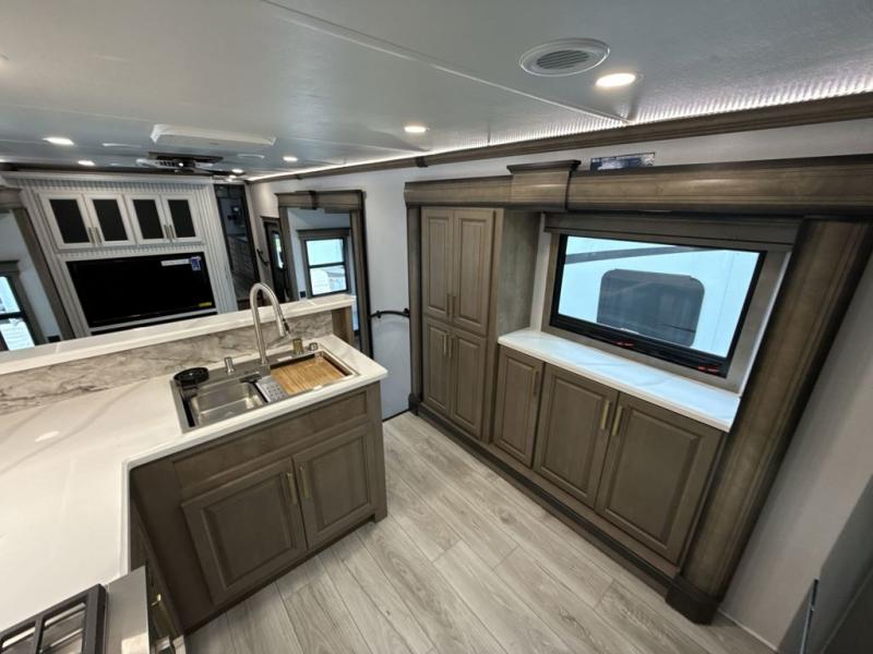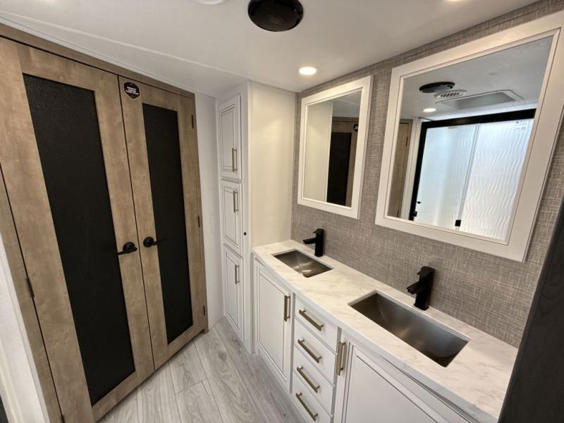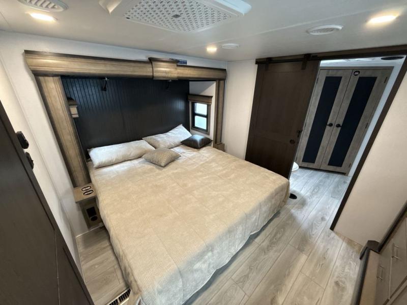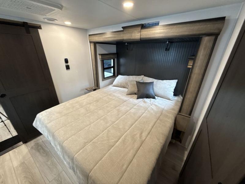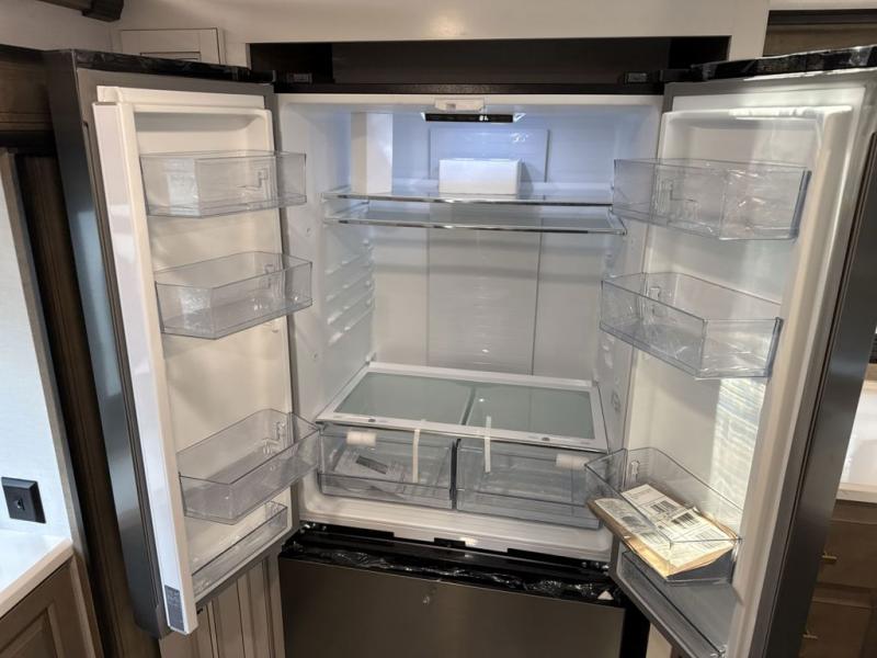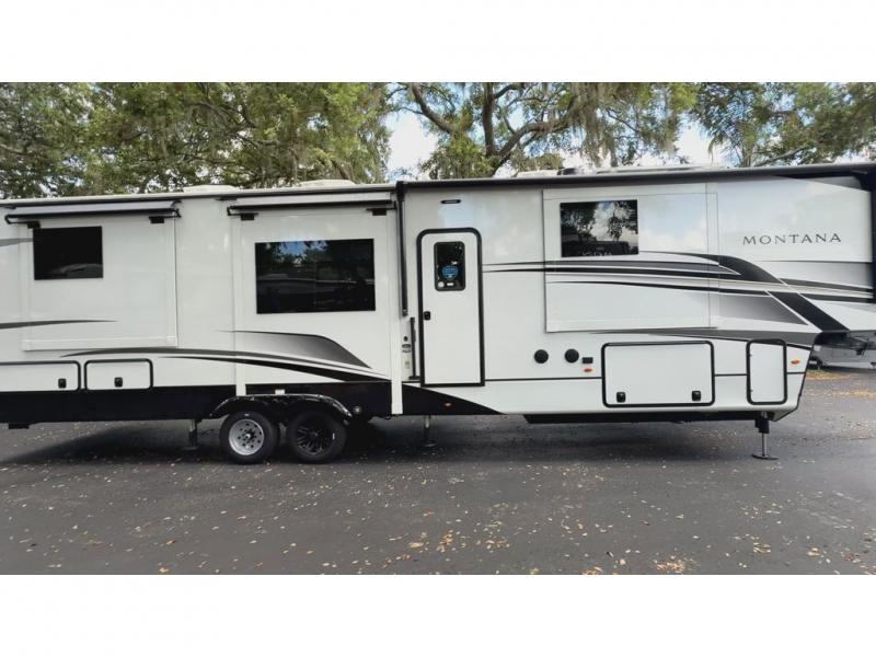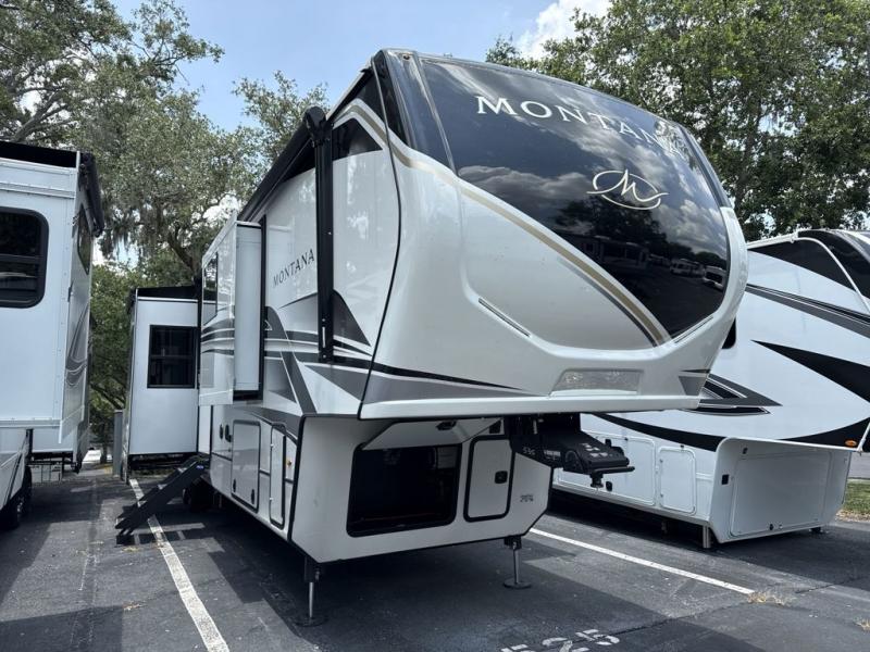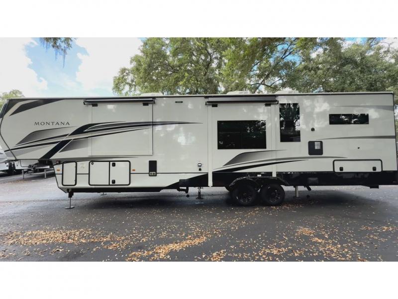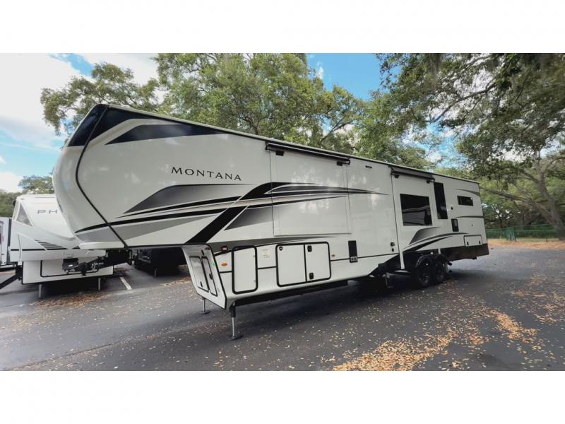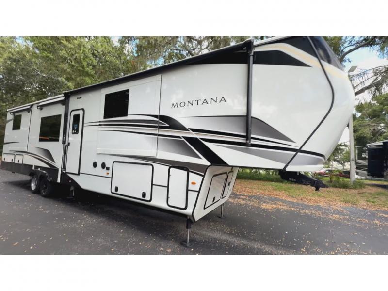 The perfect RV when you like to take "home"' with you when you travel! This Montana fifth wheel gives you the space you want and it feels like home with plenty of features to love and keep you comfortable when you are out enjoying your adventures. Five slides in total give each space plenty of room, the raised rear kitchen has everything you need to cook up meals and snacks just like at home. An 18 cu. ft. residential refrigerator with an ice maker, convection microwave oven and large sink, plus pantry space will make any chef happy. The mid-coach space just inside the door features a living room and half bath for convenience. There is also a dinette with storage within the roadside slide. Step up in front through a sliding barn door to a double slide space with a king bed and dresser. A second sliding barn door leads into the front spacious master bath featuring dual sinks, a 48" x 30" shower, and a large walk-in wardrobe with washer and dryer prep!