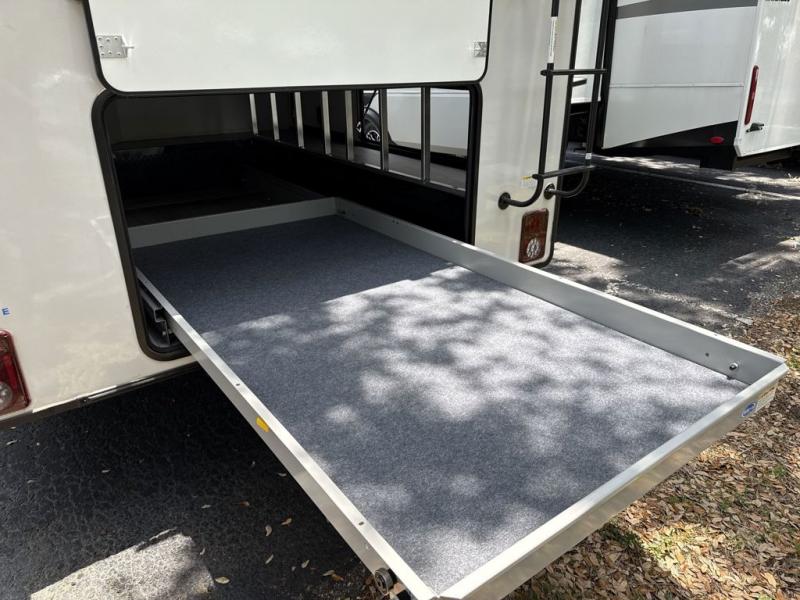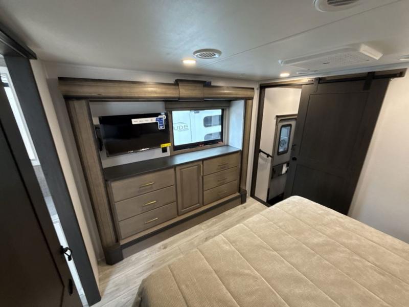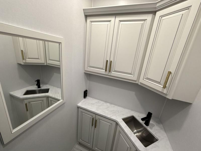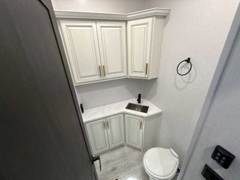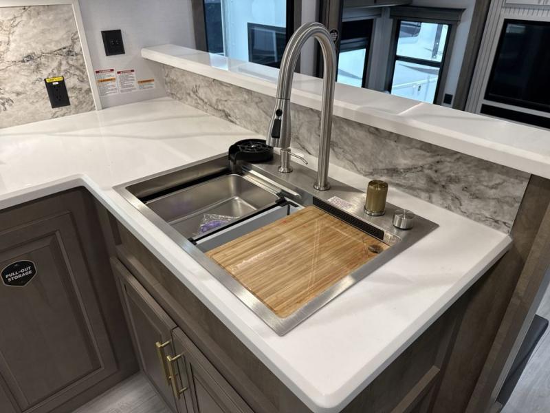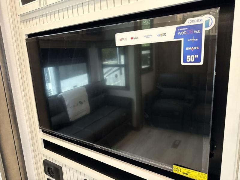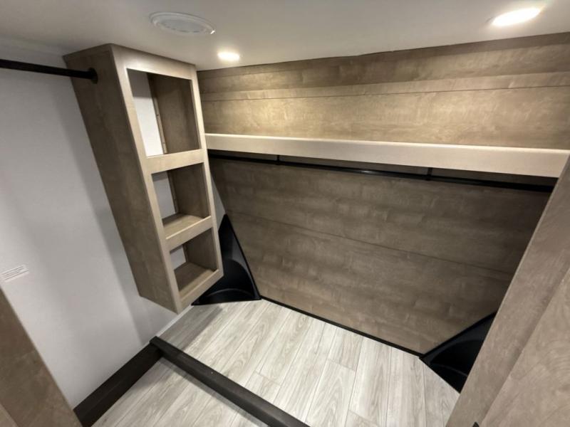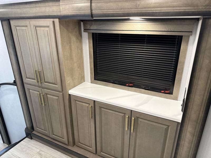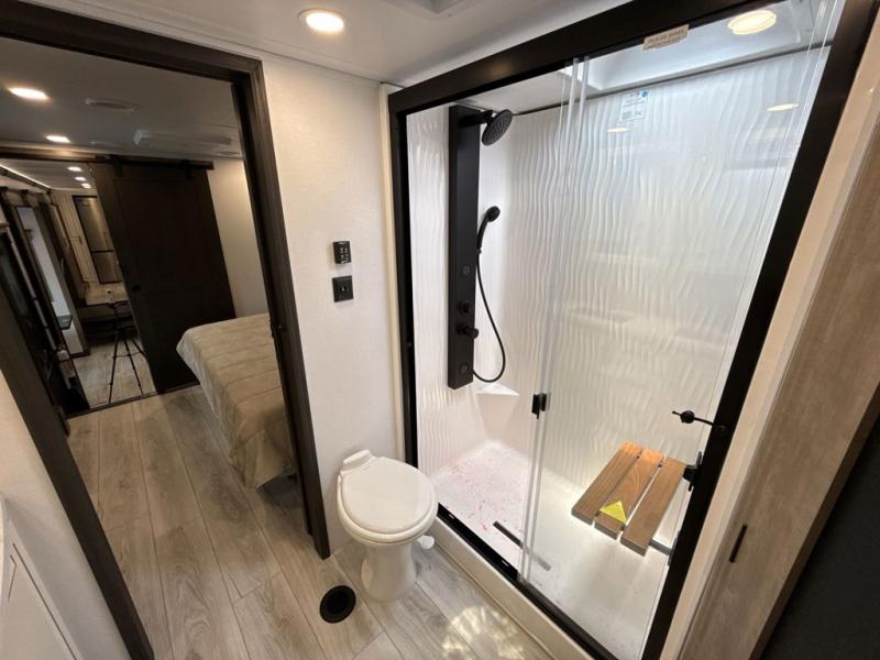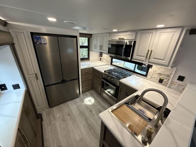 The perfect RV when you like to take "home"' with you when you travel! This Montana fifth wheel gives you the space you want and it feels like home with plenty of features to love and keep you comfortable when you are out enjoying your adventures. Five slides in total give each space plenty of room, the raised rear kitchen has everything you need to cook up meals and snacks just like at home. An 18 cu. ft. residential refrigerator with an ice maker, convection microwave oven and large sink, plus pantry space will make any chef happy. The mid-coach space just inside the door features a living room and half bath for convenience. There is also a dinette with storage within the roadside slide. Step up in front through a sliding barn door to a double slide space with a king bed and dresser. A second sliding barn door leads into the front spacious master bath featuring dual sinks, a 48" x 30" shower, and a large walk-in wardrobe with washer and dryer prep!