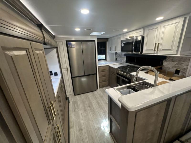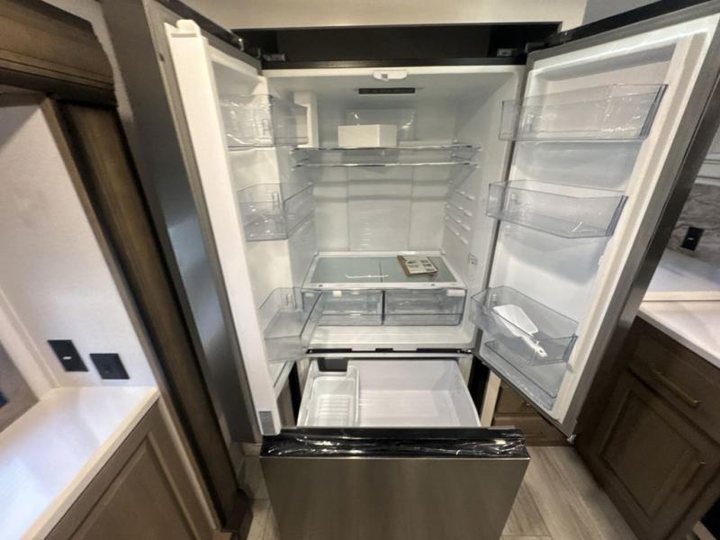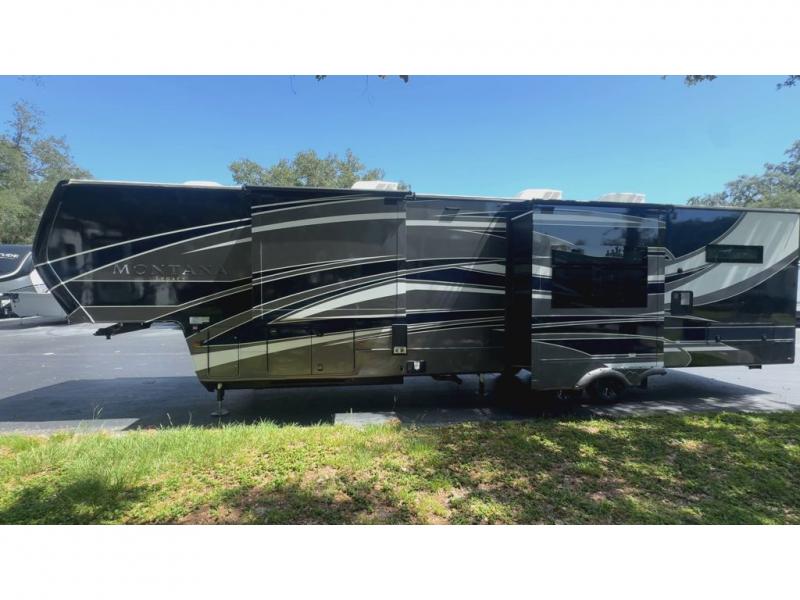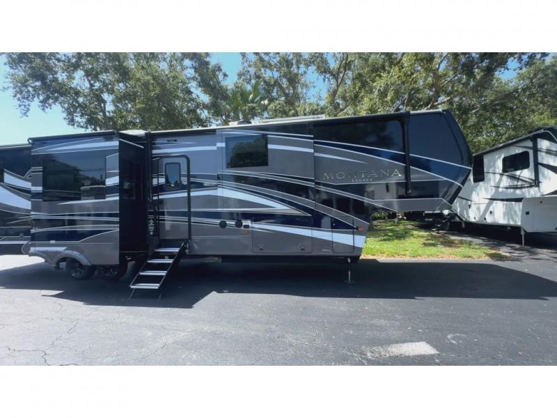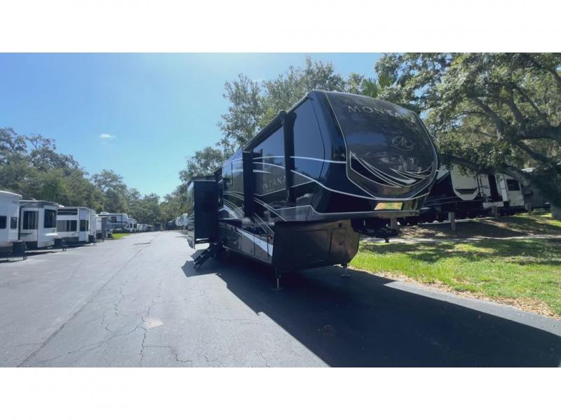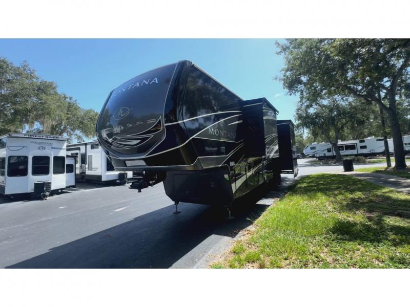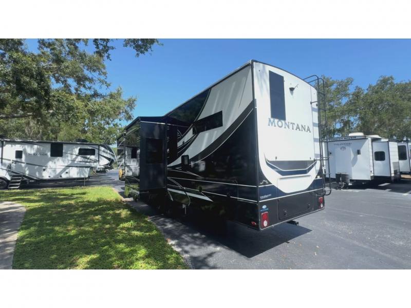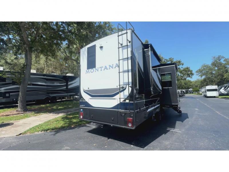 The perfect RV when you like to take "home"' with you when you travel! This Montana fifth wheel gives you the space you want and it feels like home with plenty of features to love and keep you comfortable when you are out enjoying your adventures. Five slides in total give each space plenty of room, the raised rear kitchen has everything you need to cook up meals and snacks just like at home. An 18 cu. ft. residential refrigerator with an ice maker, convection microwave oven and large sink, plus pantry space will make any chef happy. The mid-coach space just inside the door features a living room and half bath for convenience. There is also a dinette with storage within the roadside slide. Step up in front through a sliding barn door to a double slide space with a king bed and dresser. A second sliding barn door leads into the front spacious master bath featuring dual sinks, a 48" x 30" shower, and a large walk-in wardrobe with washer and dryer prep!