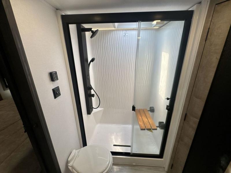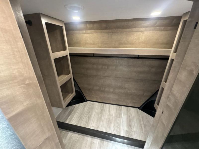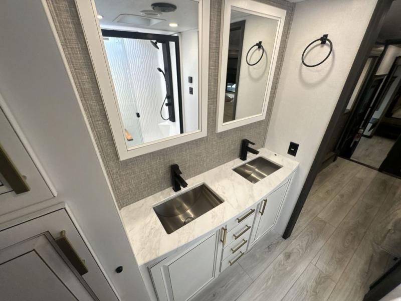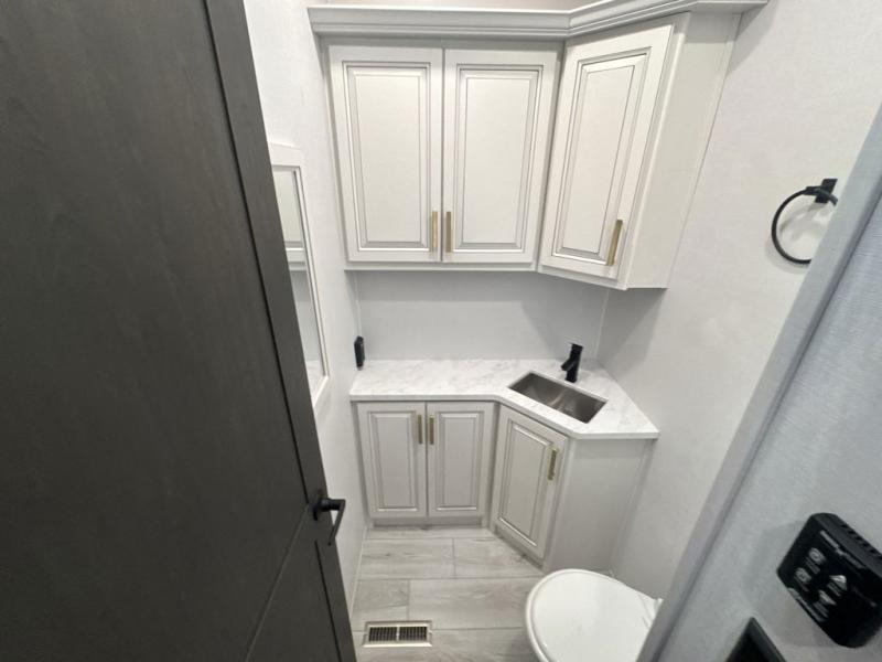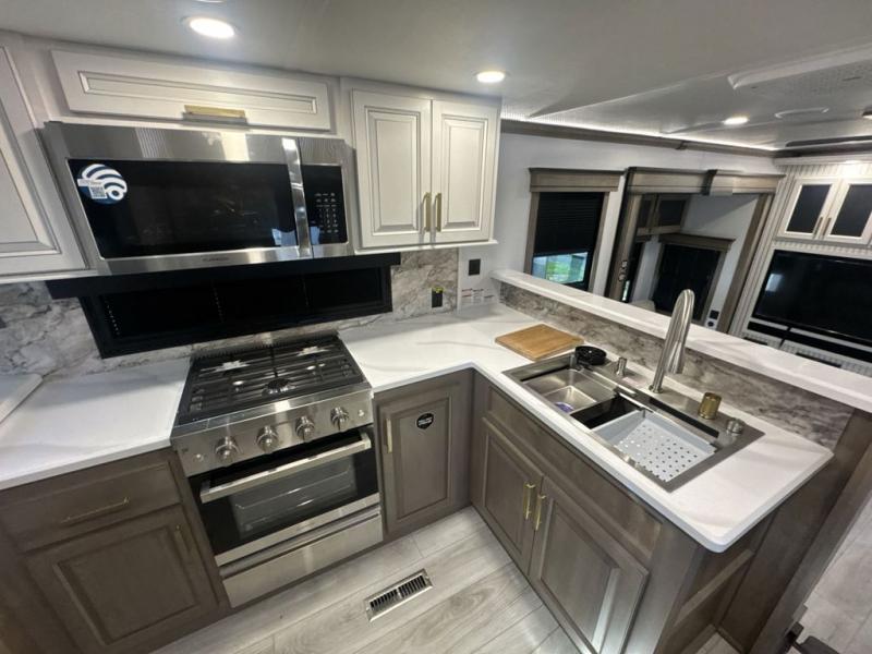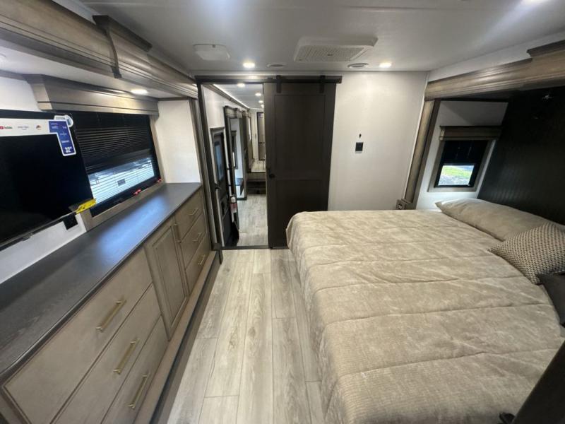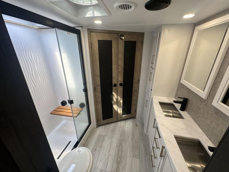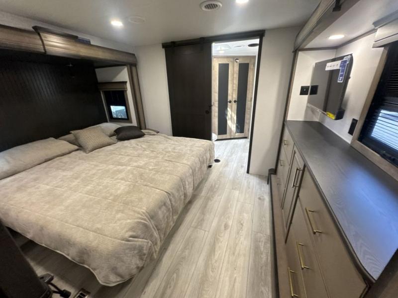 The perfect RV when you like to take "home"' with you when you travel! This Montana fifth wheel gives you the space you want and it feels like home with plenty of features to love and keep you comfortable when you are out enjoying your adventures. Five slides in total give each space plenty of room, the raised rear kitchen has everything you need to cook up meals and snacks just like at home. An 18 cu. ft. residential refrigerator with an ice maker, convection microwave oven and large sink, plus pantry space will make any chef happy. The mid-coach space just inside the door features a living room and half bath for convenience. There is also a dinette with storage within the roadside slide. Step up in front through a sliding barn door to a double slide space with a king bed and dresser. A second sliding barn door leads into the front spacious master bath featuring dual sinks, a 48" x 30" shower, and a large walk-in wardrobe with washer and dryer prep!