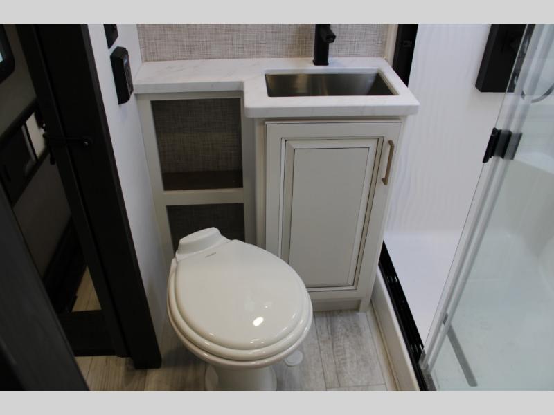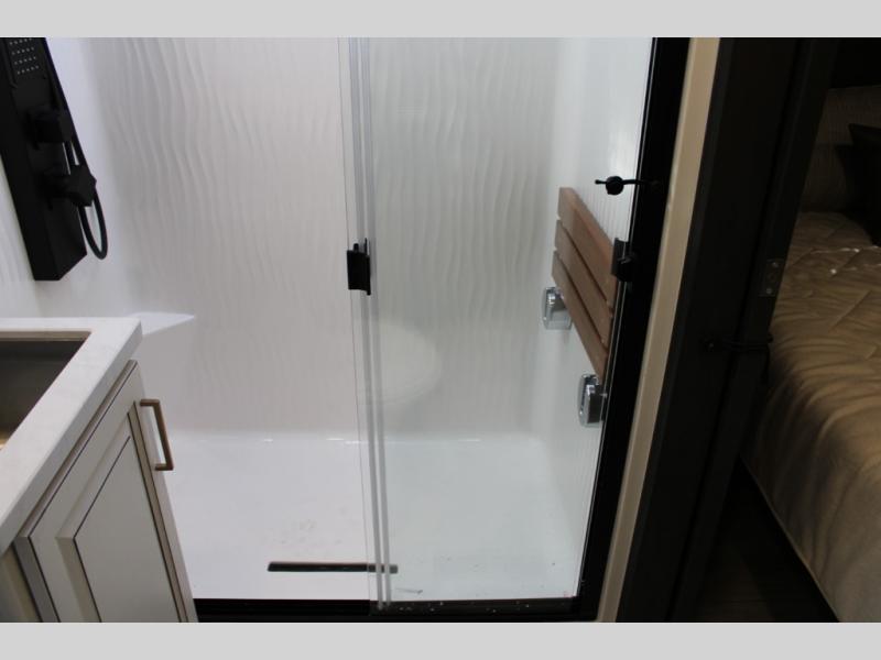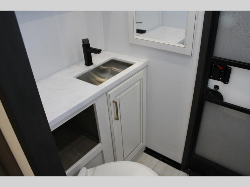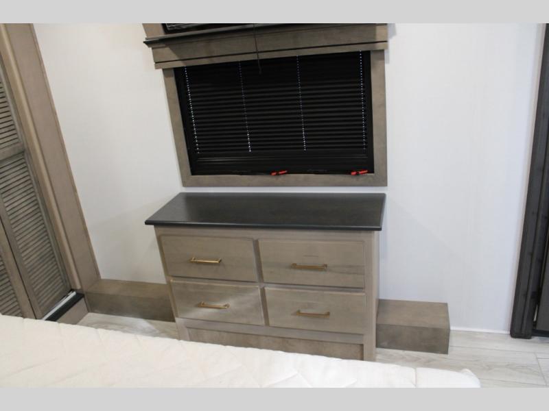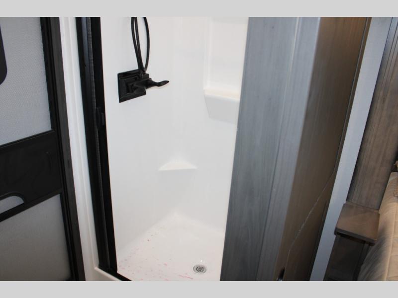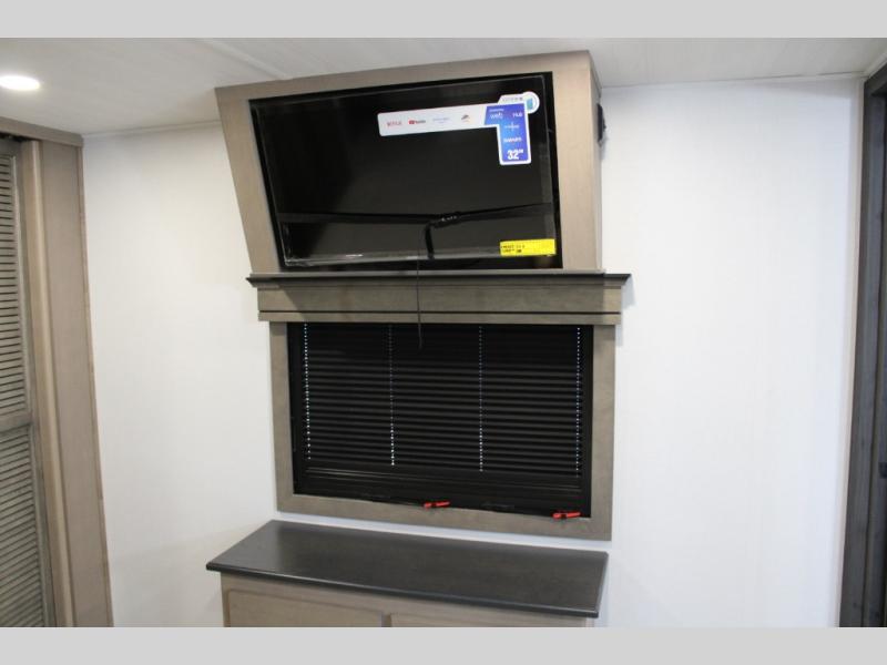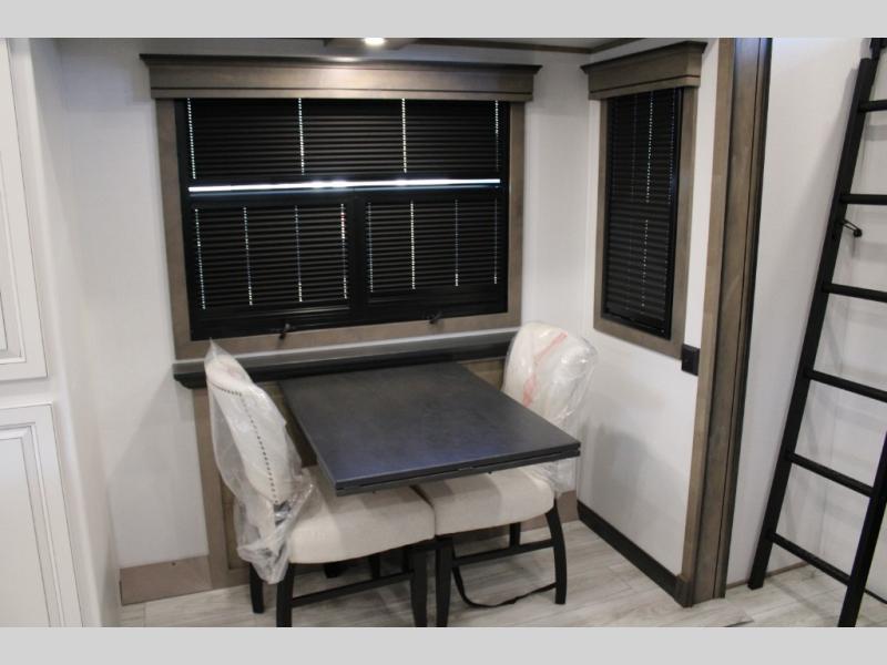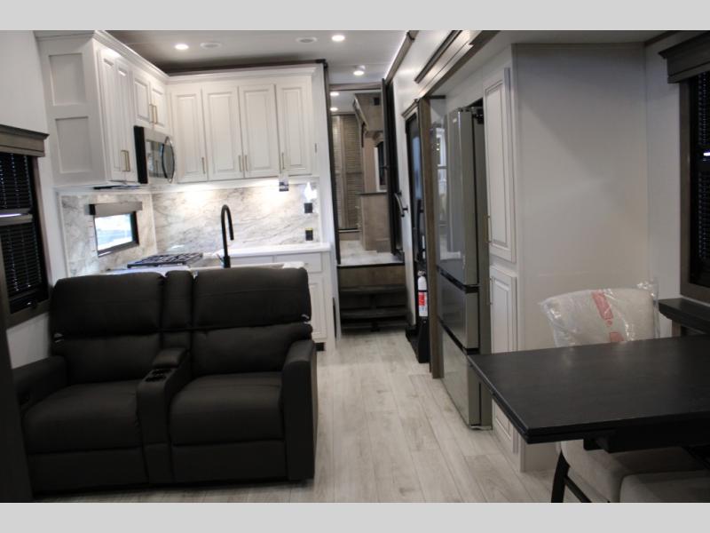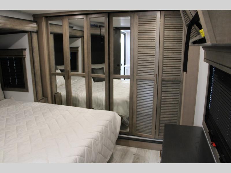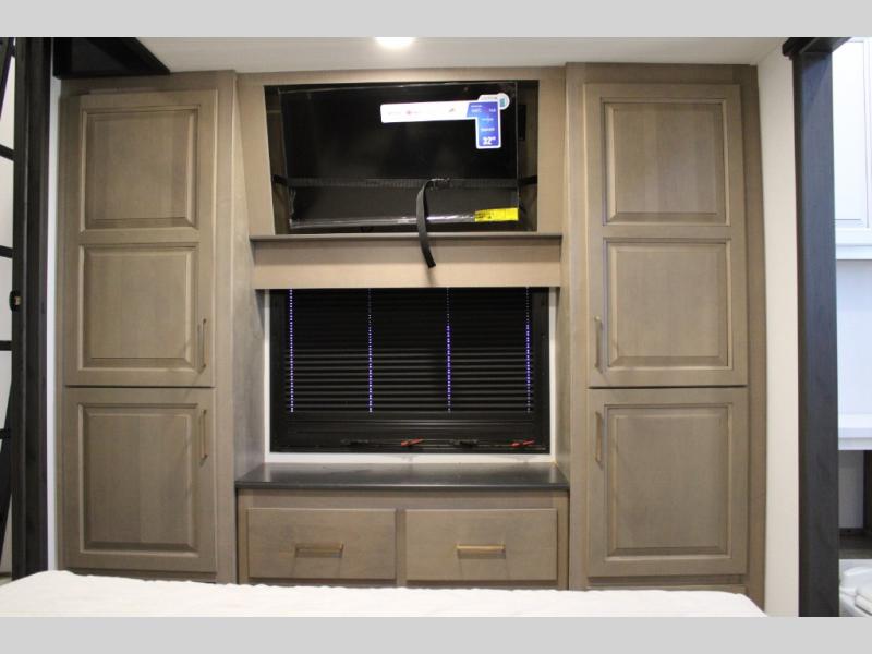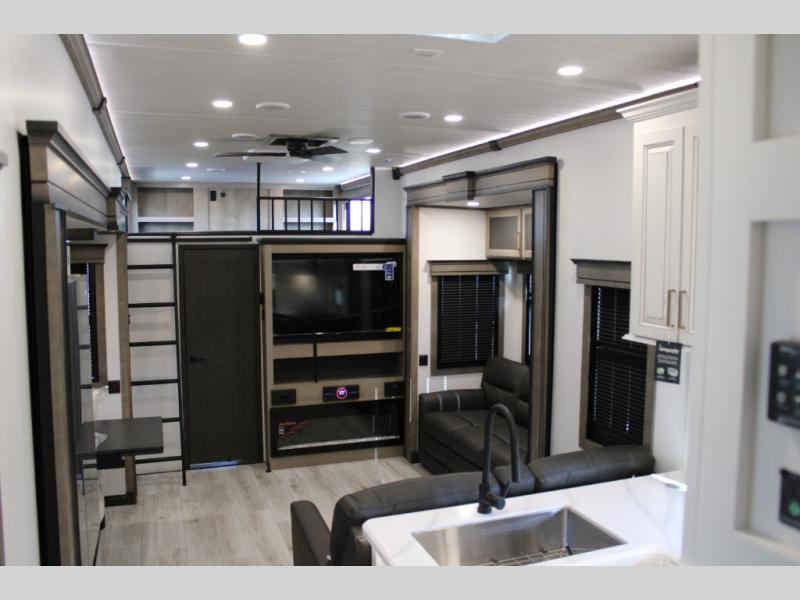 Traveling with friends and family is easier than ever with this fifth wheel in tow! There are two master suites; one for you and one for guests! The front master suite includes a king bed slide out, a front closet with a hamper, plus stackable washer/dryer prep if you want the option to make wash day easier. There is also convenient underbed storage, a dresser with a Smart HD TV, plus a private entrance into the dual entry bath. Head to the rear master suite to find just as much comfort with a queen bed slide out, dual closets and a dresser, plus a full rear bath where the second entry door is located. There is also a loft area above this room with three bunk mats so two more tired campers can sleep! The middle kitchen and living area includes many comforts, like the power theater seating across from the 50" Smart TV and hide-a-bed sofa, plus the U-shaped kitchen with ample counter space and a 24" range. You'll also find food storage in the pantry and 18 cu. ft. residential refrigerator with an ice maker, or you can choose the slightly larger 20 cu. ft. refrigerator!