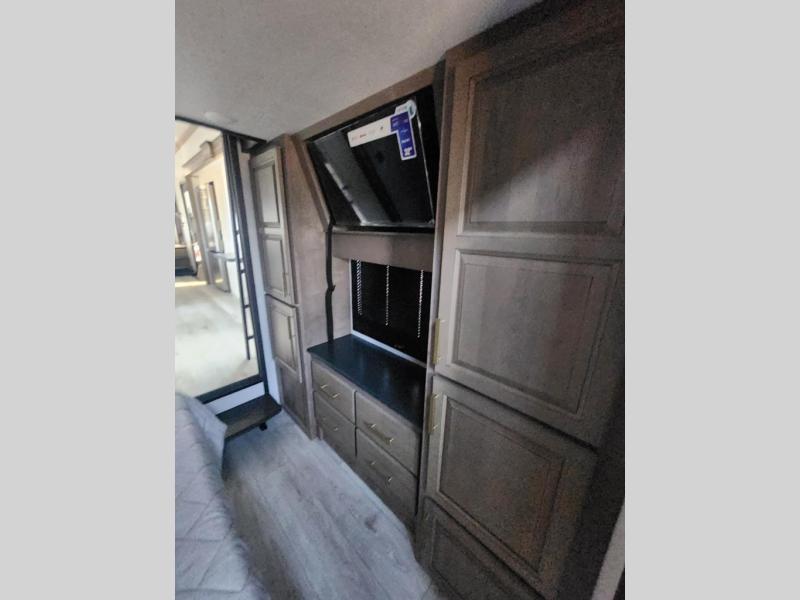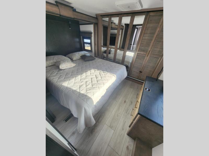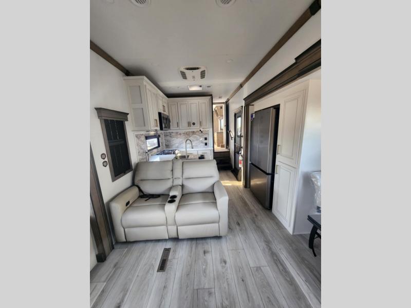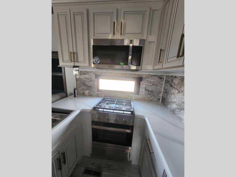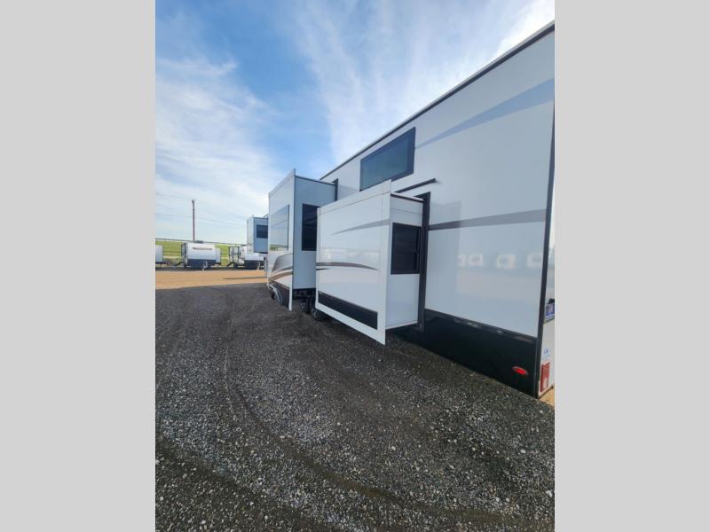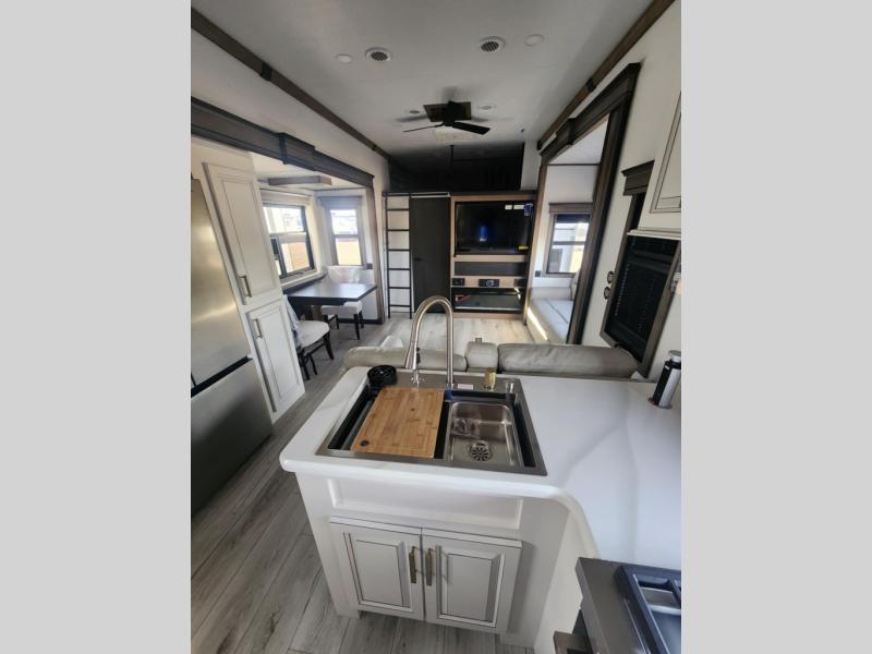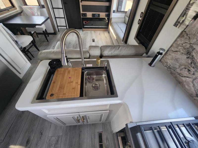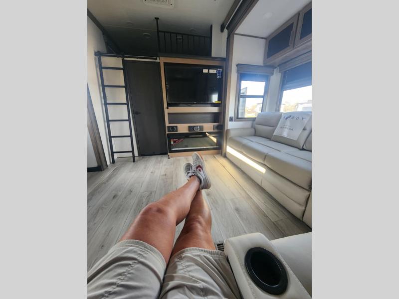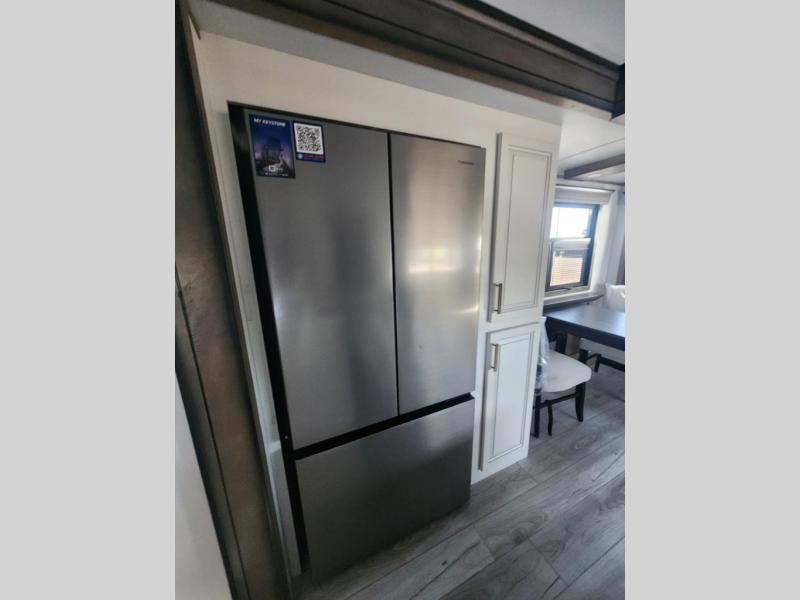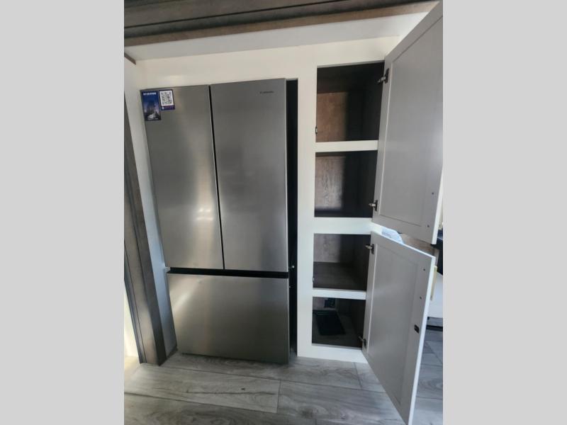 Traveling with friends and family is easier than ever with this fifth wheel in tow! There are two master suites; one for you and one for guests! The front master suite includes a king bed slide out, a front closet with a hamper, plus stackable washer/dryer prep if you want the option to make wash day easier. There is also convenient underbed storage, a dresser with a Smart HD TV, plus a private entrance into the dual entry bath. Head to the rear master suite to find just as much comfort with a queen bed slide out, dual closets and a dresser, plus a full rear bath where the second entry door is located. There is also a loft area above this room with three bunk mats for more campers! The middle kitchen and living area includes many comforts, like the power theater seating across from the 50" Smart TV and hide-a-bed sofa, plus the U-shaped kitchen with ample counter space and a 24" range. You'll also find food storage in the pantry and 18 cu. ft. residential refrigerator with an ice maker, or you can choose the slightly larger optional 20 cu. ft. refrigerator!