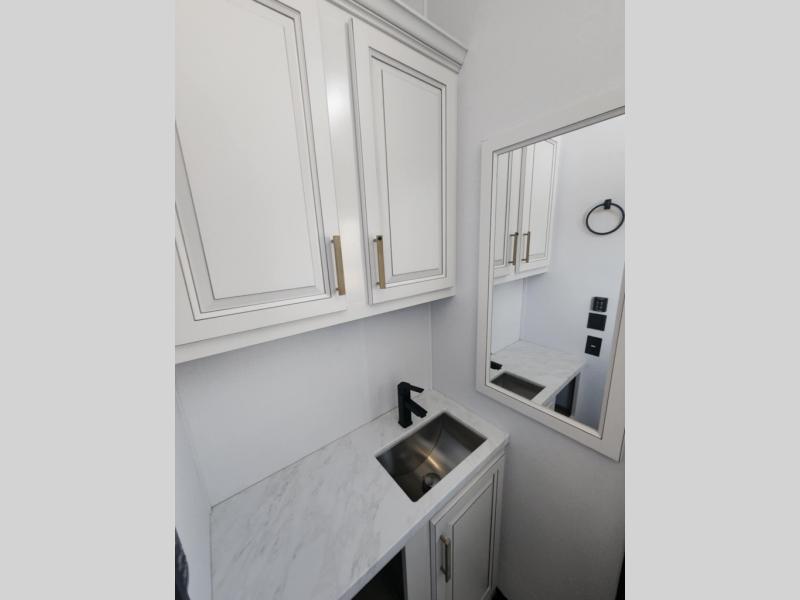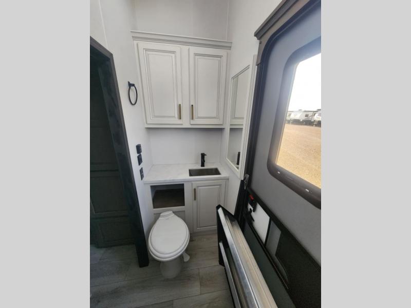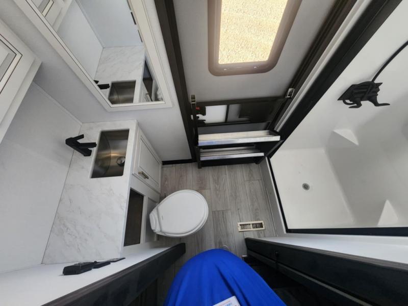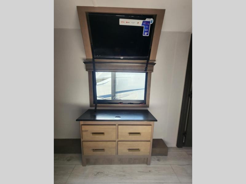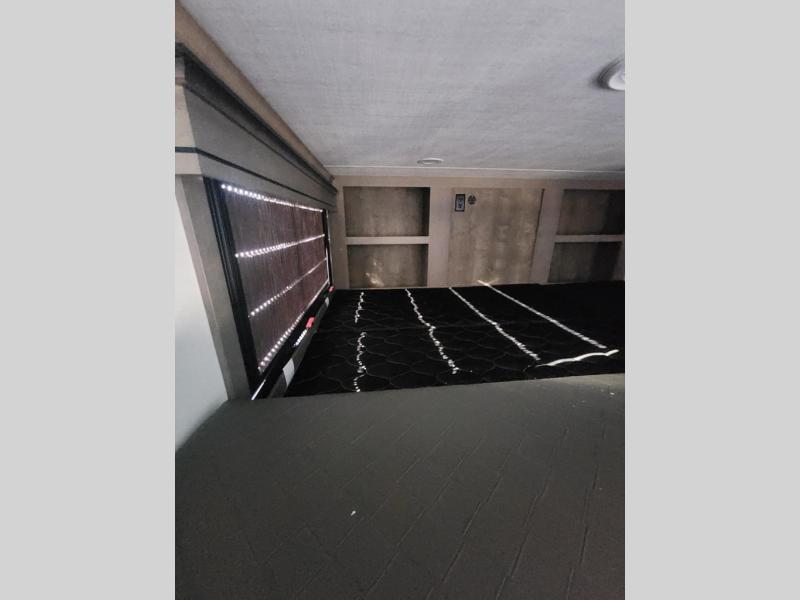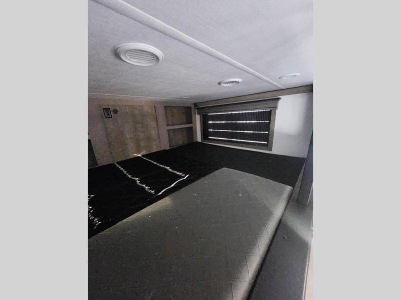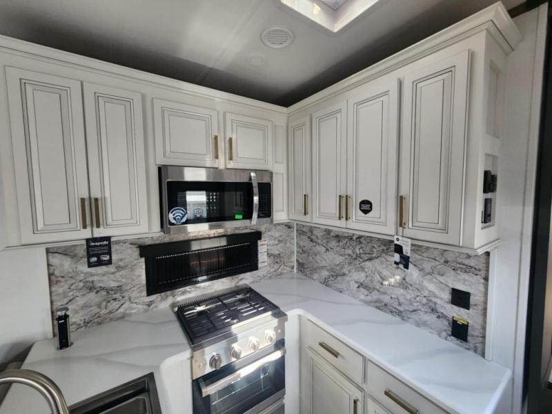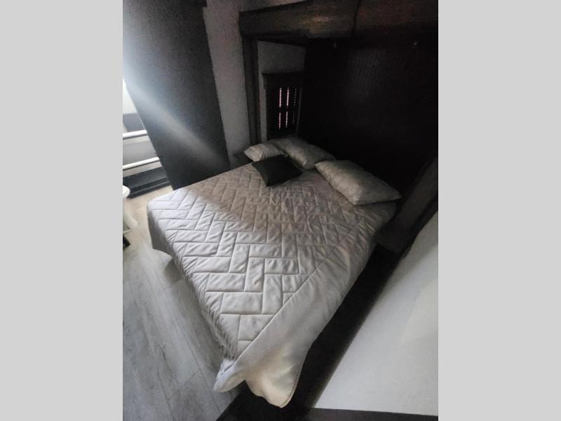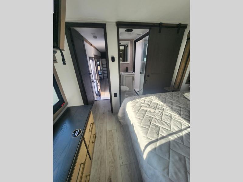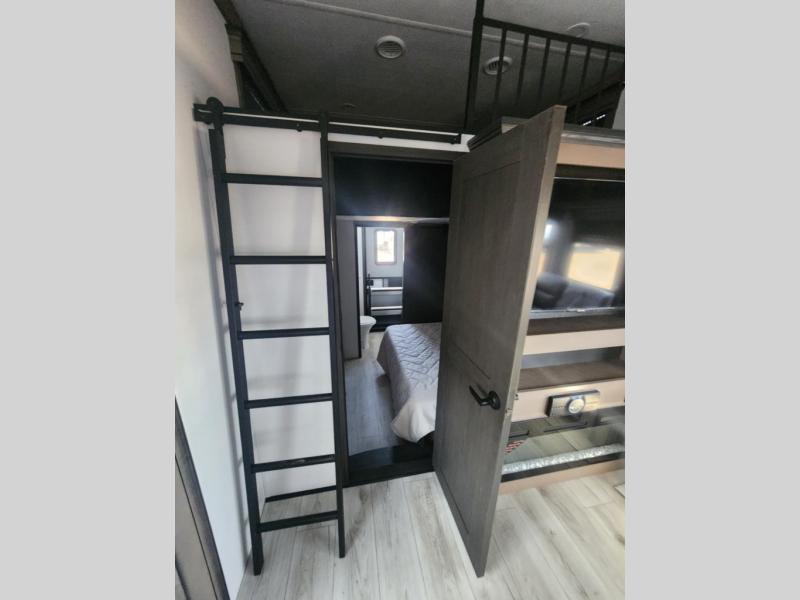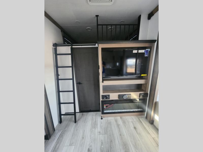 Traveling with friends and family is easier than ever with this fifth wheel in tow! There are two master suites; one for you and one for guests! The front master suite includes a king bed slide out, a front closet with a hamper, plus stackable washer/dryer prep if you want the option to make wash day easier. There is also convenient underbed storage, a dresser with a Smart HD TV, plus a private entrance into the dual entry bath. Head to the rear master suite to find just as much comfort with a queen bed slide out, dual closets and a dresser, plus a full rear bath where the second entry door is located. There is also a loft area above this room with three bunk mats for more campers! The middle kitchen and living area includes many comforts, like the power theater seating across from the 50" Smart TV and hide-a-bed sofa, plus the U-shaped kitchen with ample counter space and a 24" range. You'll also find food storage in the pantry and 18 cu. ft. residential refrigerator with an ice maker, or you can choose the slightly larger optional 20 cu. ft. refrigerator!