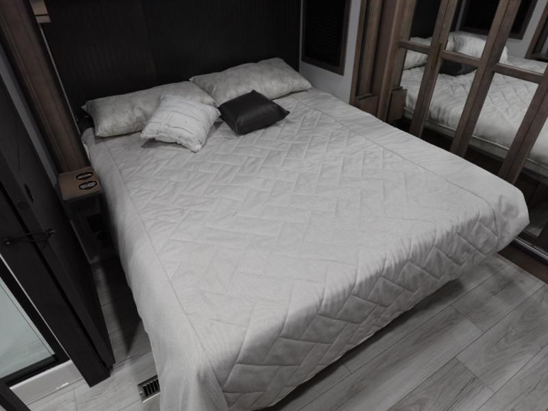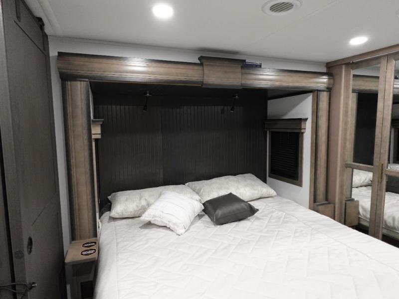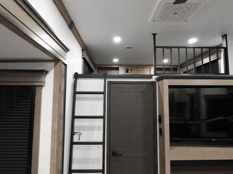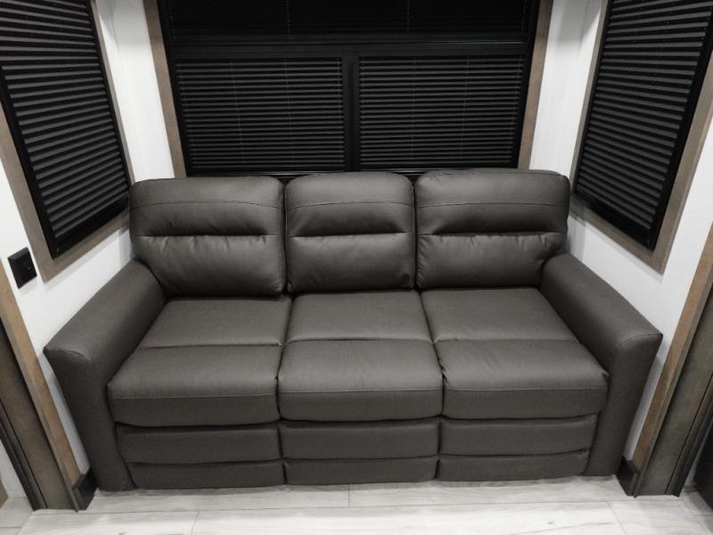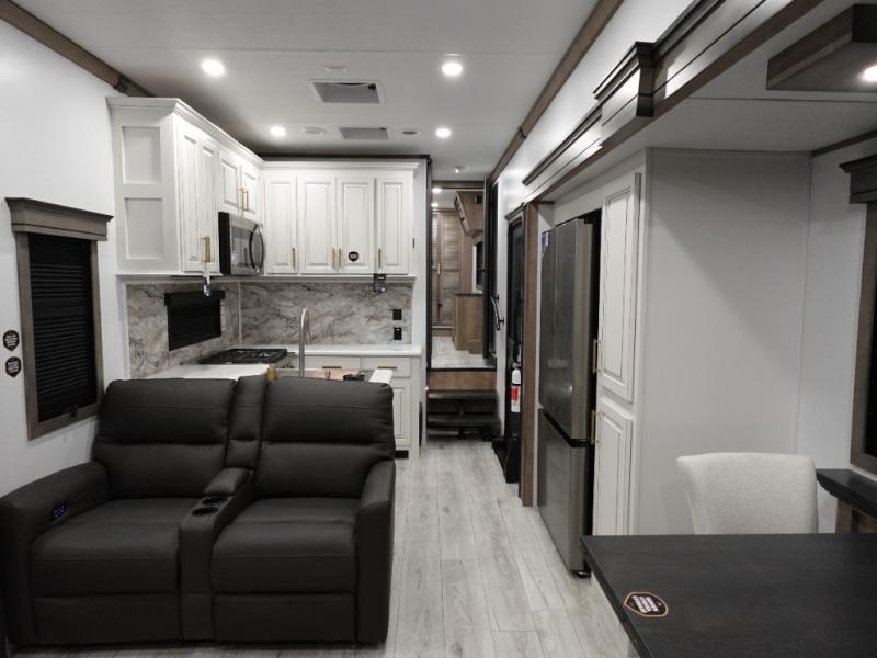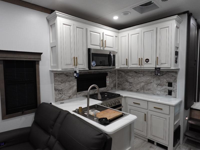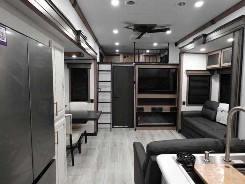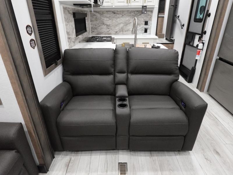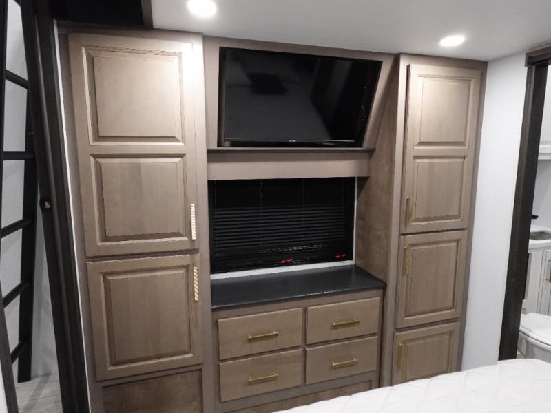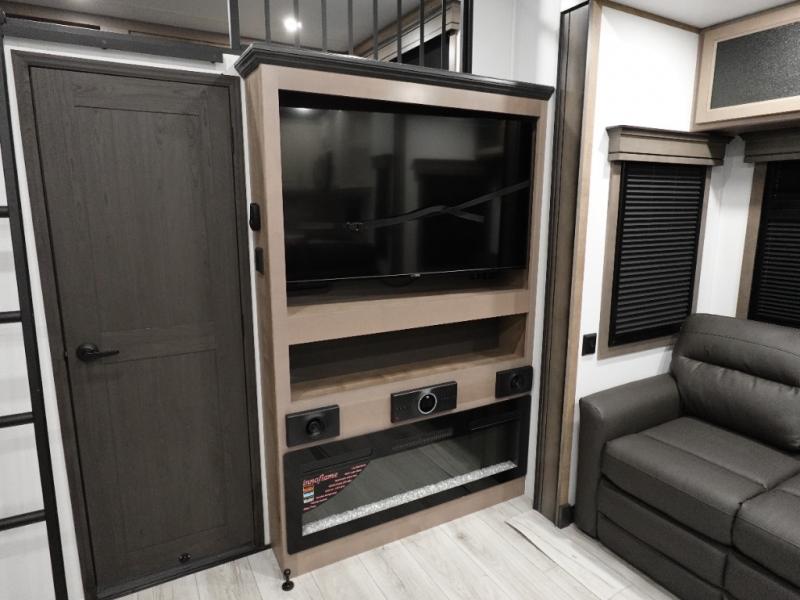Traveling with friends and family is easier than ever with this fifth wheel in tow! There are two master suites; one for you and one for guests! The front master suite includes a king bed slide out, a front closet with a hamper. There is also convenient underbed storage, a dresser with a Smart HD TV, plus a private entrance into the dual entry bath. Head to the rear master suite to find just as much comfort with a King bed slide out, dual closets and a dresser, plus a full rear bath where the second entry door is located. There is also a loft area above this room with three bunk mats for more campers! The middle kitchen and living area includes many comforts, like the power theater seating across from the 50" Smart TV and hide-a-bed sofa, plus the U-shaped kitchen with ample counter space and a 24" range.