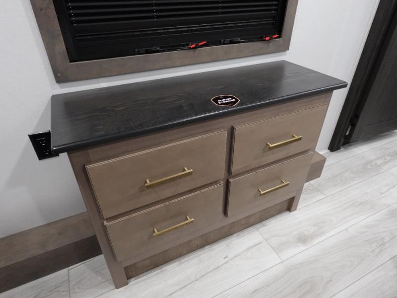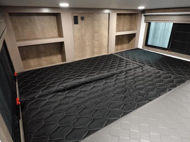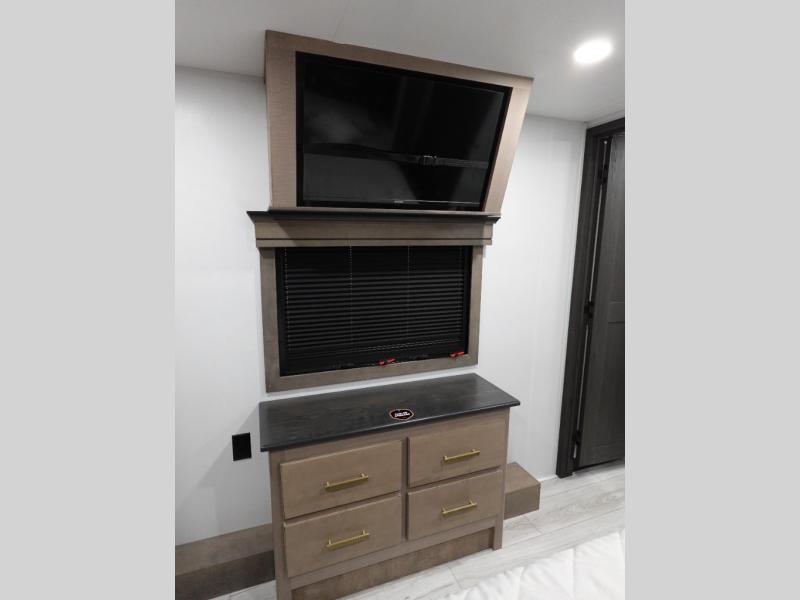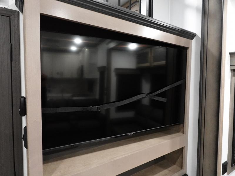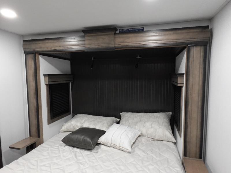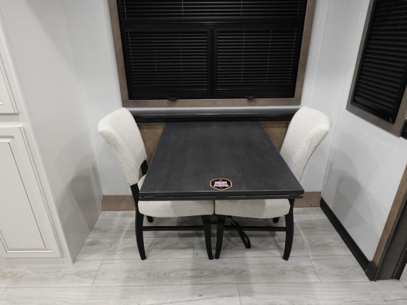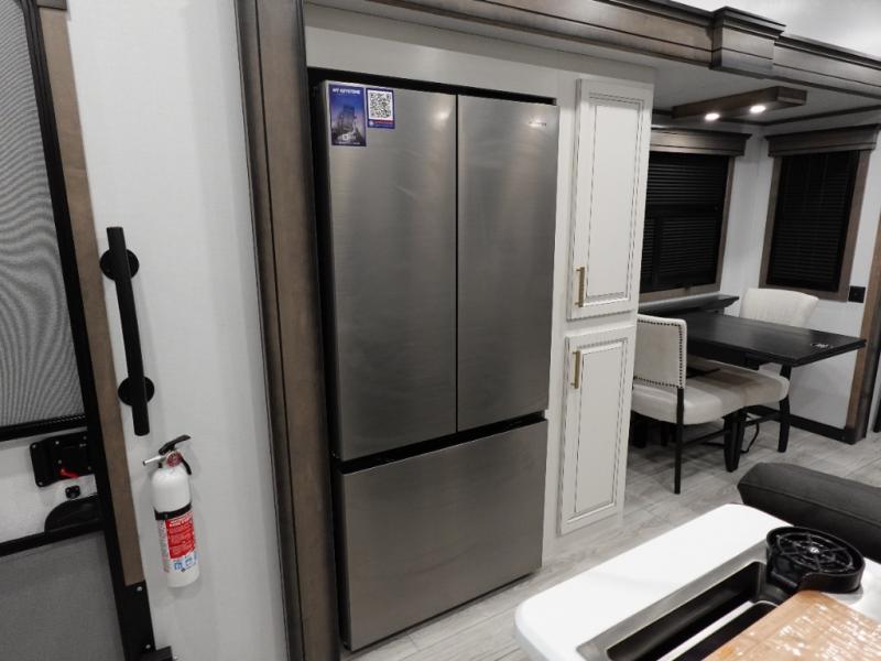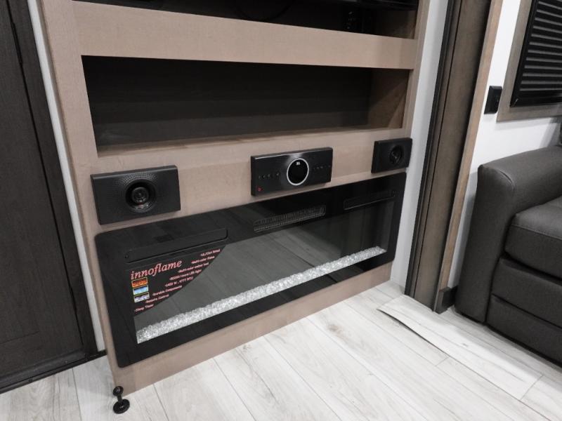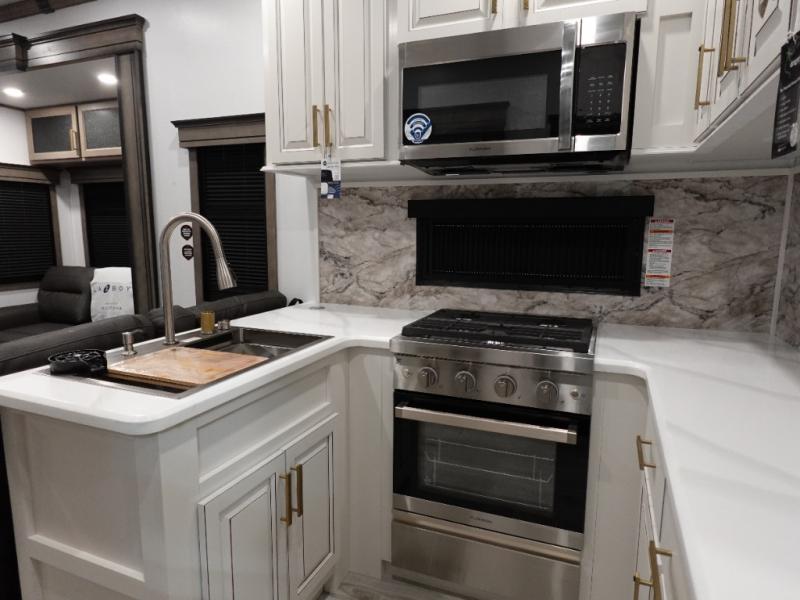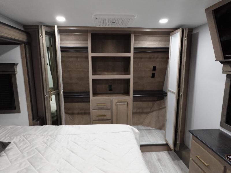 Traveling with friends and family is easier than ever with this fifth wheel in tow! There are two master suites; one for you and one for guests! The front master suite includes a king bed slide out, a front closet with a hamper. There is also convenient underbed storage, a dresser with a Smart HD TV, plus a private entrance into the dual entry bath. Head to the rear master suite to find just as much comfort with a King bed slide out, dual closets and a dresser, plus a full rear bath where the second entry door is located. There is also a loft area above this room with three bunk mats for more campers! The middle kitchen and living area includes many comforts, like the power theater seating across from the 50" Smart TV and hide-a-bed sofa, plus the U-shaped kitchen with ample counter space and a 24" range.