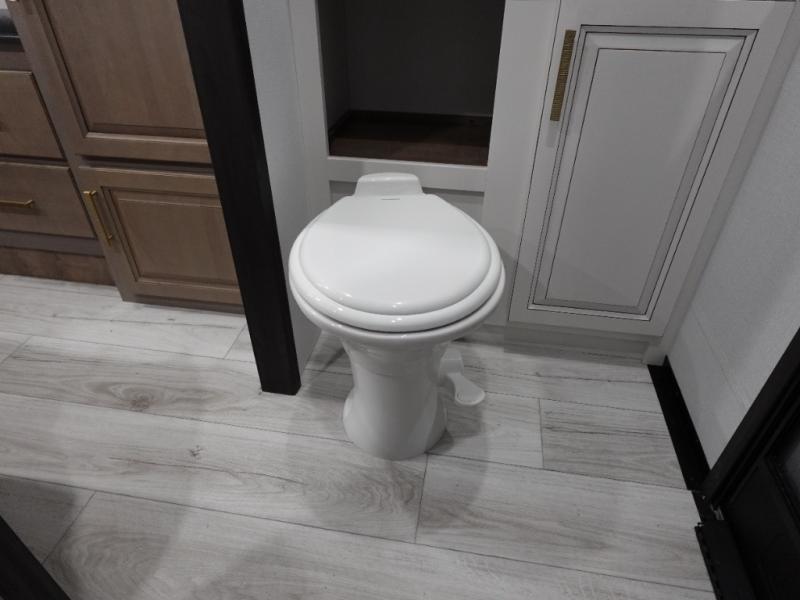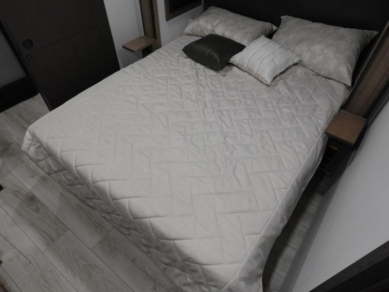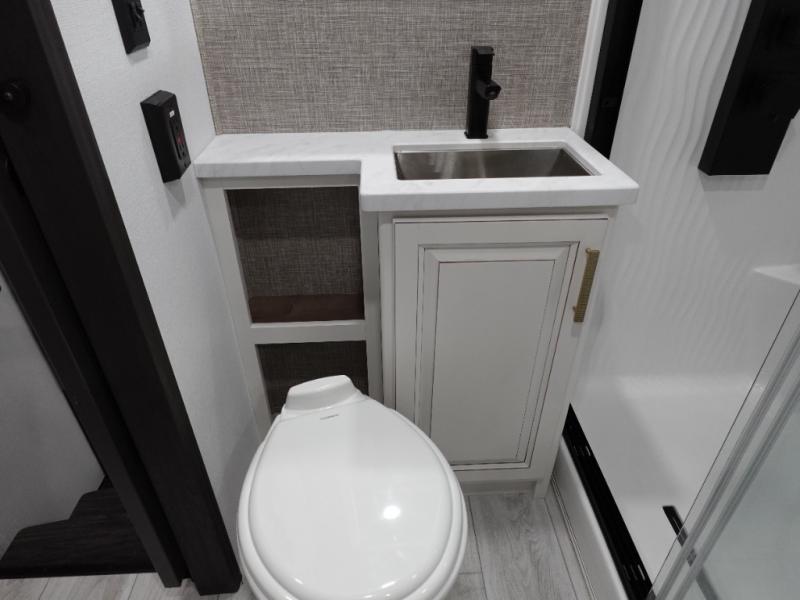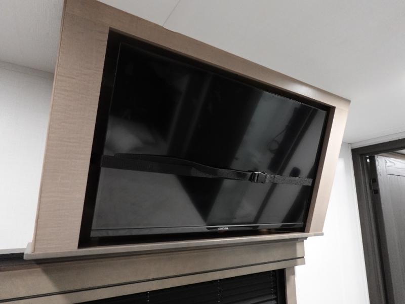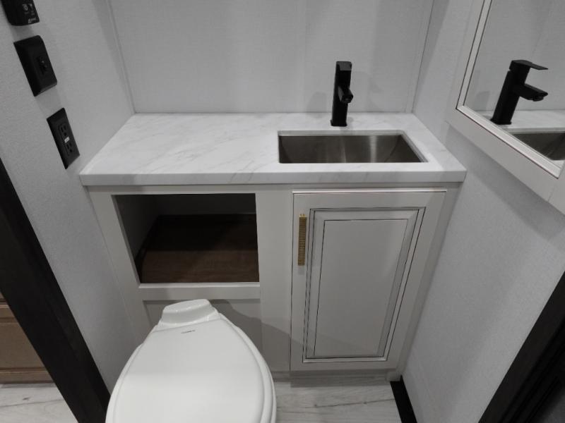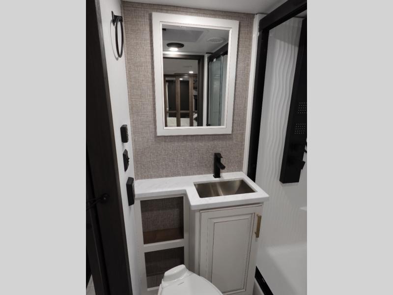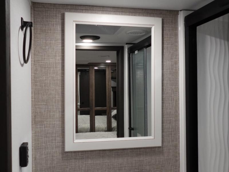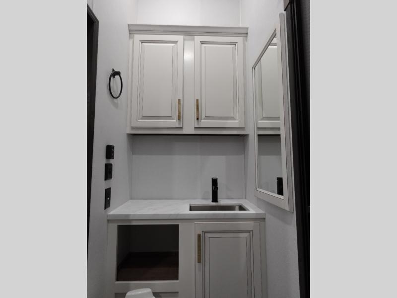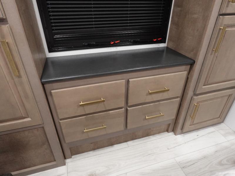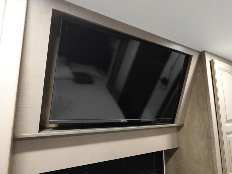 Traveling with friends and family is easier than ever with this fifth wheel in tow! There are two master suites; one for you and one for guests! The front master suite includes a king bed slide out, a front closet with a hamper. There is also convenient underbed storage, a dresser with a Smart HD TV, plus a private entrance into the dual entry bath. Head to the rear master suite to find just as much comfort with a King bed slide out, dual closets and a dresser, plus a full rear bath where the second entry door is located. There is also a loft area above this room with three bunk mats for more campers! The middle kitchen and living area includes many comforts, like the power theater seating across from the 50" Smart TV and hide-a-bed sofa, plus the U-shaped kitchen with ample counter space and a 24" range.