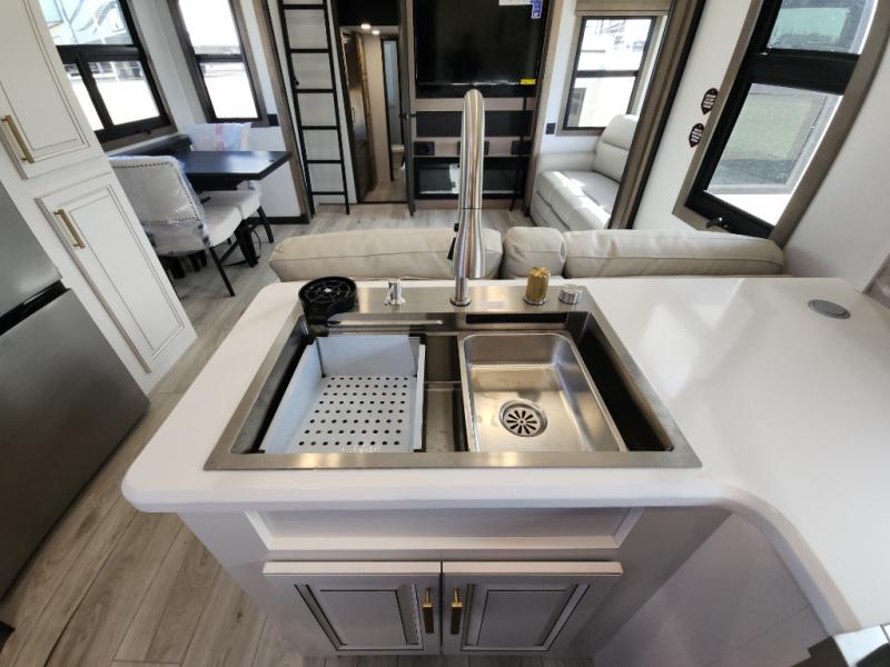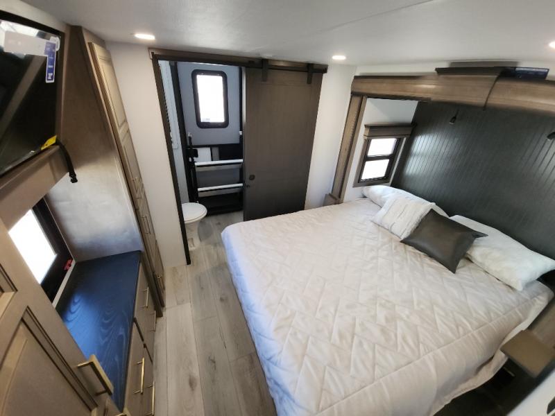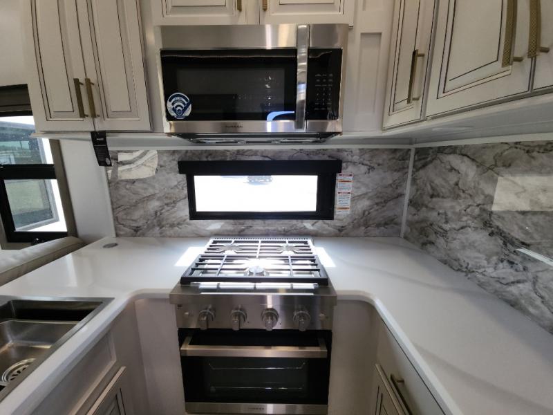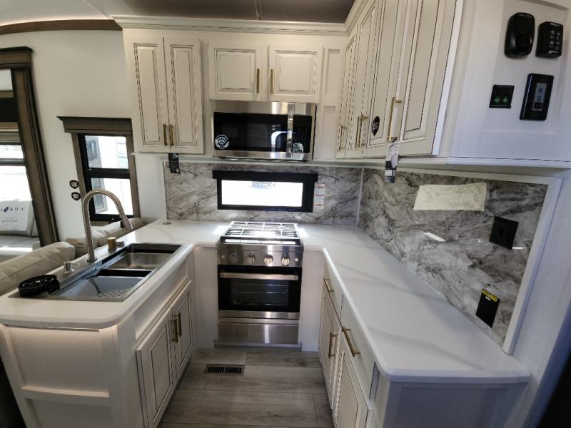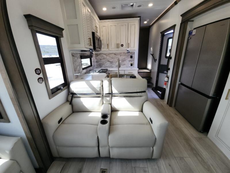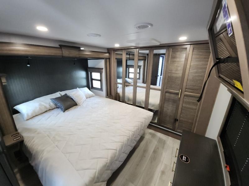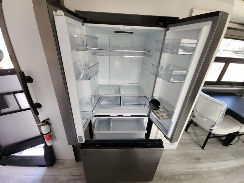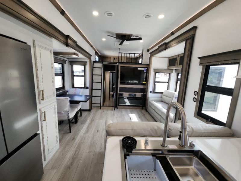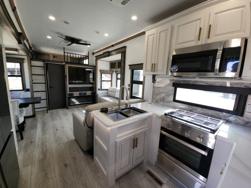 Traveling with friends and family is easier than ever with this fifth wheel in tow! There are two master suites; one for you and one for guests! The front master suite includes a king bed slide out, a front closet with a hamper, plus stackable washer/dryer prep if you want the option to make wash day easier. There is also convenient underbed storage, a dresser with a Smart HD TV, plus a private entrance into the dual entry bath. Head to the rear master suite to find just as much comfort with a queen bed slide out, dual closets and a dresser, plus a full rear bath where the second entry door is located. There is also a loft area above this room with three bunk mats for more campers! The middle kitchen and living area includes many comforts, like the power theater seating across from the 50" Smart TV and hide-a-bed sofa, plus the U-shaped kitchen with ample counter space and a 24" range. You'll also find food storage in the pantry and 18 cu. ft. residential refrigerator with an ice maker, or you can choose the slightly larger optional 20 cu. ft. refrigerator!