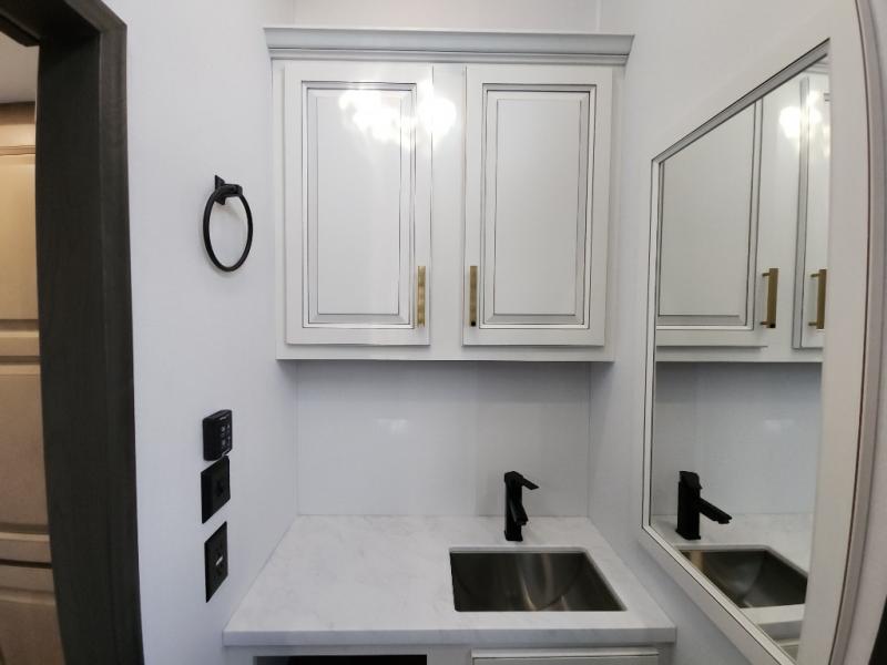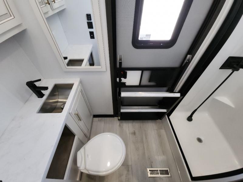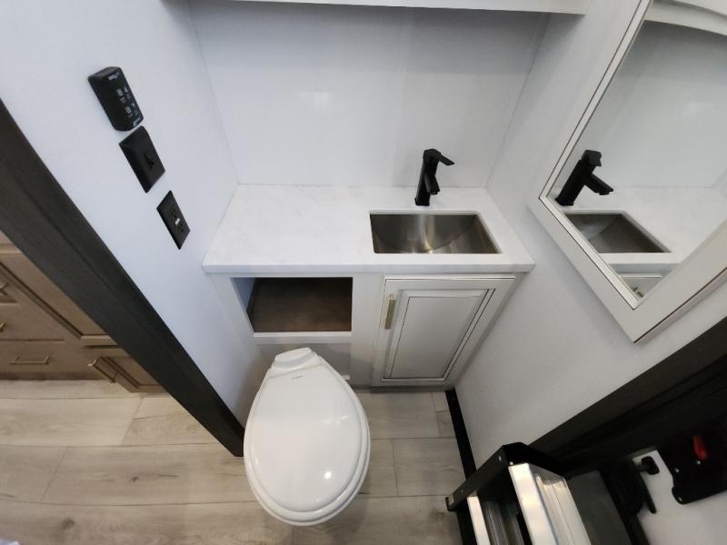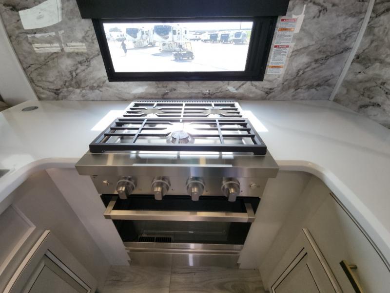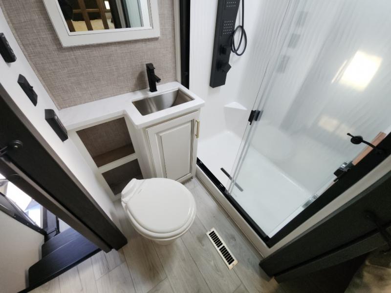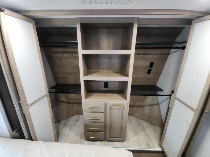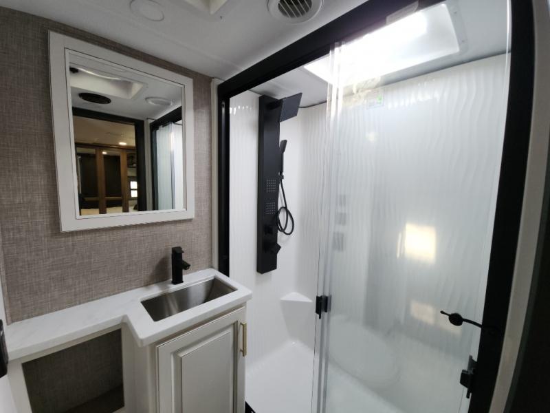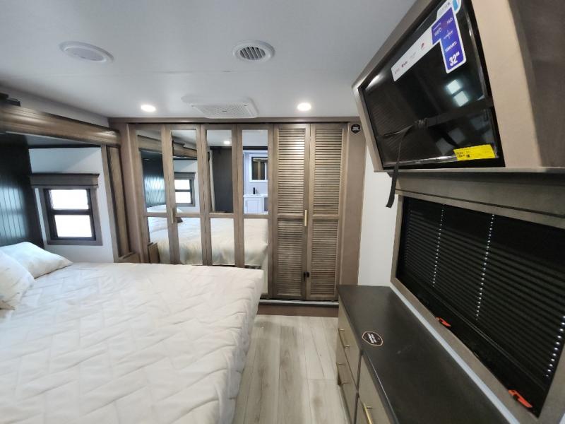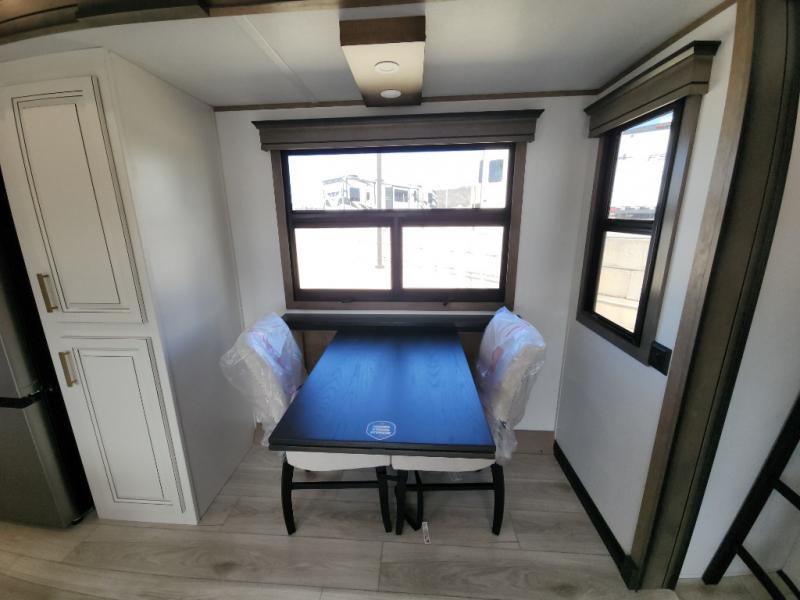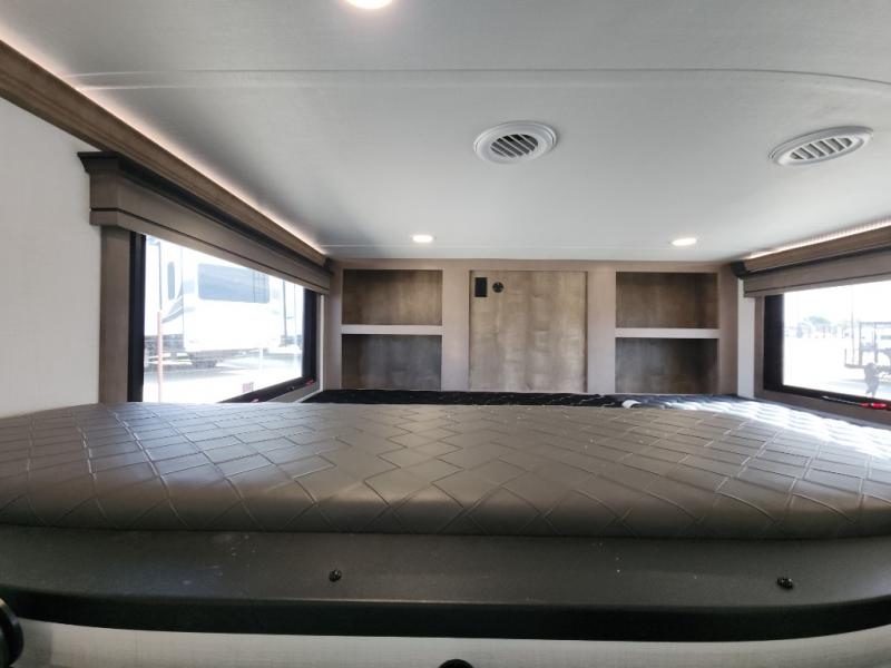 Traveling with friends and family is easier than ever with this fifth wheel in tow! There are two master suites; one for you and one for guests! The front master suite includes a king bed slide out, a front closet with a hamper, plus stackable washer/dryer prep if you want the option to make wash day easier. There is also convenient underbed storage, a dresser with a Smart HD TV, plus a private entrance into the dual entry bath. Head to the rear master suite to find just as much comfort with a queen bed slide out, dual closets and a dresser, plus a full rear bath where the second entry door is located. There is also a loft area above this room with three bunk mats for more campers! The middle kitchen and living area includes many comforts, like the power theater seating across from the 50" Smart TV and hide-a-bed sofa, plus the U-shaped kitchen with ample counter space and a 24" range. You'll also find food storage in the pantry and 18 cu. ft. residential refrigerator with an ice maker, or you can choose the slightly larger optional 20 cu. ft. refrigerator!