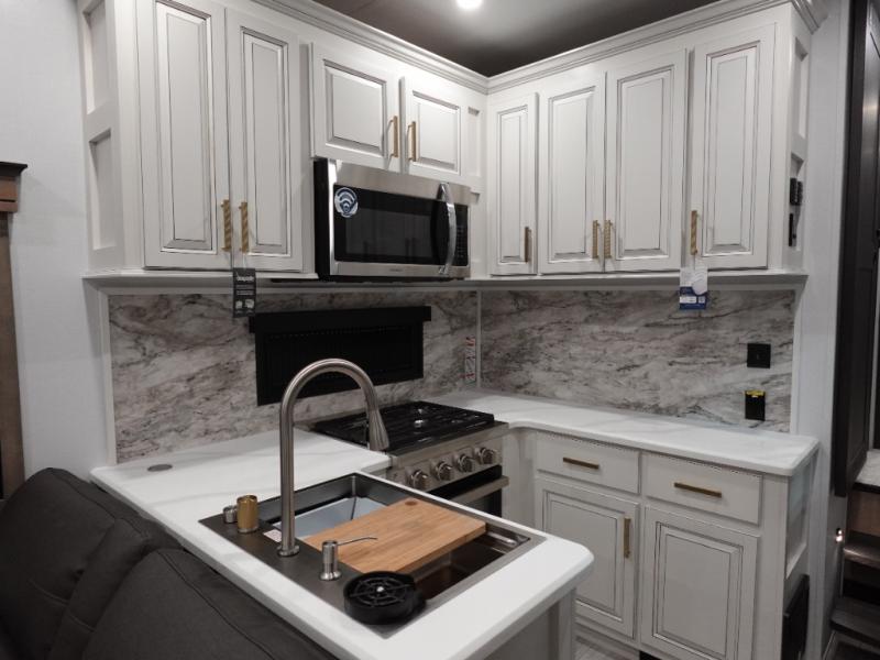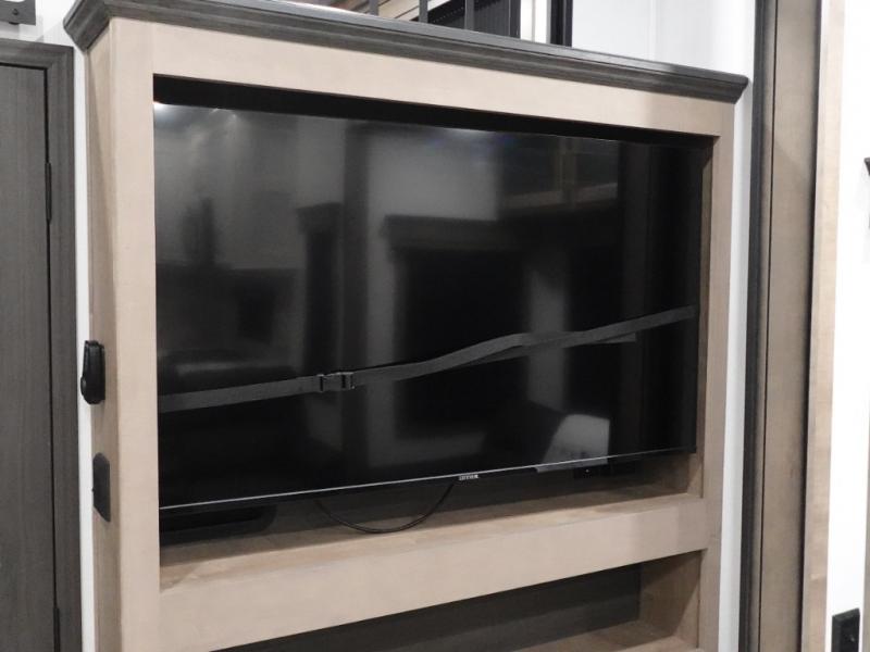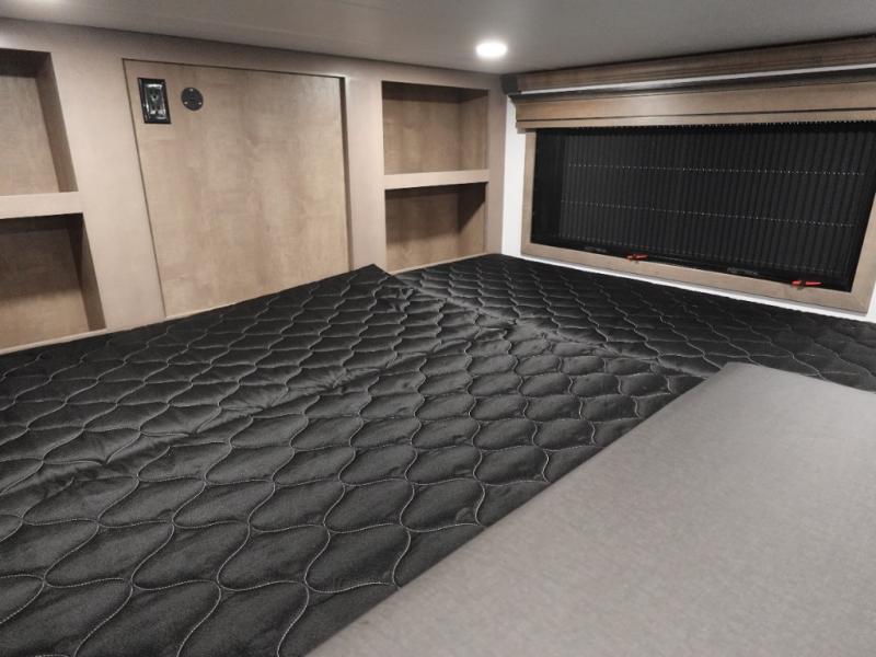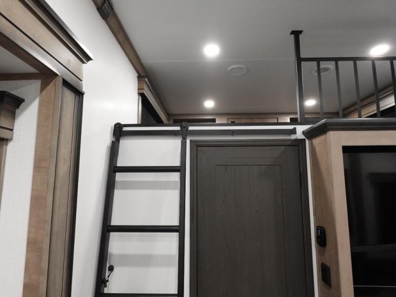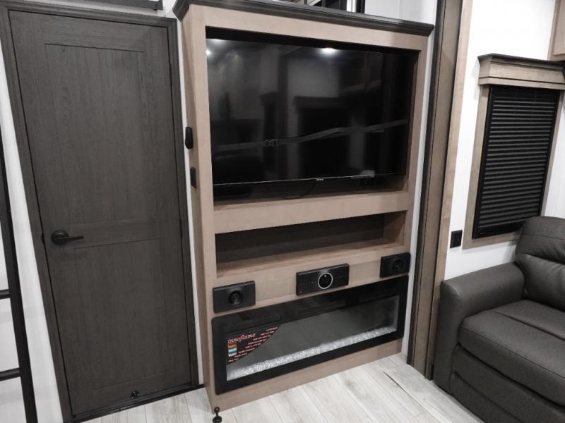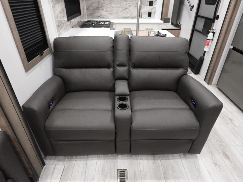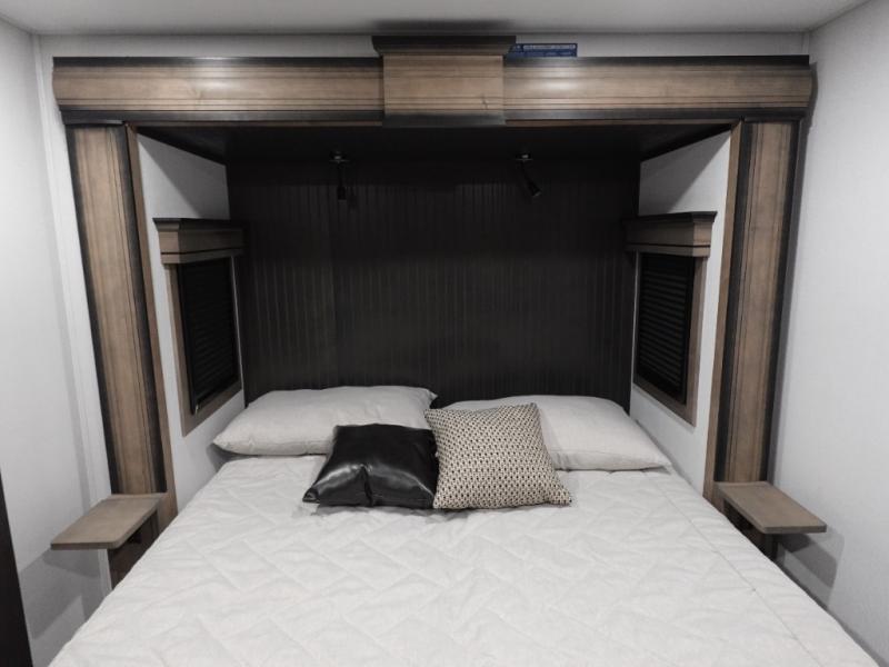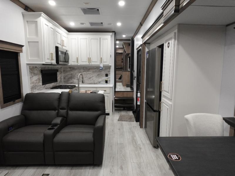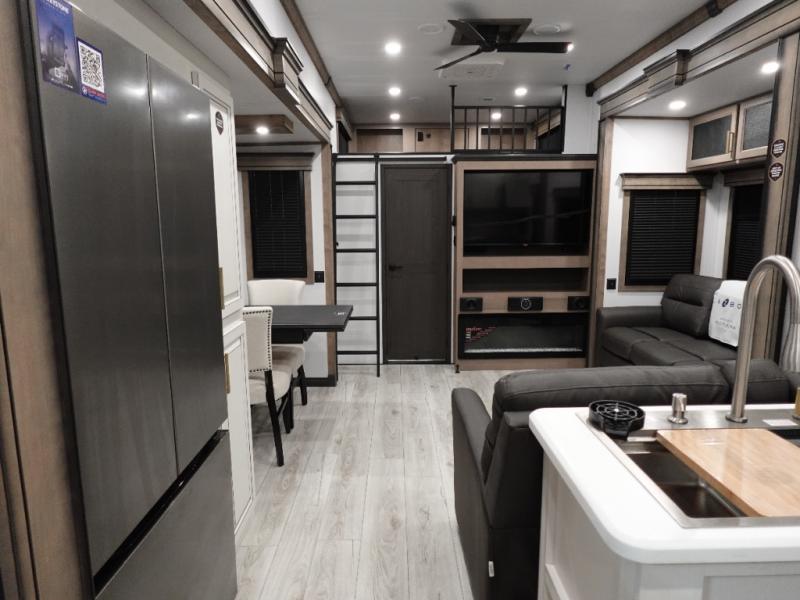 Traveling with friends and family is easier than ever with this fifth wheel in tow! There are two master suites; one for you and one for guests! The front master suite includes a king bed slide out, a front closet with a hamper. There is also convenient underbed storage, a dresser with a Smart HD TV, plus a private entrance into the dual entry bath. Head to the rear master suite to find just as much comfort with a queen bed slide out, dual closets and a dresser, plus a full rear bath where the second entry door is located. There is also a loft area above this room with three bunk mats for more campers! The middle kitchen and living area includes many comforts, like the power theater seating across from the 50" Smart TV and hide-a-bed sofa, plus the U-shaped kitchen with ample counter space and a 24" range.