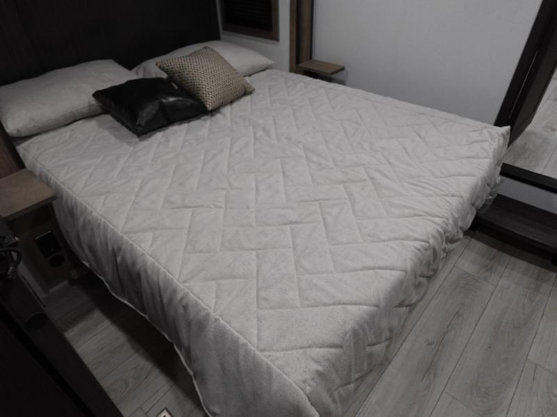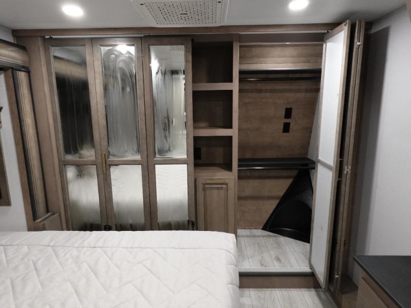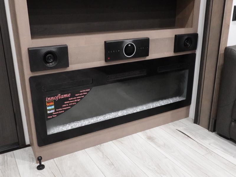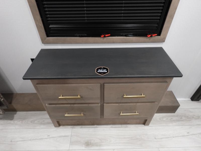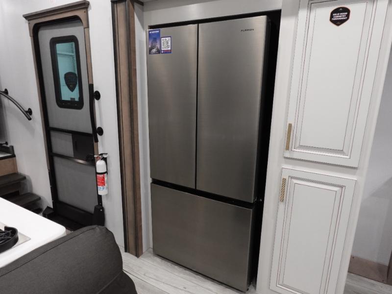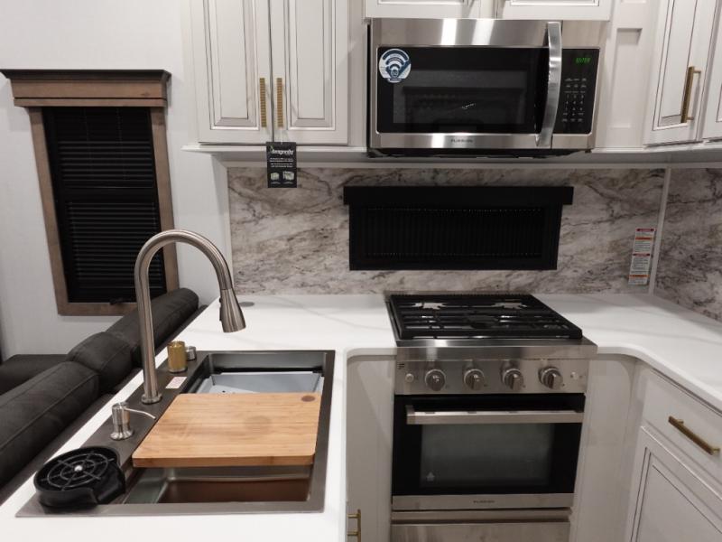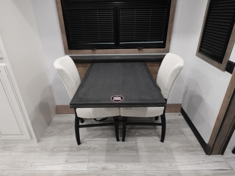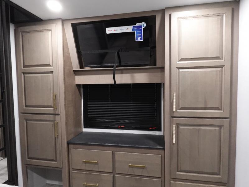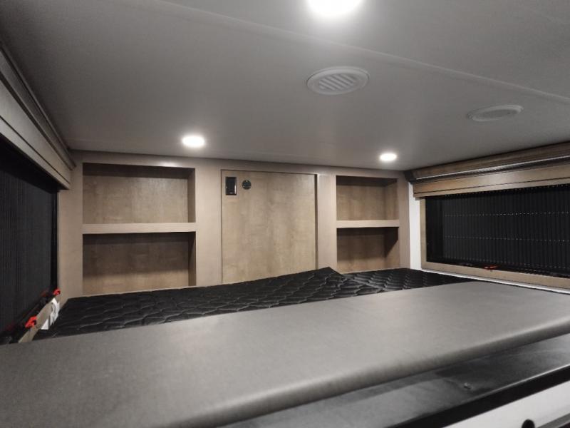 Traveling with friends and family is easier than ever with this fifth wheel in tow! There are two master suites; one for you and one for guests! The front master suite includes a king bed slide out, a front closet with a hamper. There is also convenient underbed storage, a dresser with a Smart HD TV, plus a private entrance into the dual entry bath. Head to the rear master suite to find just as much comfort with a queen bed slide out, dual closets and a dresser, plus a full rear bath where the second entry door is located. There is also a loft area above this room with three bunk mats for more campers! The middle kitchen and living area includes many comforts, like the power theater seating across from the 50" Smart TV and hide-a-bed sofa, plus the U-shaped kitchen with ample counter space and a 24" range.