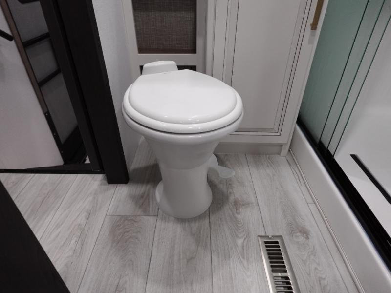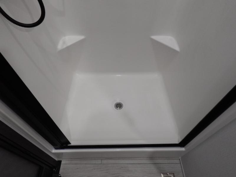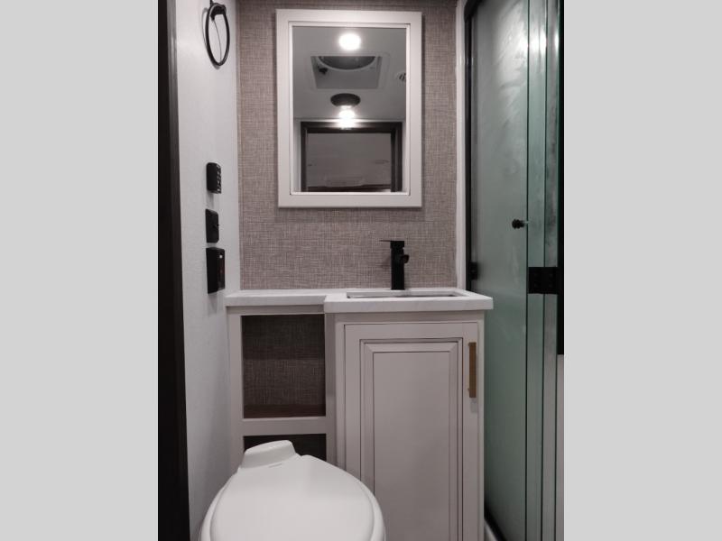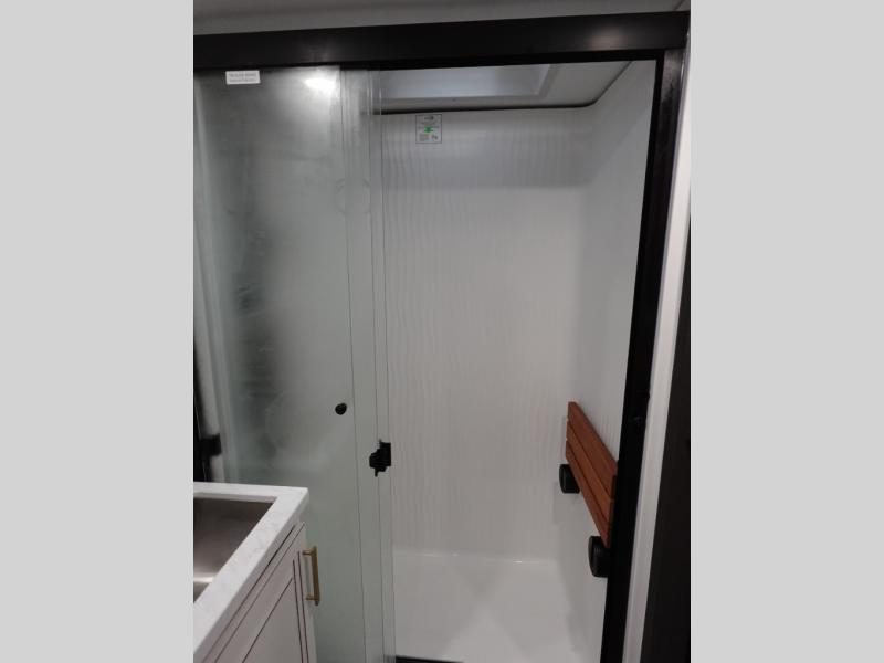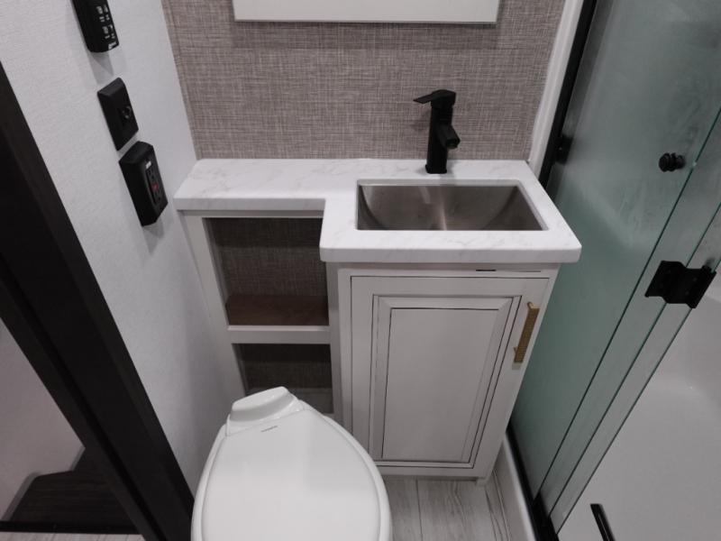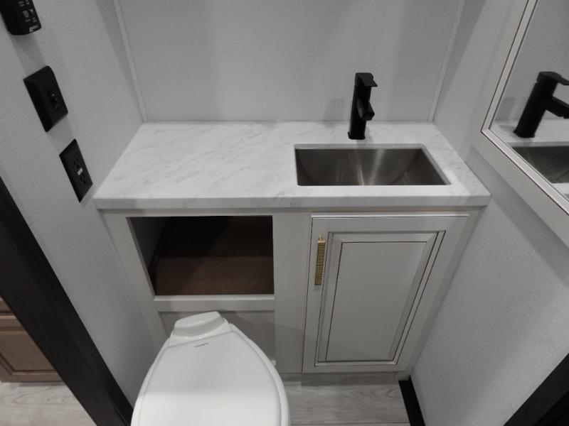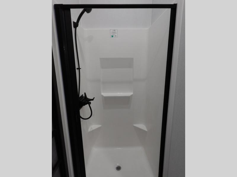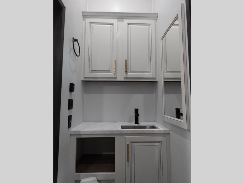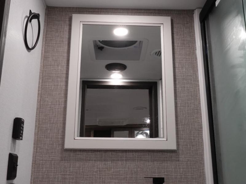 Traveling with friends and family is easier than ever with this fifth wheel in tow! There are two master suites; one for you and one for guests! The front master suite includes a king bed slide out, a front closet with a hamper. There is also convenient underbed storage, a dresser with a Smart HD TV, plus a private entrance into the dual entry bath. Head to the rear master suite to find just as much comfort with a queen bed slide out, dual closets and a dresser, plus a full rear bath where the second entry door is located. There is also a loft area above this room with three bunk mats for more campers! The middle kitchen and living area includes many comforts, like the power theater seating across from the 50" Smart TV and hide-a-bed sofa, plus the U-shaped kitchen with ample counter space and a 24" range.