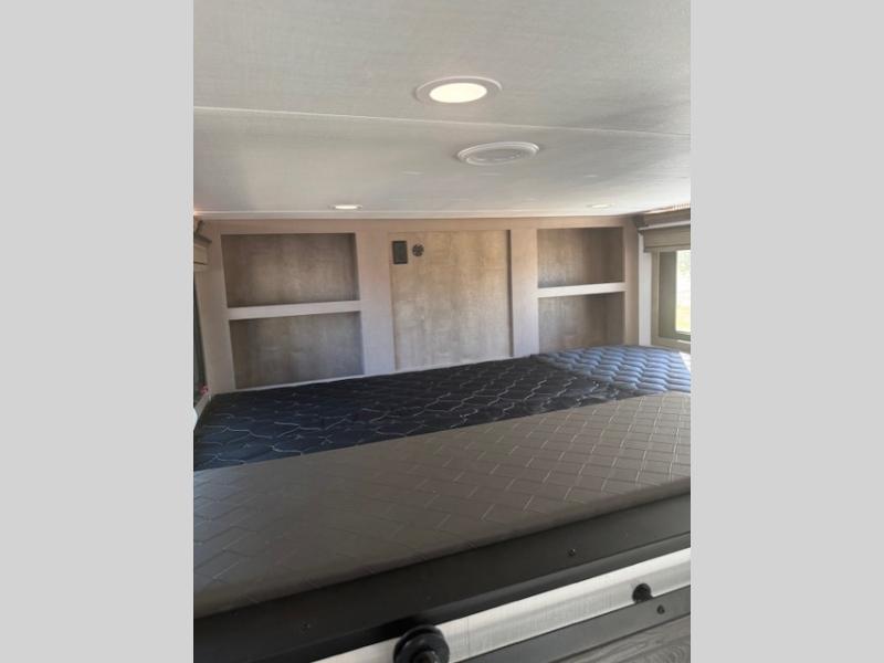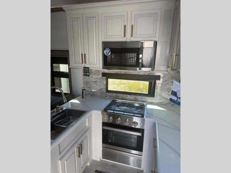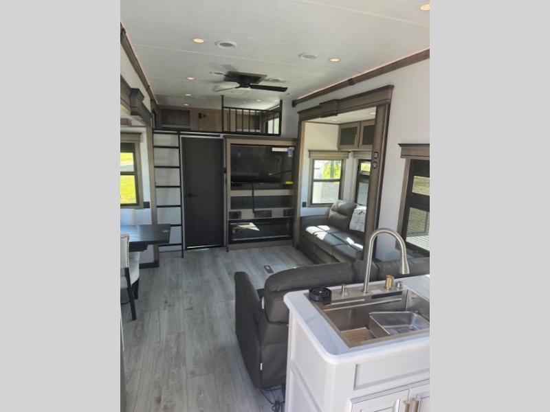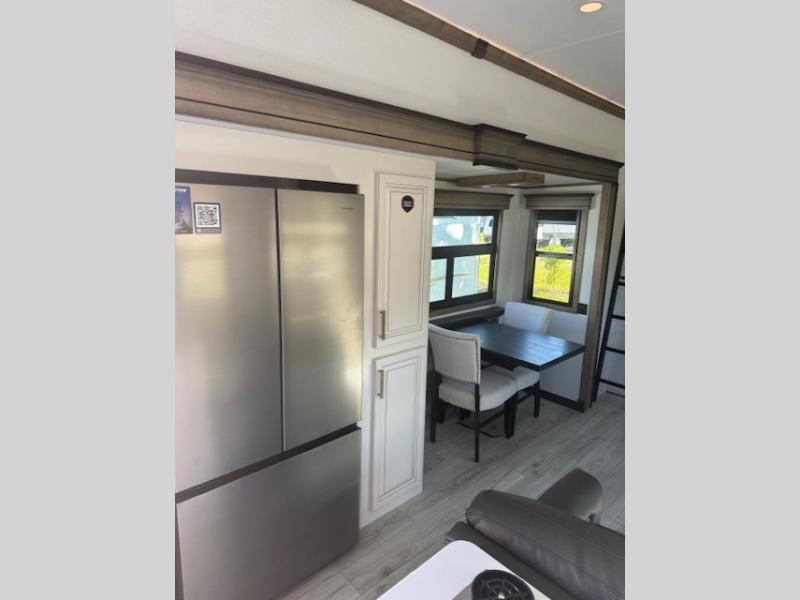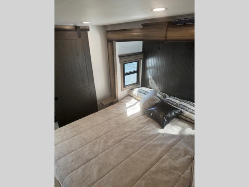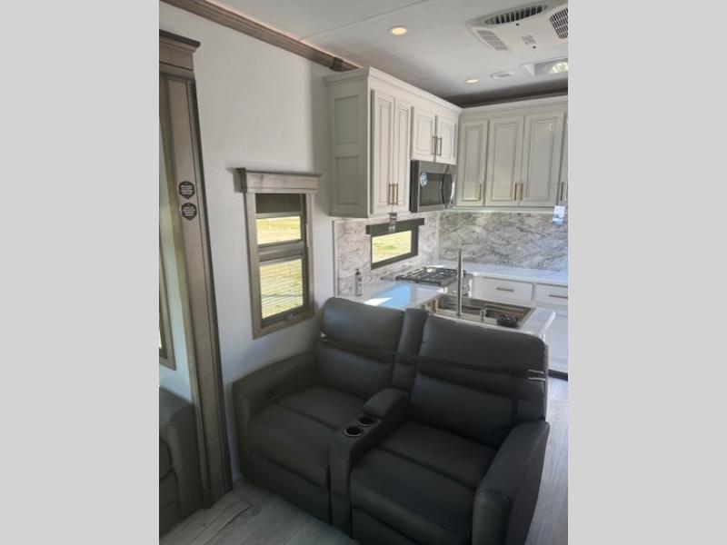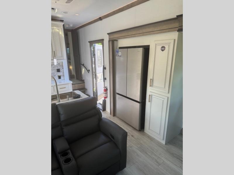 Traveling with friends and family is easier than ever with this fifth wheel in tow! There are two master suites; one for you and one for guests! The front master suite includes a king bed slide out, a front closet with a hamper, plus stackable washer/dryer prep if you want the option to make wash day easier. There is also convenient underbed storage, a dresser with a Smart HD TV, plus a private entrance into the dual entry bath. Head to the rear master suite to find just as much comfort with a queen bed slide out, dual closets and a dresser, plus a full rear bath where the second entry door is located. There is also a loft area above this room with three bunk mats for more campers! The middle kitchen and living area includes many comforts, like the power theater seating across from the 50" Smart TV and hide-a-bed sofa, plus the U-shaped kitchen with ample counter space and a 24" range. You'll also find food storage in the pantry and 18 cu. ft. residential refrigerator with an ice maker, or you can choose the slightly larger optional 20 cu. ft. refrigerator!