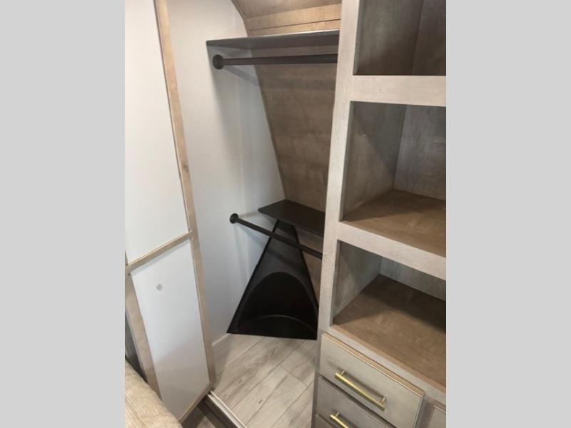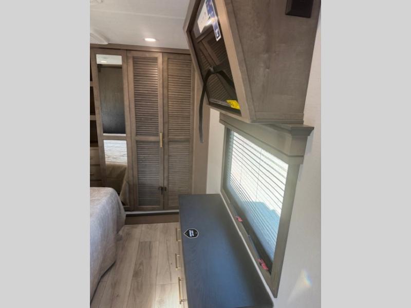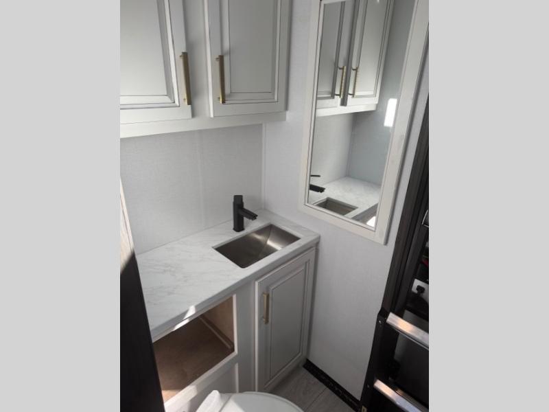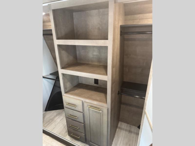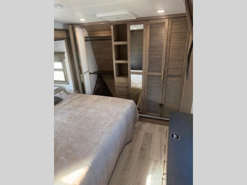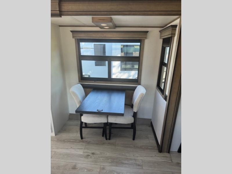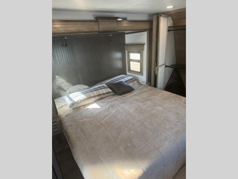 Traveling with friends and family is easier than ever with this fifth wheel in tow! There are two master suites; one for you and one for guests! The front master suite includes a king bed slide out, a front closet with a hamper, plus stackable washer/dryer prep if you want the option to make wash day easier. There is also convenient underbed storage, a dresser with a Smart HD TV, plus a private entrance into the dual entry bath. Head to the rear master suite to find just as much comfort with a queen bed slide out, dual closets and a dresser, plus a full rear bath where the second entry door is located. There is also a loft area above this room with three bunk mats for more campers! The middle kitchen and living area includes many comforts, like the power theater seating across from the 50" Smart TV and hide-a-bed sofa, plus the U-shaped kitchen with ample counter space and a 24" range. You'll also find food storage in the pantry and 18 cu. ft. residential refrigerator with an ice maker, or you can choose the slightly larger optional 20 cu. ft. refrigerator!