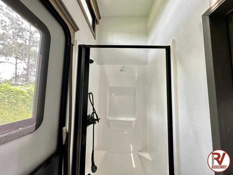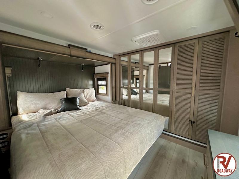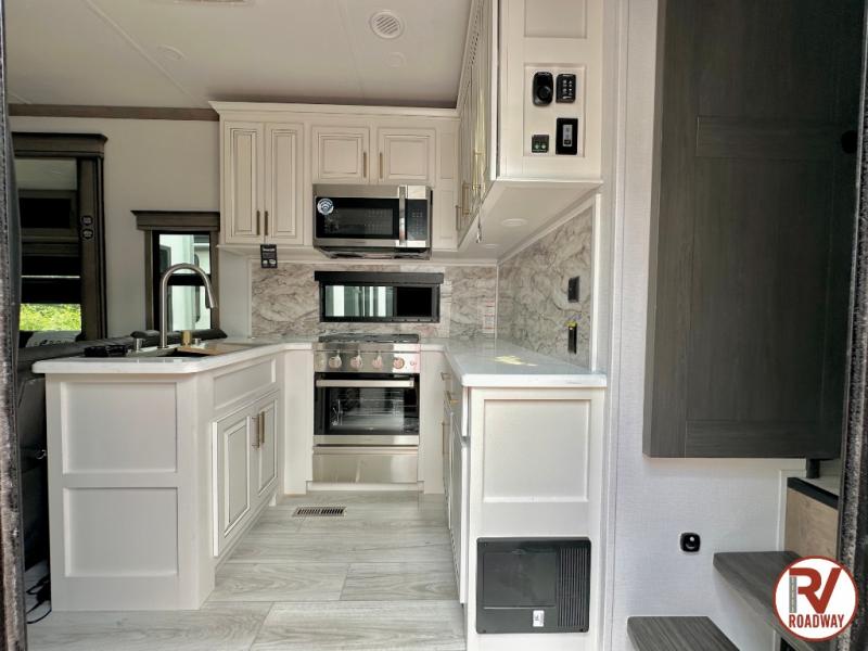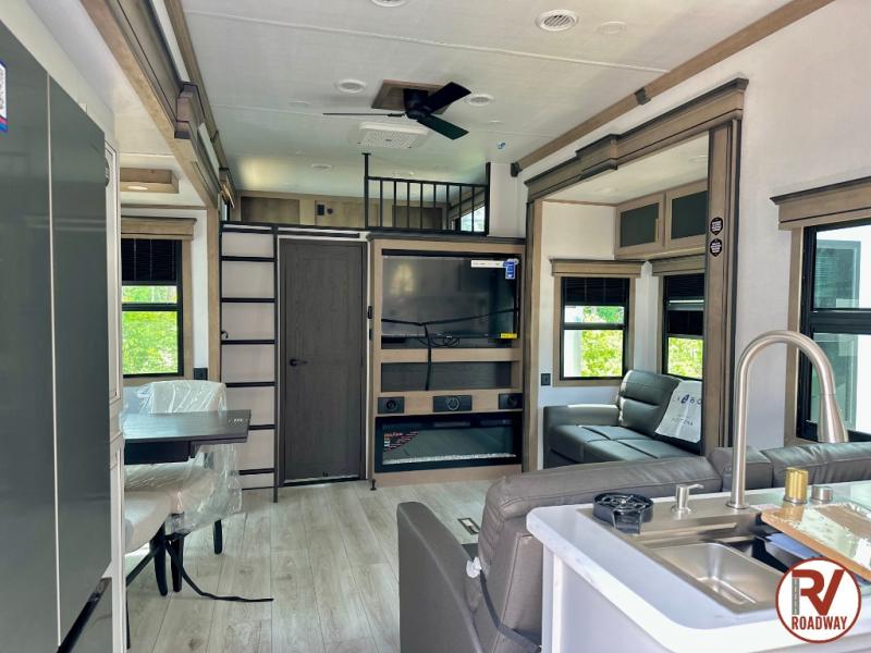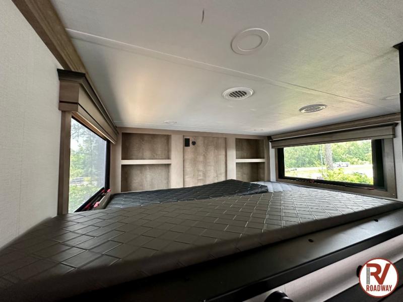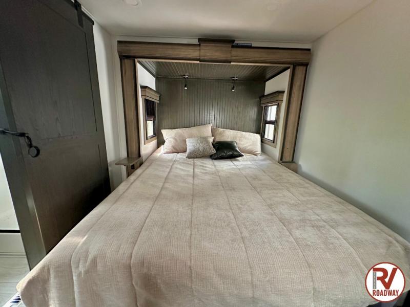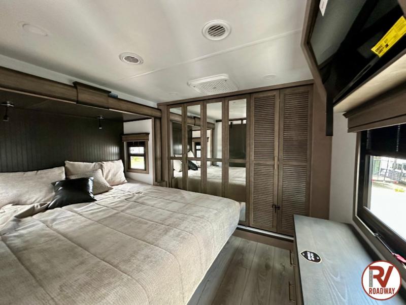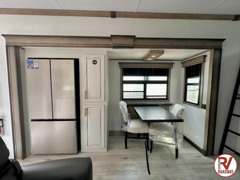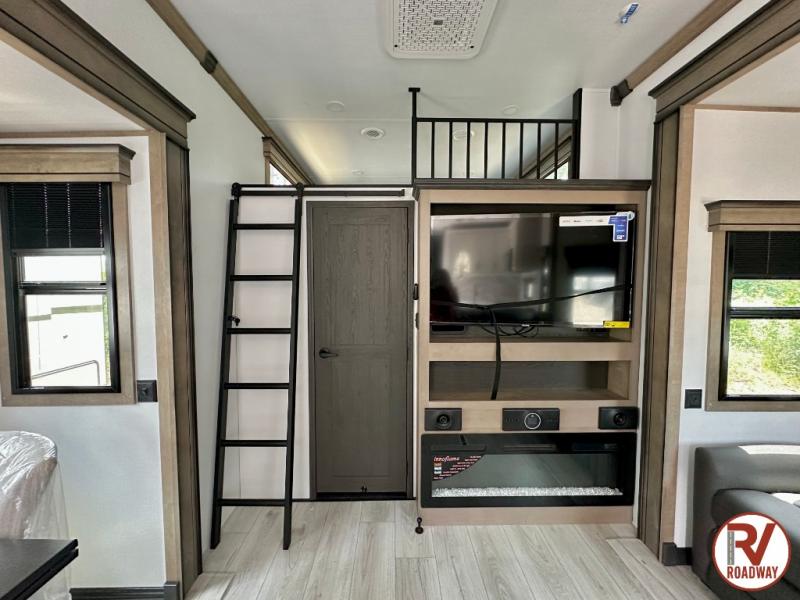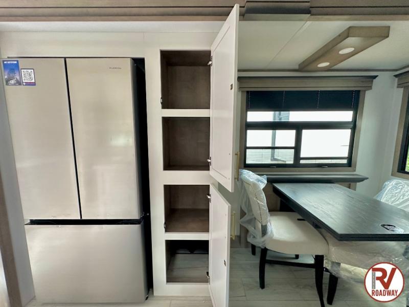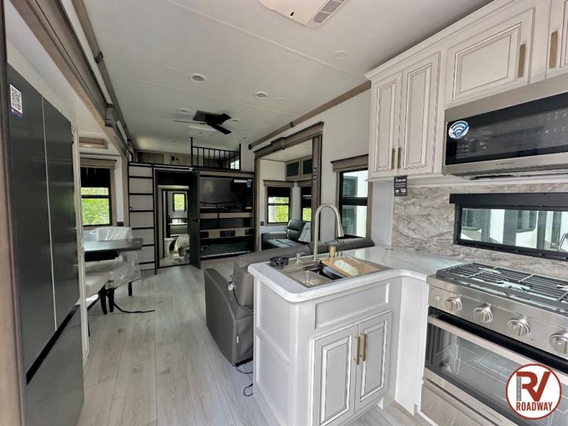 Traveling with friends and family is easier than ever with this fifth wheel in tow! There are two master suites; one for you and one for guests! The front master suite includes a king bed slide out, a front closet with a hamper, plus stackable washer/dryer prep if you want the option to make wash day easier. There is also convenient underbed storage, a dresser with a Smart HD TV, plus a private entrance into the dual entry bath. Head to the rear master suite to find just as much comfort with a queen bed slide out, dual closets and a dresser, plus a full rear bath where the second entry door is located. There is also a loft area above this room with three bunk mats for more campers! The middle kitchen and living area includes many comforts, like the power theater seating across from the 50" Smart TV and hide-a-bed sofa, plus the U-shaped kitchen with ample counter space and a 24" range. You'll also find food storage in the pantry and 18 cu. ft. residential refrigerator with an ice maker, or you can choose the slightly larger optional 20 cu. ft. refrigerator!