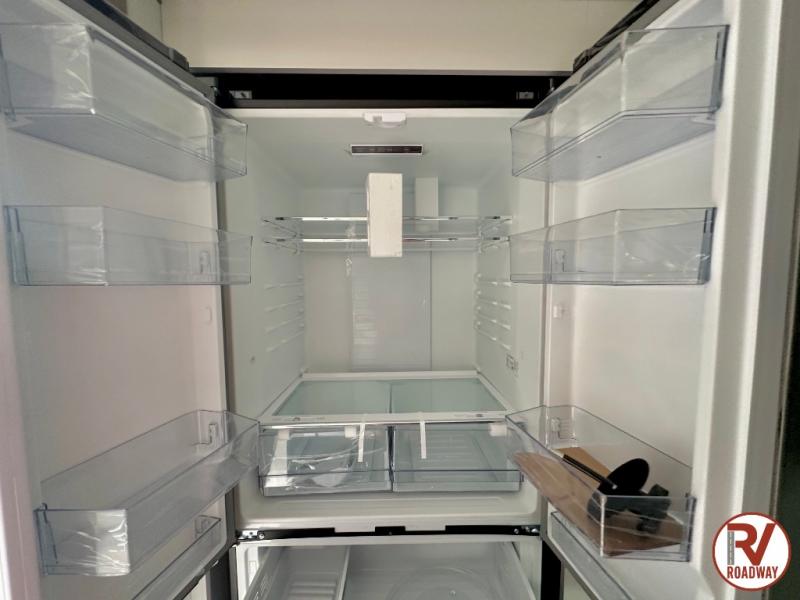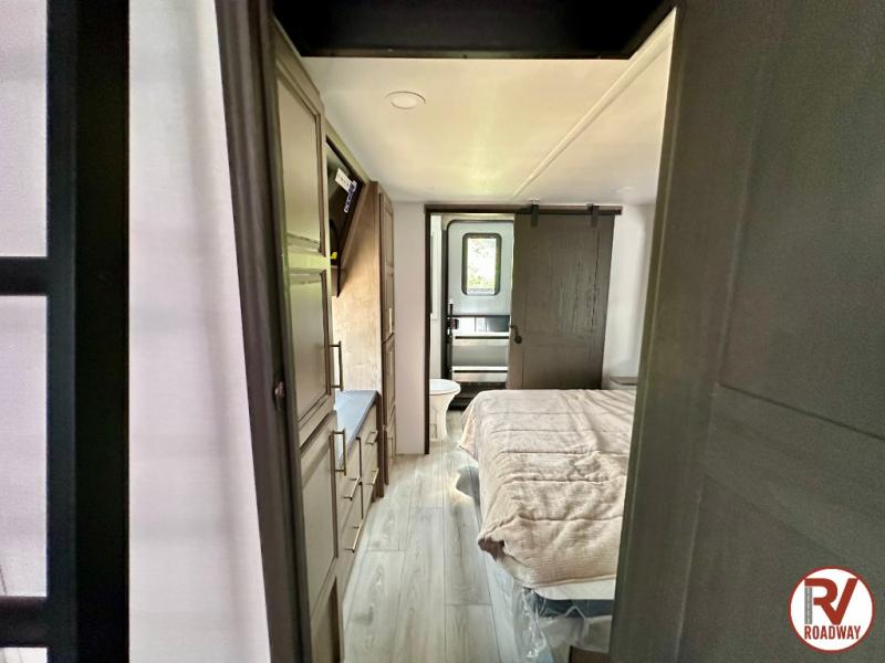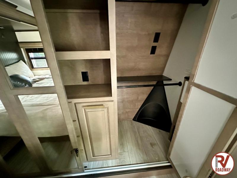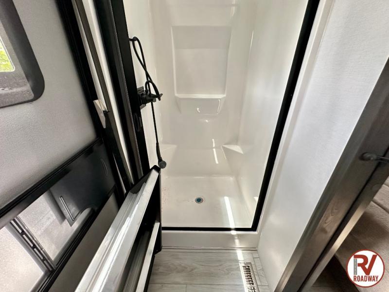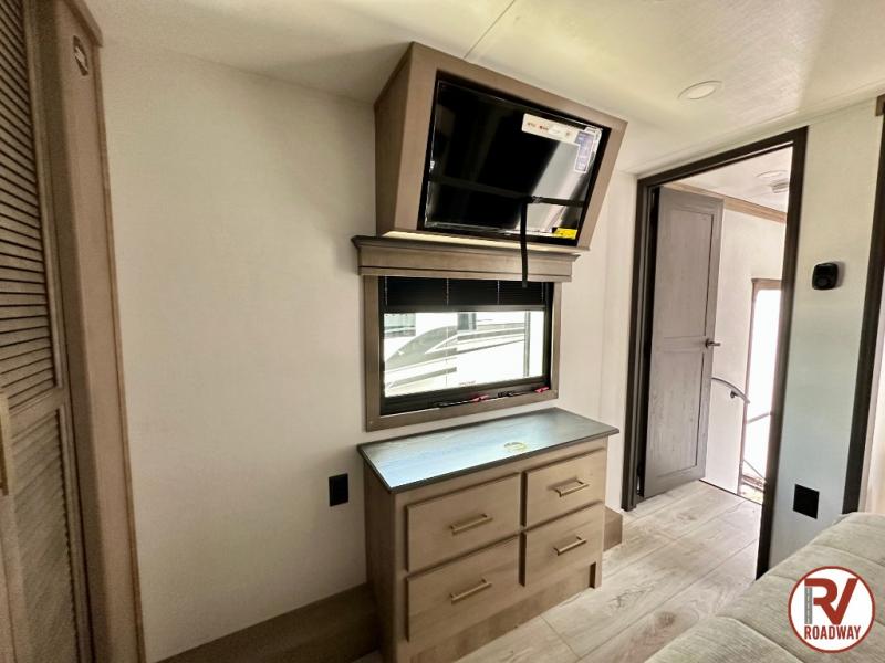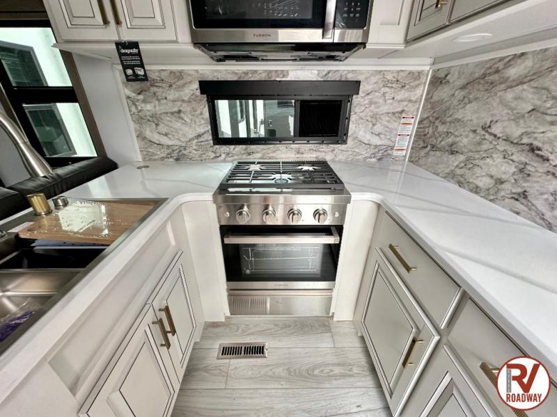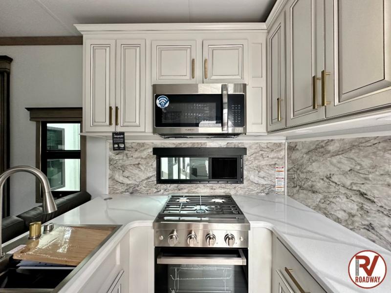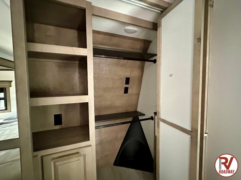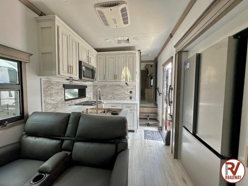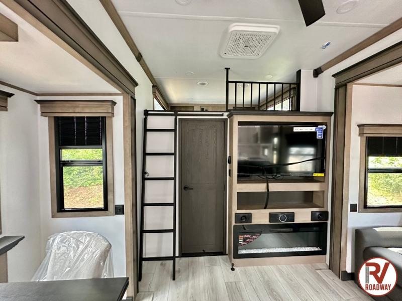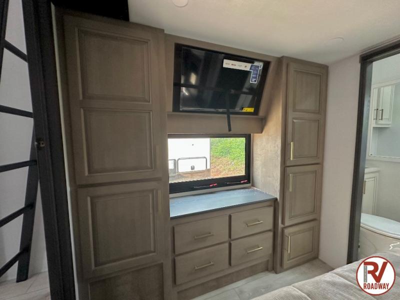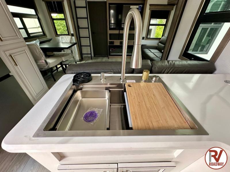 Traveling with friends and family is easier than ever with this fifth wheel in tow! There are two master suites; one for you and one for guests! The front master suite includes a king bed slide out, a front closet with a hamper, plus stackable washer/dryer prep if you want the option to make wash day easier. There is also convenient underbed storage, a dresser with a Smart HD TV, plus a private entrance into the dual entry bath. Head to the rear master suite to find just as much comfort with a queen bed slide out, dual closets and a dresser, plus a full rear bath where the second entry door is located. There is also a loft area above this room with three bunk mats for more campers! The middle kitchen and living area includes many comforts, like the power theater seating across from the 50" Smart TV and hide-a-bed sofa, plus the U-shaped kitchen with ample counter space and a 24" range. You'll also find food storage in the pantry and 18 cu. ft. residential refrigerator with an ice maker, or you can choose the slightly larger optional 20 cu. ft. refrigerator!
