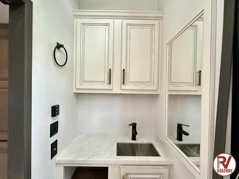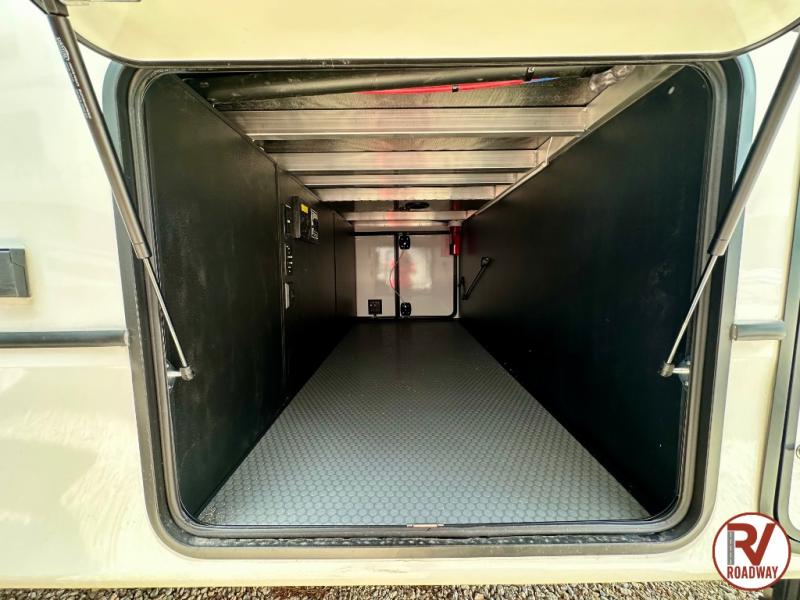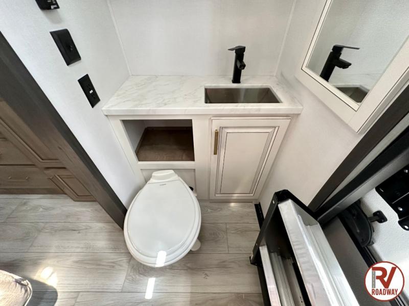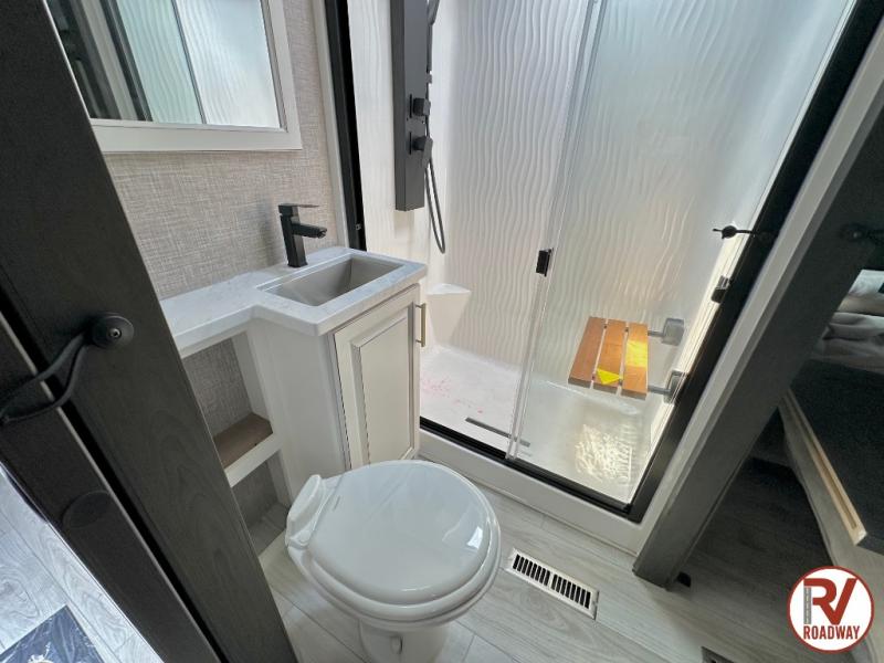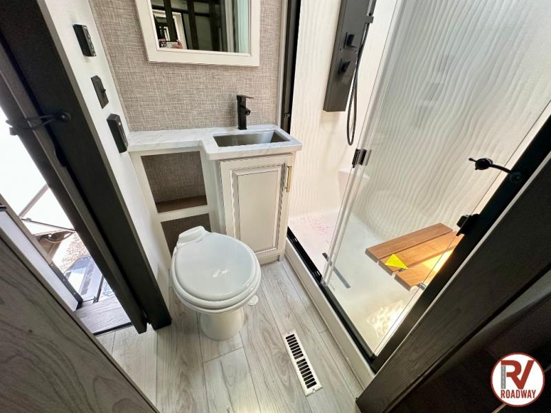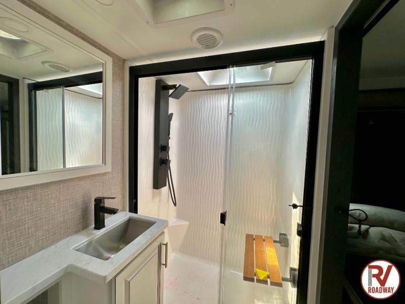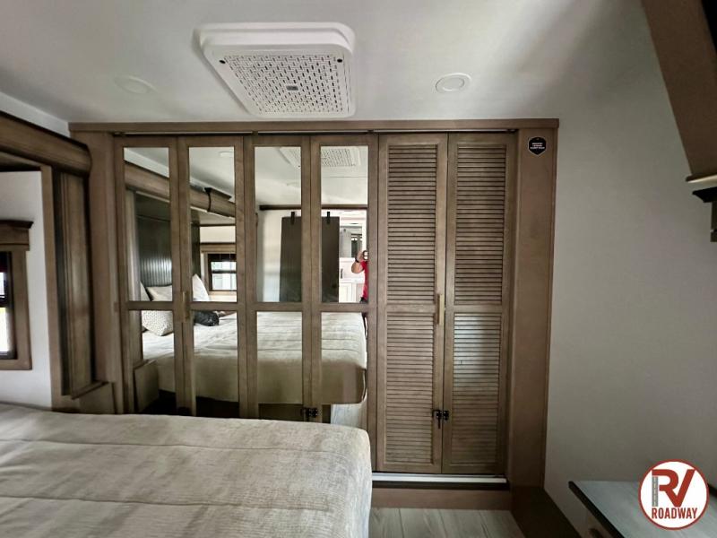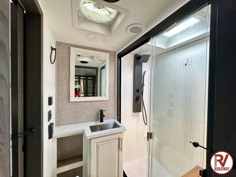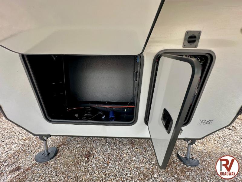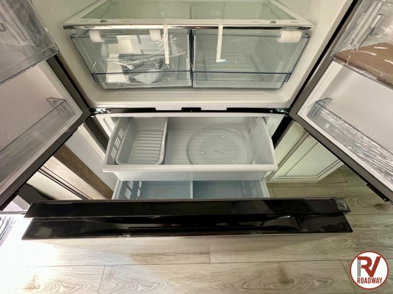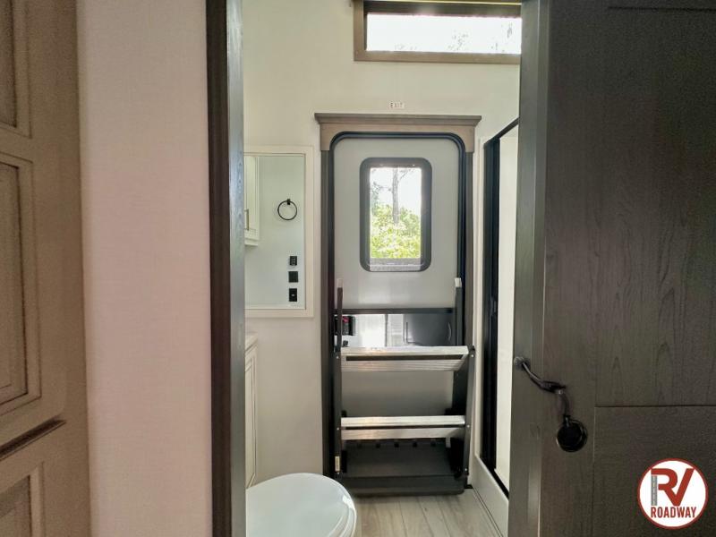 Traveling with friends and family is easier than ever with this fifth wheel in tow! There are two master suites; one for you and one for guests! The front master suite includes a king bed slide out, a front closet with a hamper, plus stackable washer/dryer prep if you want the option to make wash day easier. There is also convenient underbed storage, a dresser with a Smart HD TV, plus a private entrance into the dual entry bath. Head to the rear master suite to find just as much comfort with a queen bed slide out, dual closets and a dresser, plus a full rear bath where the second entry door is located. There is also a loft area above this room with three bunk mats for more campers! The middle kitchen and living area includes many comforts, like the power theater seating across from the 50" Smart TV and hide-a-bed sofa, plus the U-shaped kitchen with ample counter space and a 24" range. You'll also find food storage in the pantry and 18 cu. ft. residential refrigerator with an ice maker, or you can choose the slightly larger optional 20 cu. ft. refrigerator!