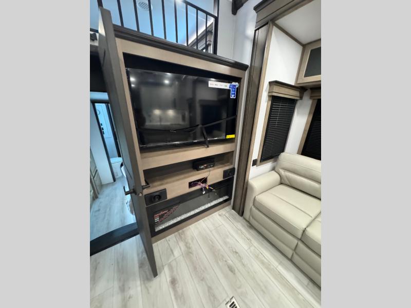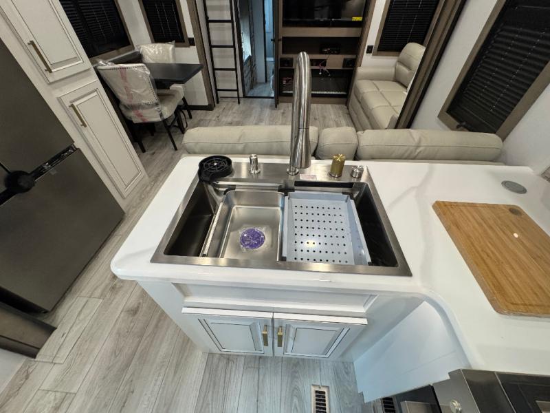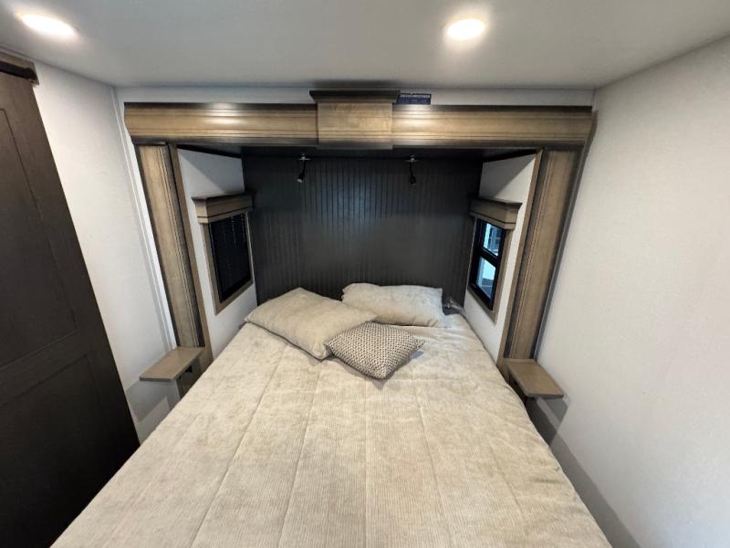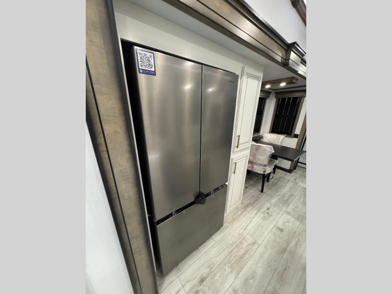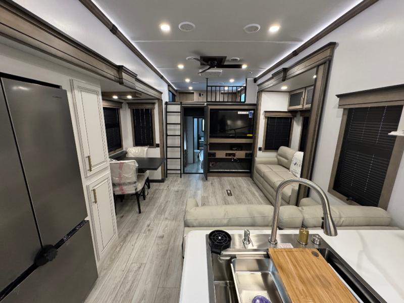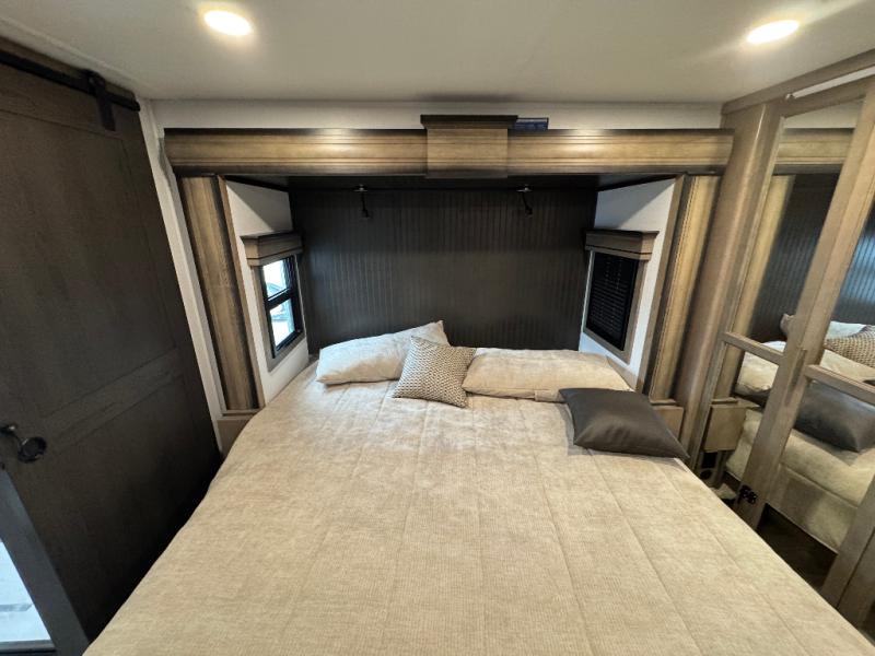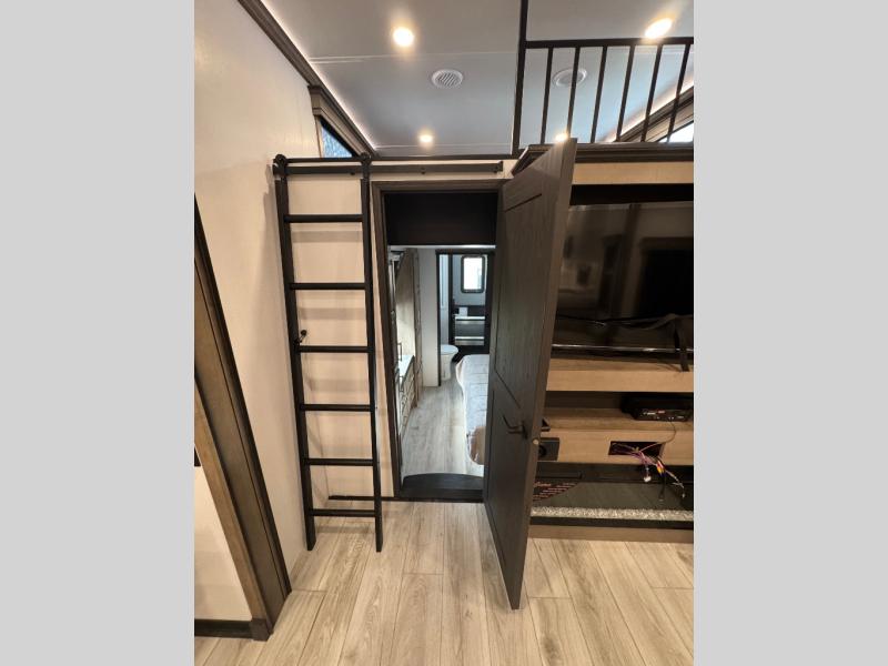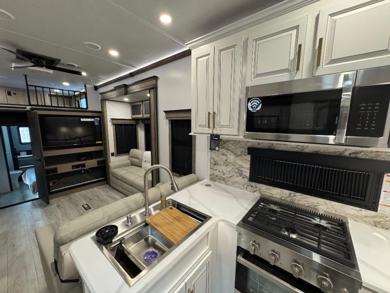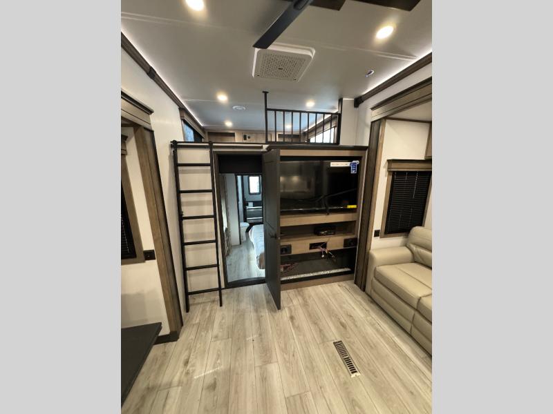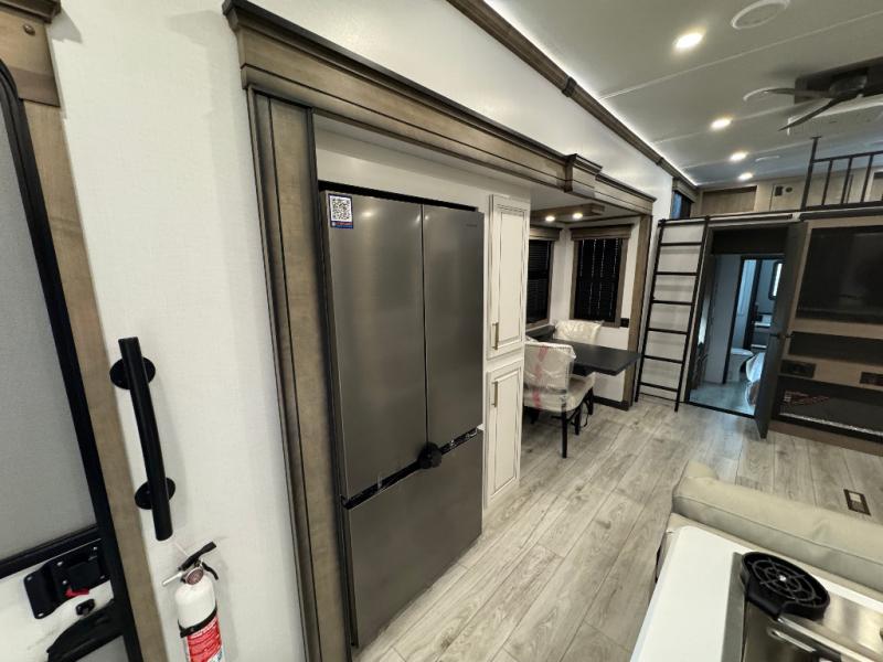 Traveling with friends and family is easier than ever with this fifth wheel in tow! There are two master suites; one for you and one for guests! The front master suite includes a king bed slide out, a front closet with a hamper, plus stackable washer/dryer prep if you want the option to make wash day easier. There is also convenient underbed storage, a dresser with a Smart HD TV, plus a private entrance into the dual entry bath. Head to the rear master suite to find just as much comfort with a queen bed slide out, dual closets and a dresser, plus a full rear bath where the second entry door is located. There is also a loft area above this room with three bunk mats for more campers! The middle kitchen and living area includes many comforts, like the power theater seating across from the 50" Smart TV and hide-a-bed sofa, plus the U-shaped kitchen with ample counter space and a 24" range. You'll also find food storage in the pantry and 18 cu. ft. residential refrigerator with an ice maker, or you can choose the slightly larger optional 20 cu. ft. refrigerator!